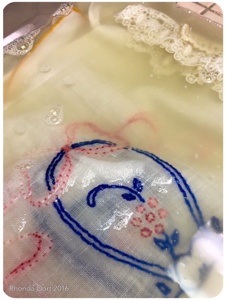 Beading is simply this: threaded needle up through the fabric, pick up a bead or 2 or 3 and send your needle back down through the fabric. I do not knot the thread after each bead, you’re not creating a utility piece but rather a show piece that will be handled with care. Let your pieces help to determine how and where to bead. By following the flowers in the white trim along the left bottom side I was able to loosely mimic the yellow flowers of the handkerchief. In fact I chose to bead all the flowers in one shade of yellow or another to give the piece consistency.