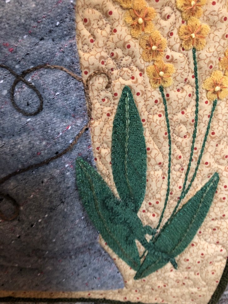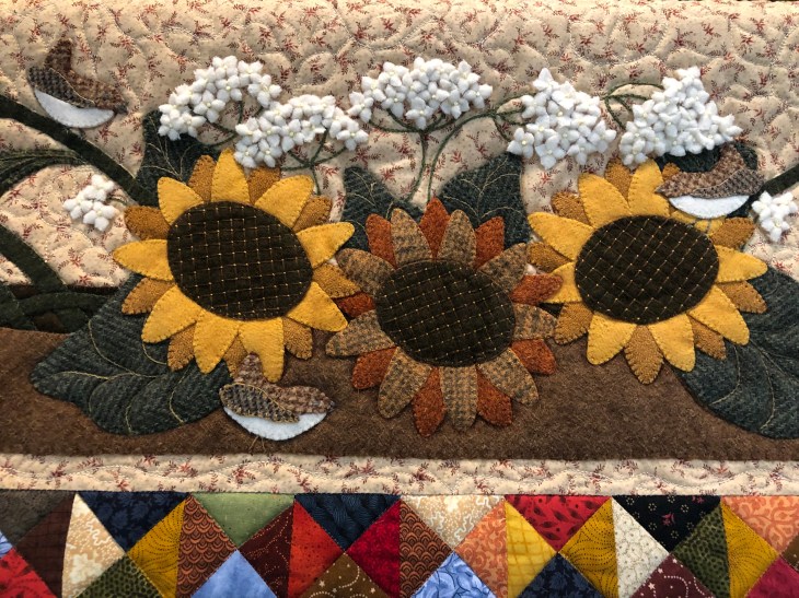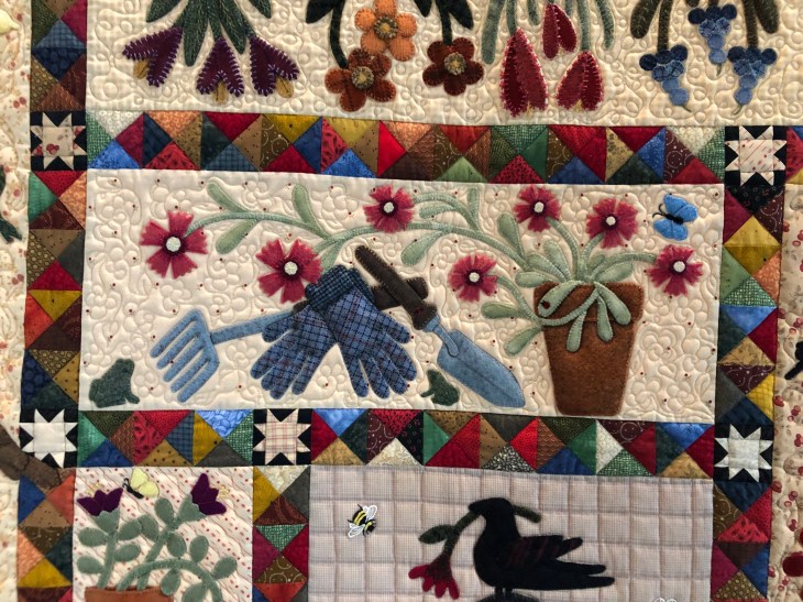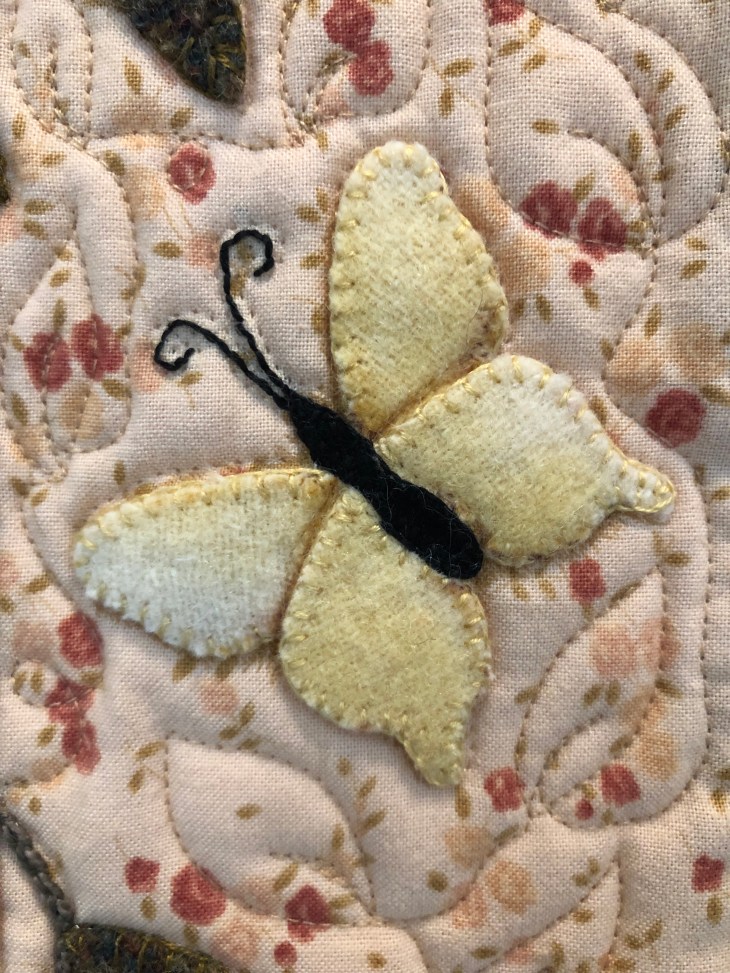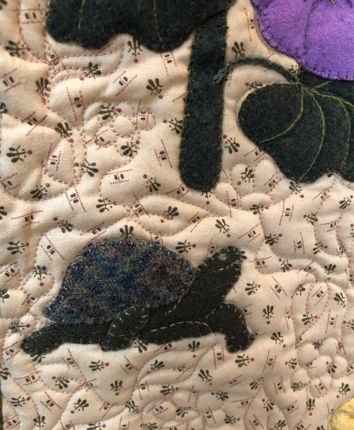 Rhonda, your finished quilt is a masterpiece!! So much glorious detail to be seen. One’s eye could look at this beauty for hours and marvel at all the intricate details. Love all the little critters. The little bird nest is so very sweet, the snail, the birds, the butterflies………..the……………!! Your Primitive Garden Quilt is indeed a triumph!!