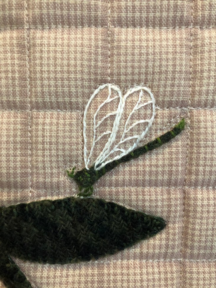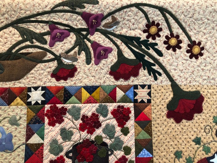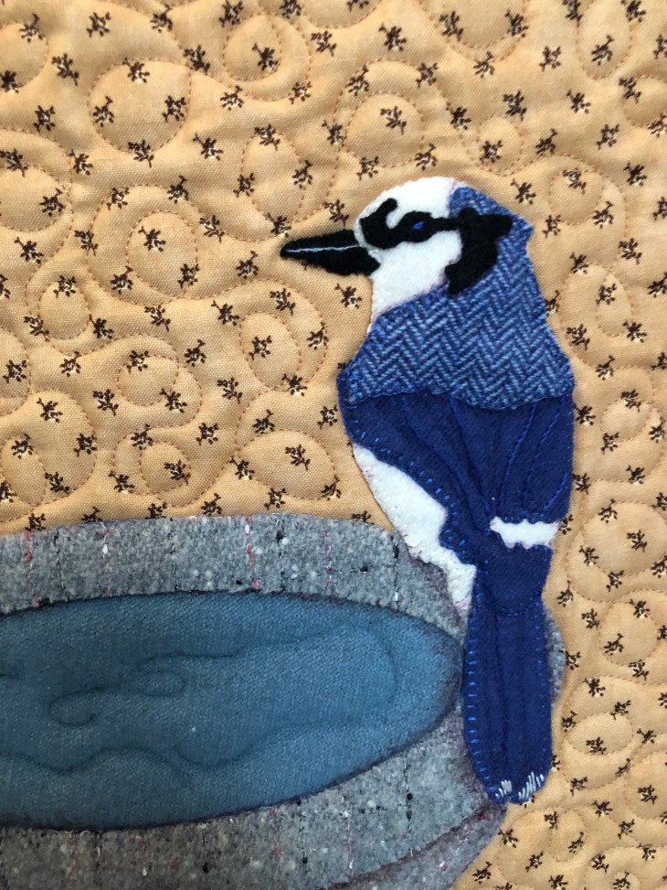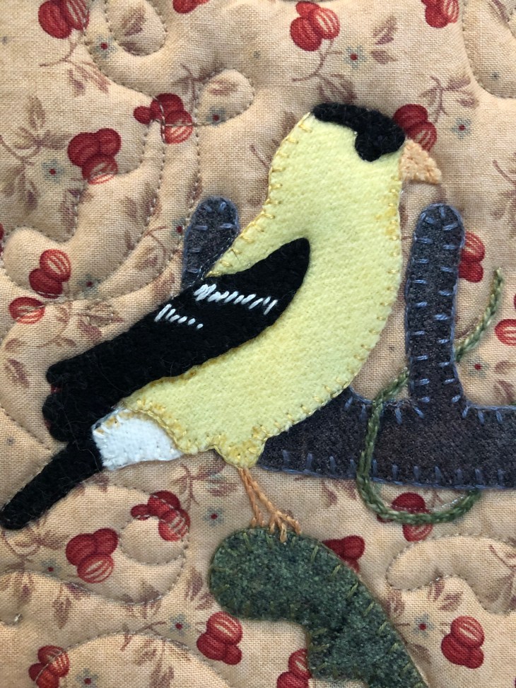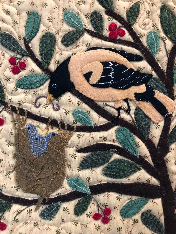Another “tree branch” addition features 2 more House Wrens perched in the right quilt border.