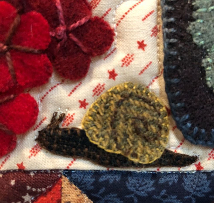 Sorry this pic isn’t clearer, but this is my tiny garden variety snail crawling along the lower edge of the Geranium block.