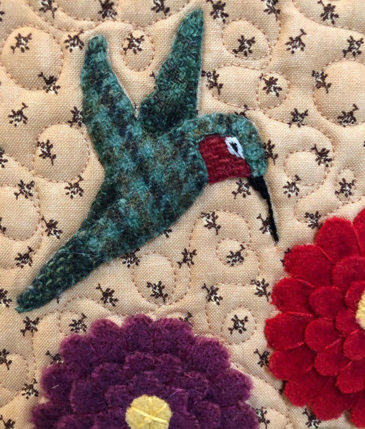 Here’s one of 2 male Ruby Throated hummingbirds flying around in the quilt. This one is finding nourishment amongst the Zinnias.