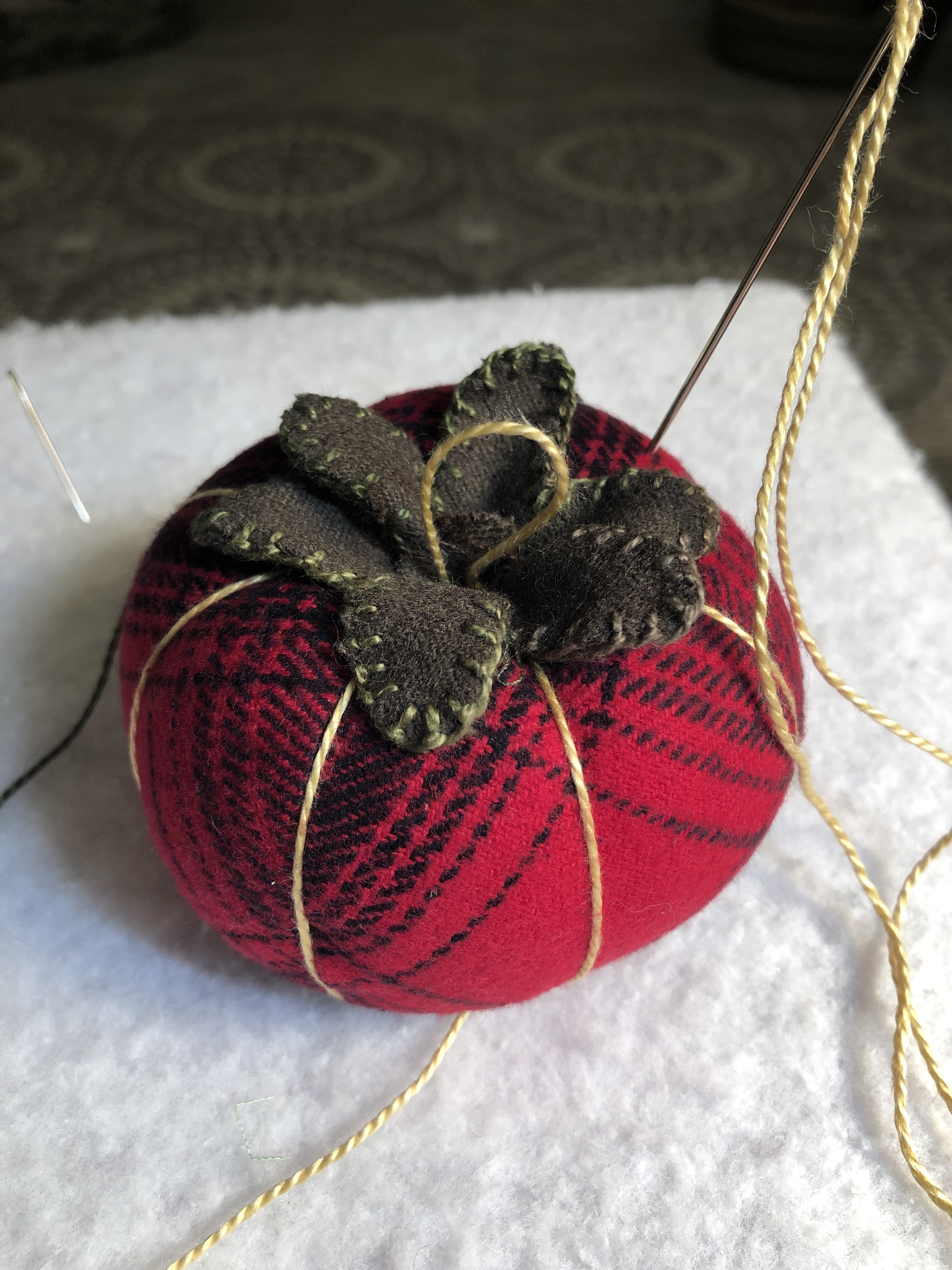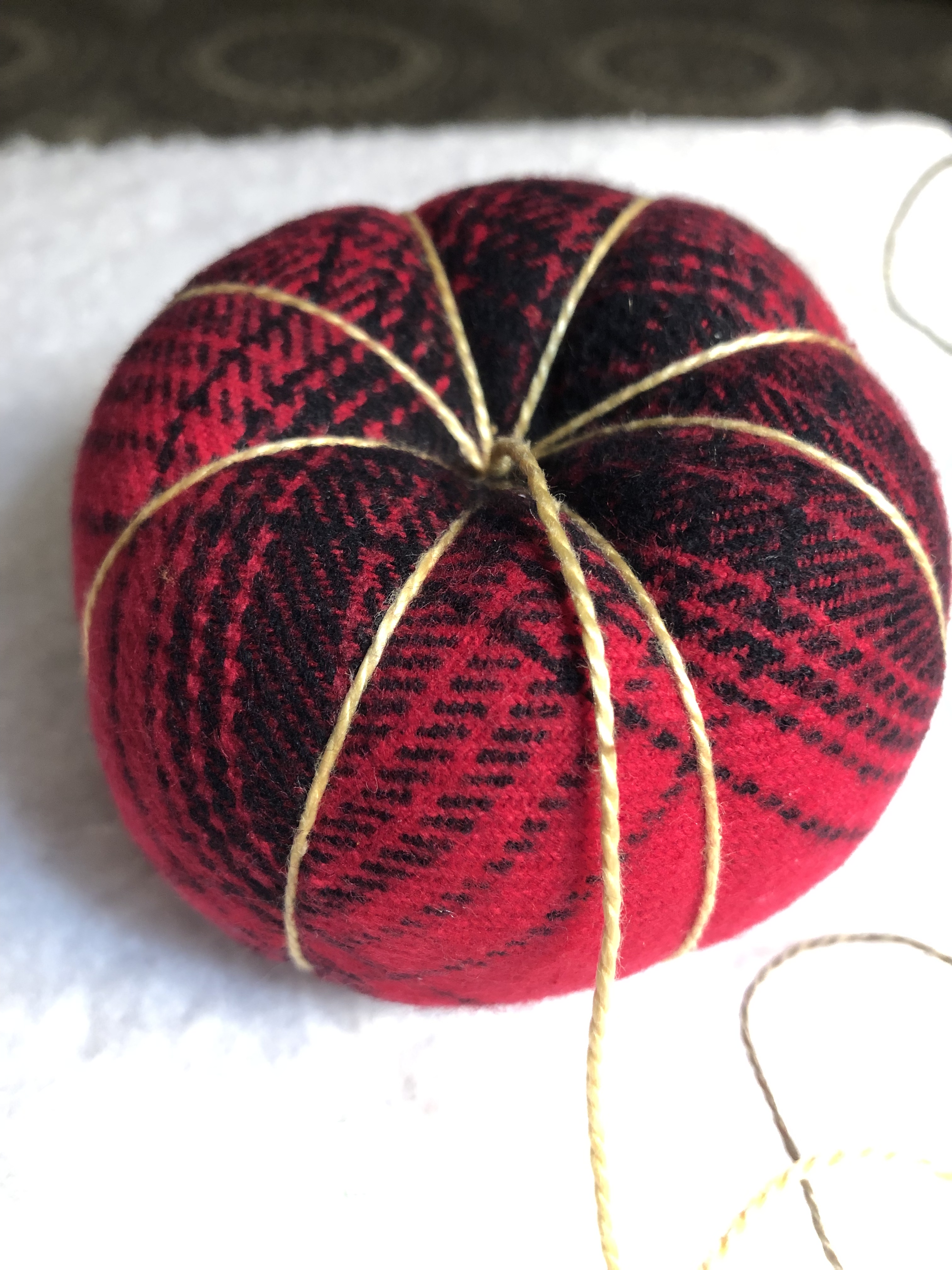 Here’s another tomato in the works, a flannel of red and black. I’m finishing the “wrapping” of the sphere using a nice heavy weight wheat colored Pearl Cotton.