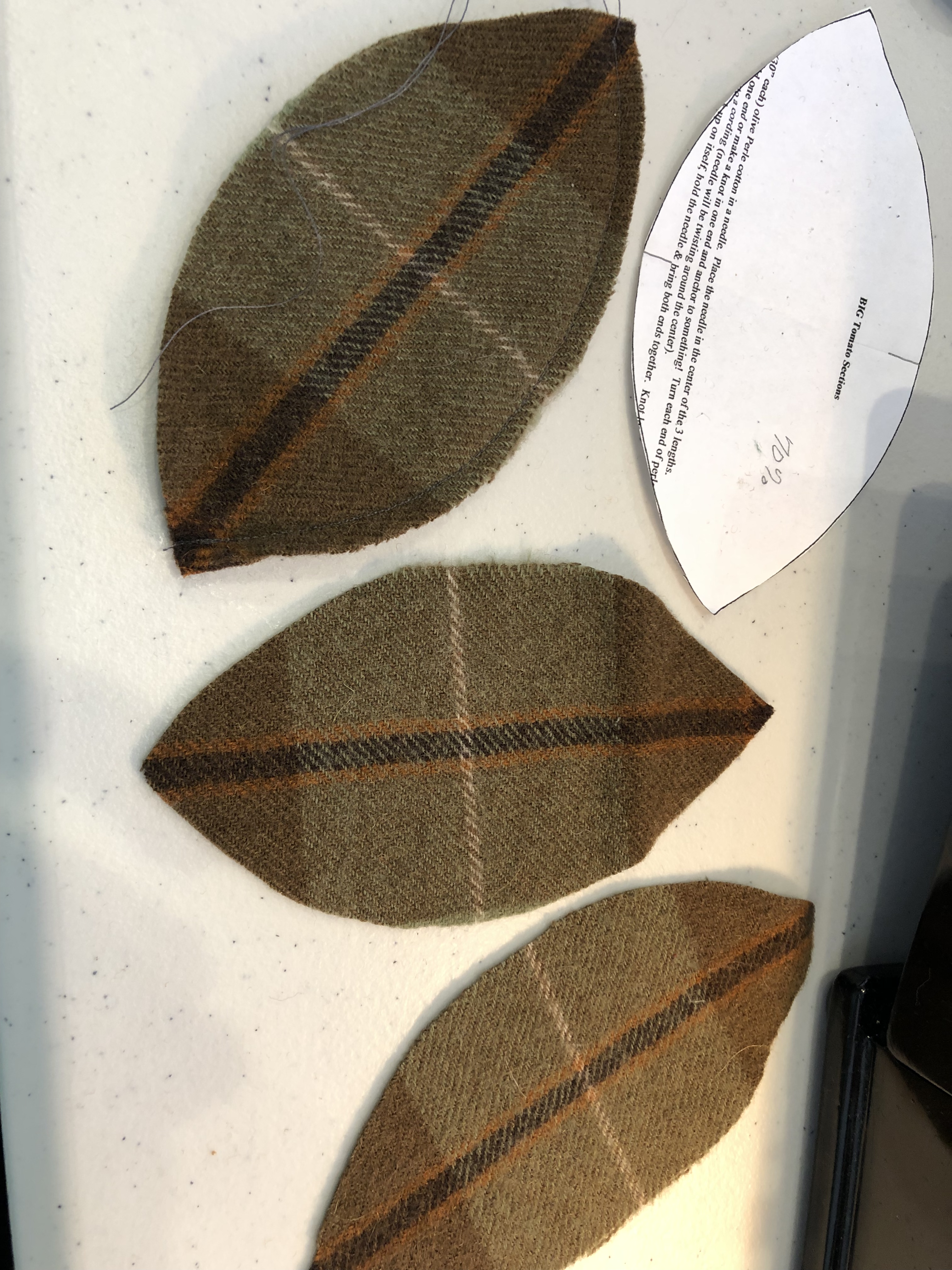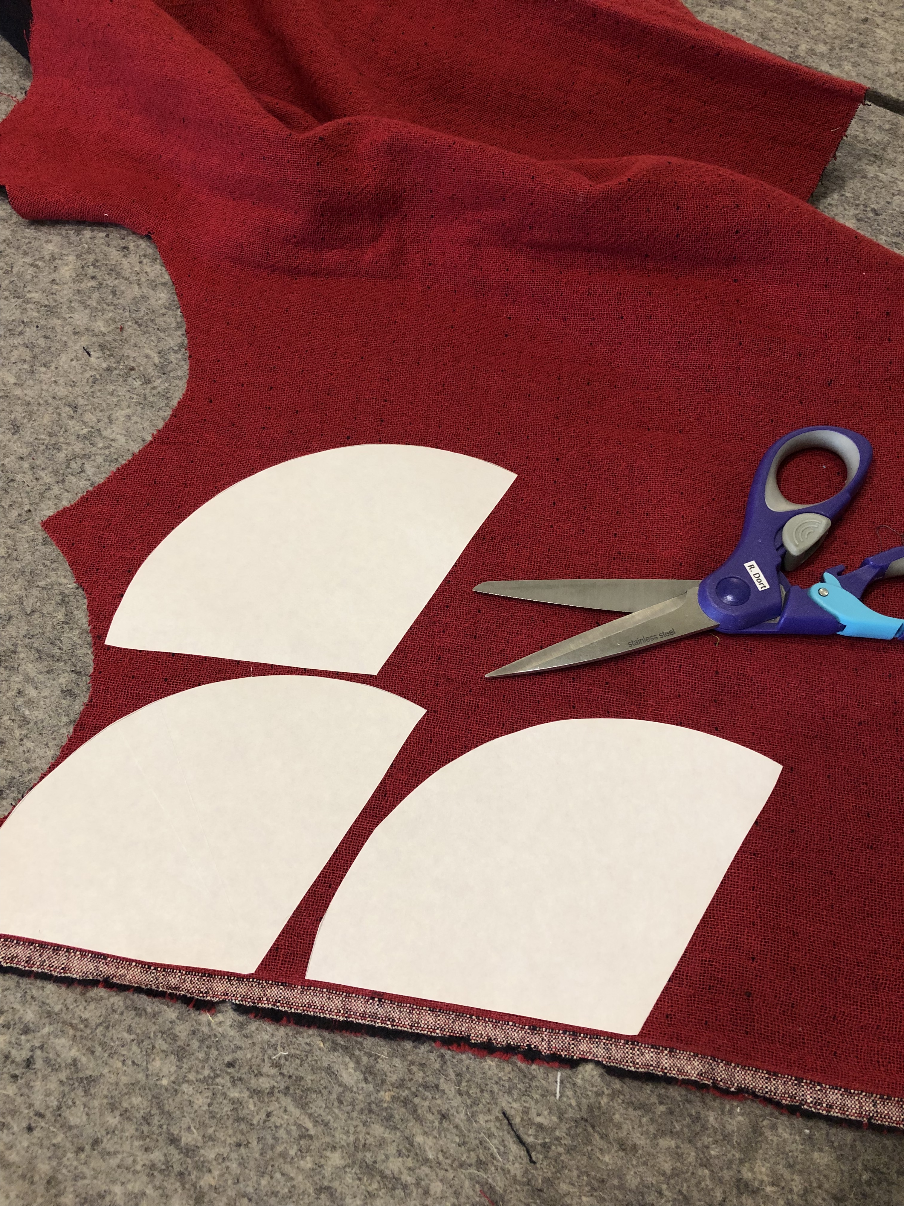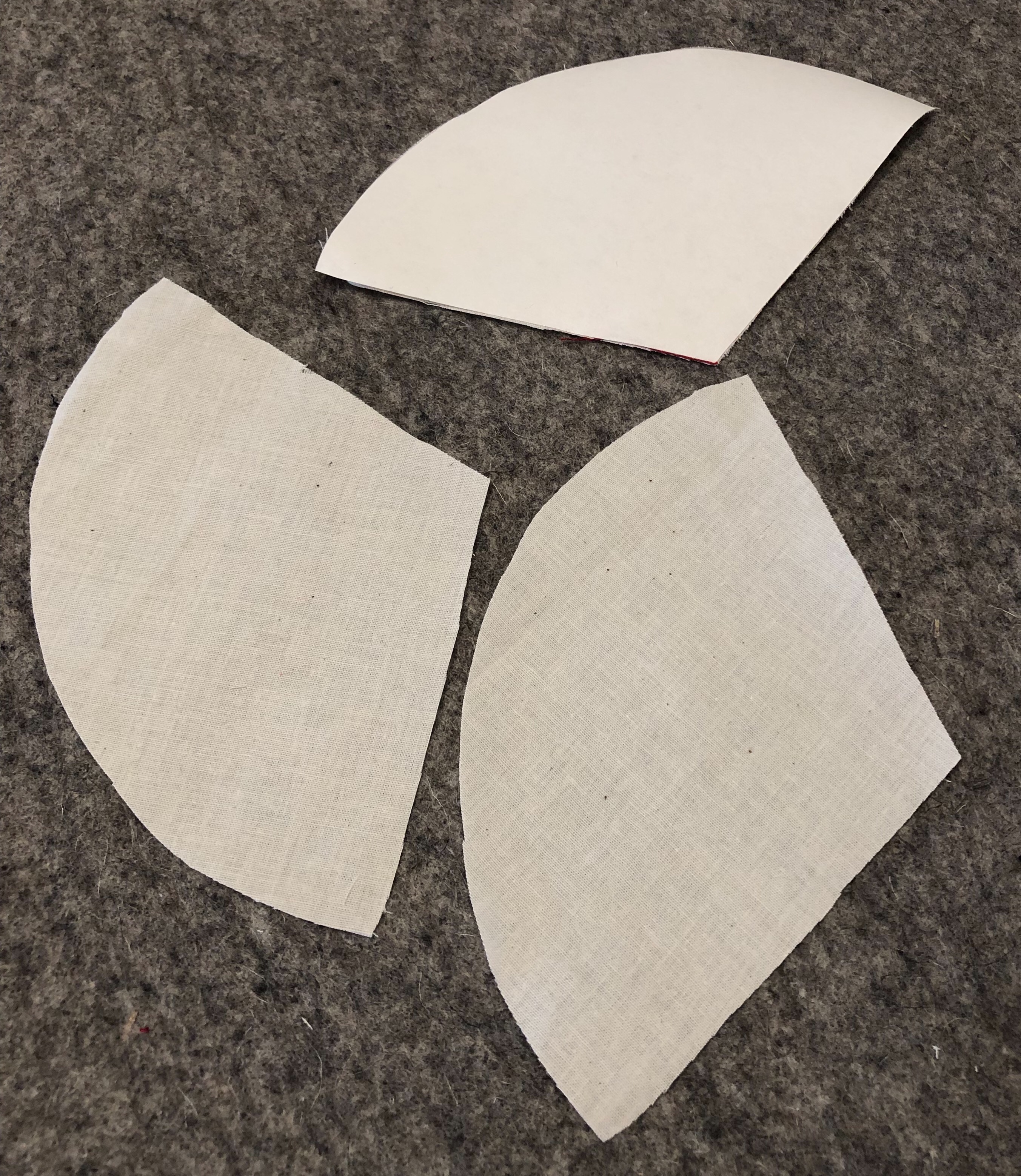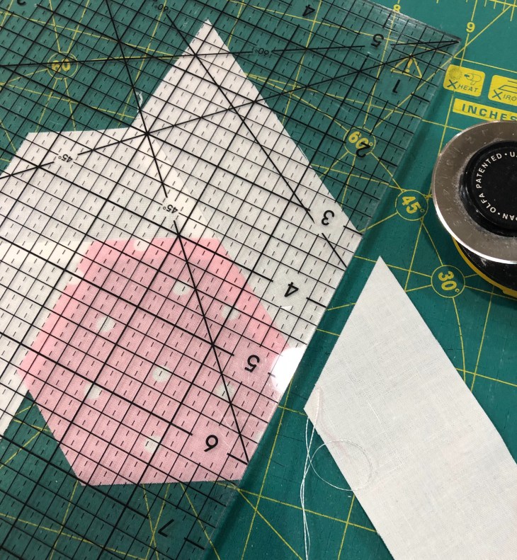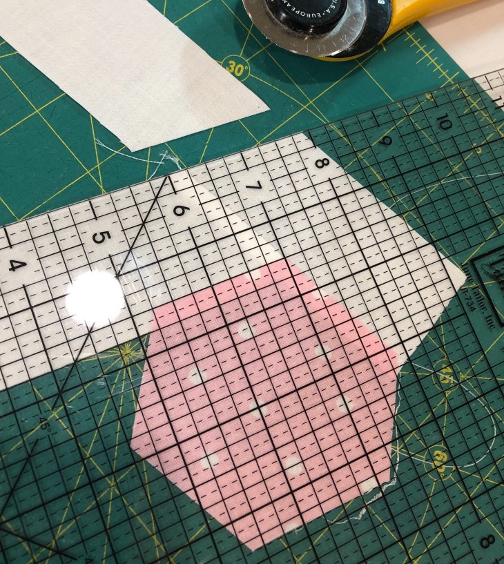 In the example below I’m cutting 3 fan shaped patterns that will make the large (think about 4 1/2″ tip to top) Strawberry pin cushion.