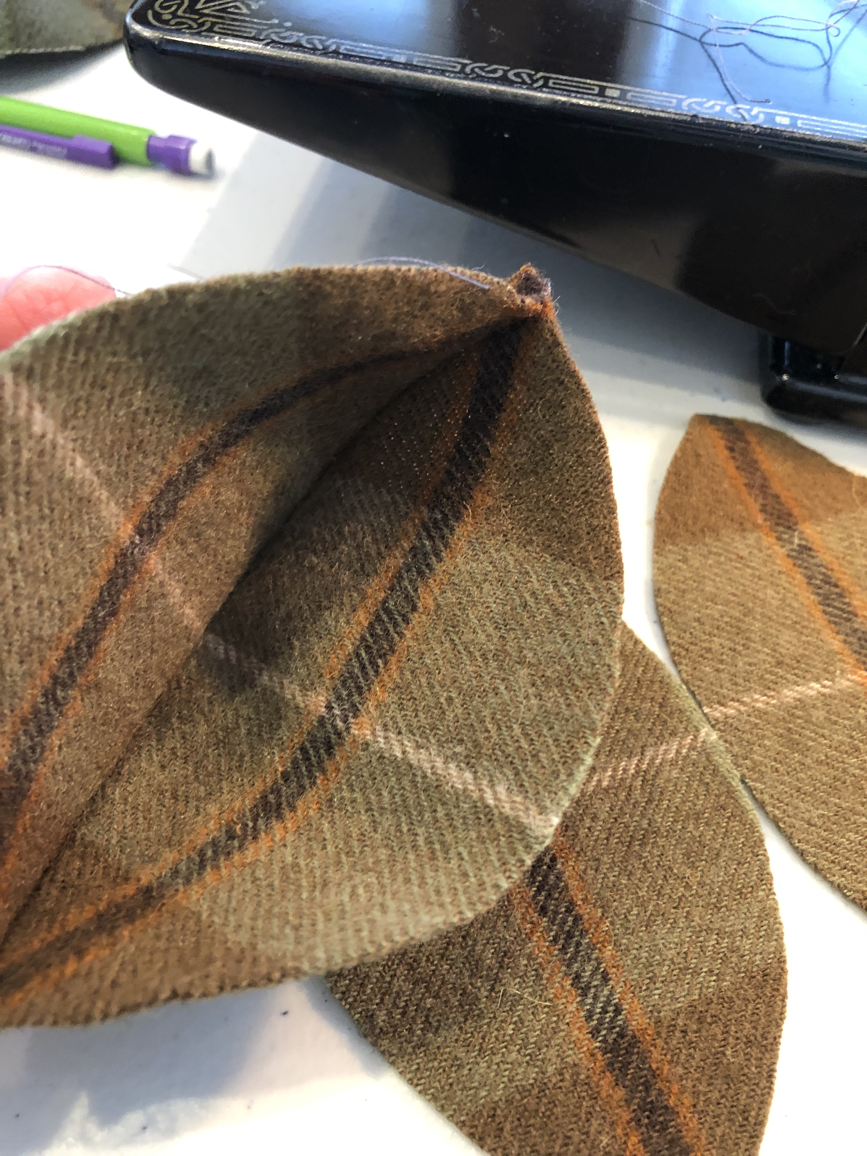 So you cut out 4 football shaped paper pattern pieces. (1 pattern piece cut out 4 times.) I cut the above pieces “on grain” with the fabric weave. It’s always fascinating to fussy cut on the bias each of the pieces so they are exactly the same. They sew up into great visual patterns like the red and blue plaid tomato below.