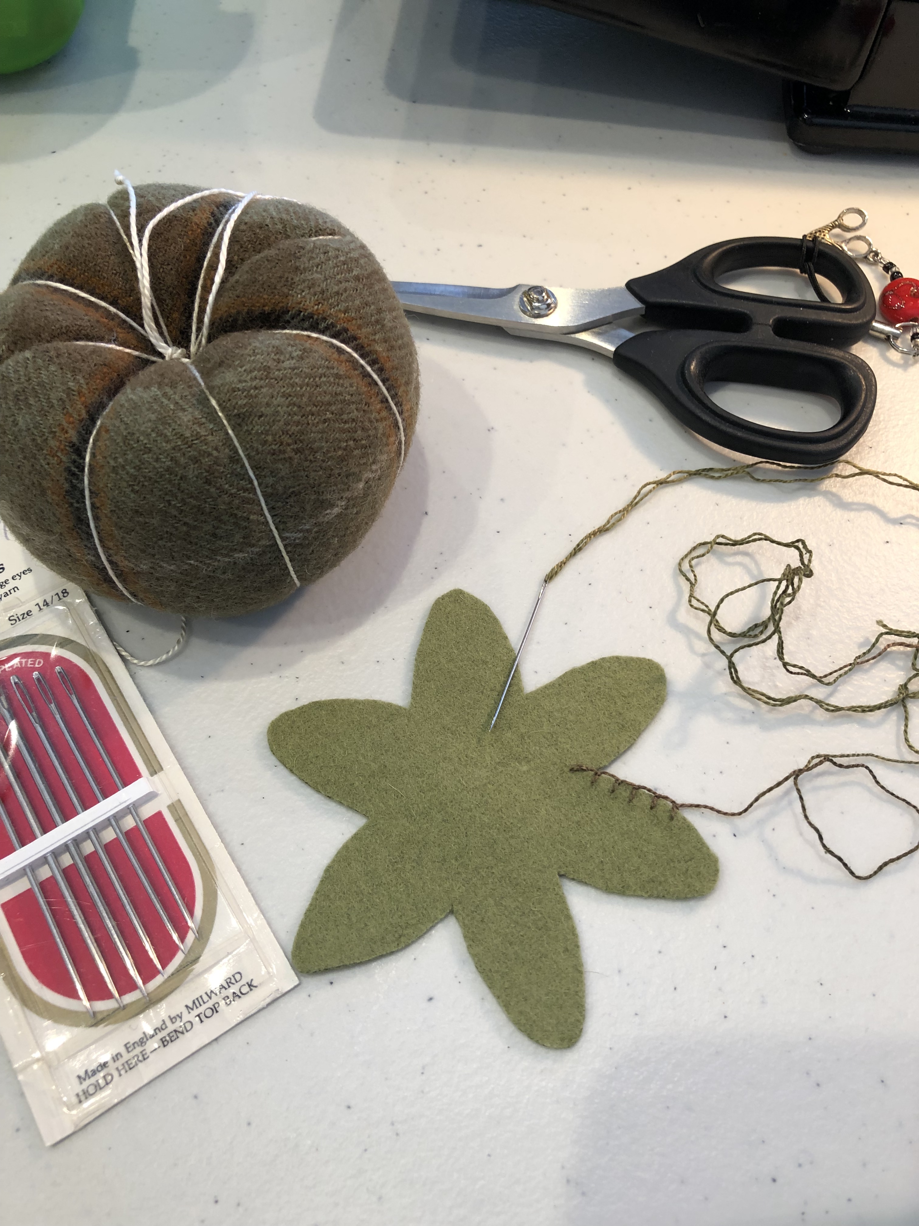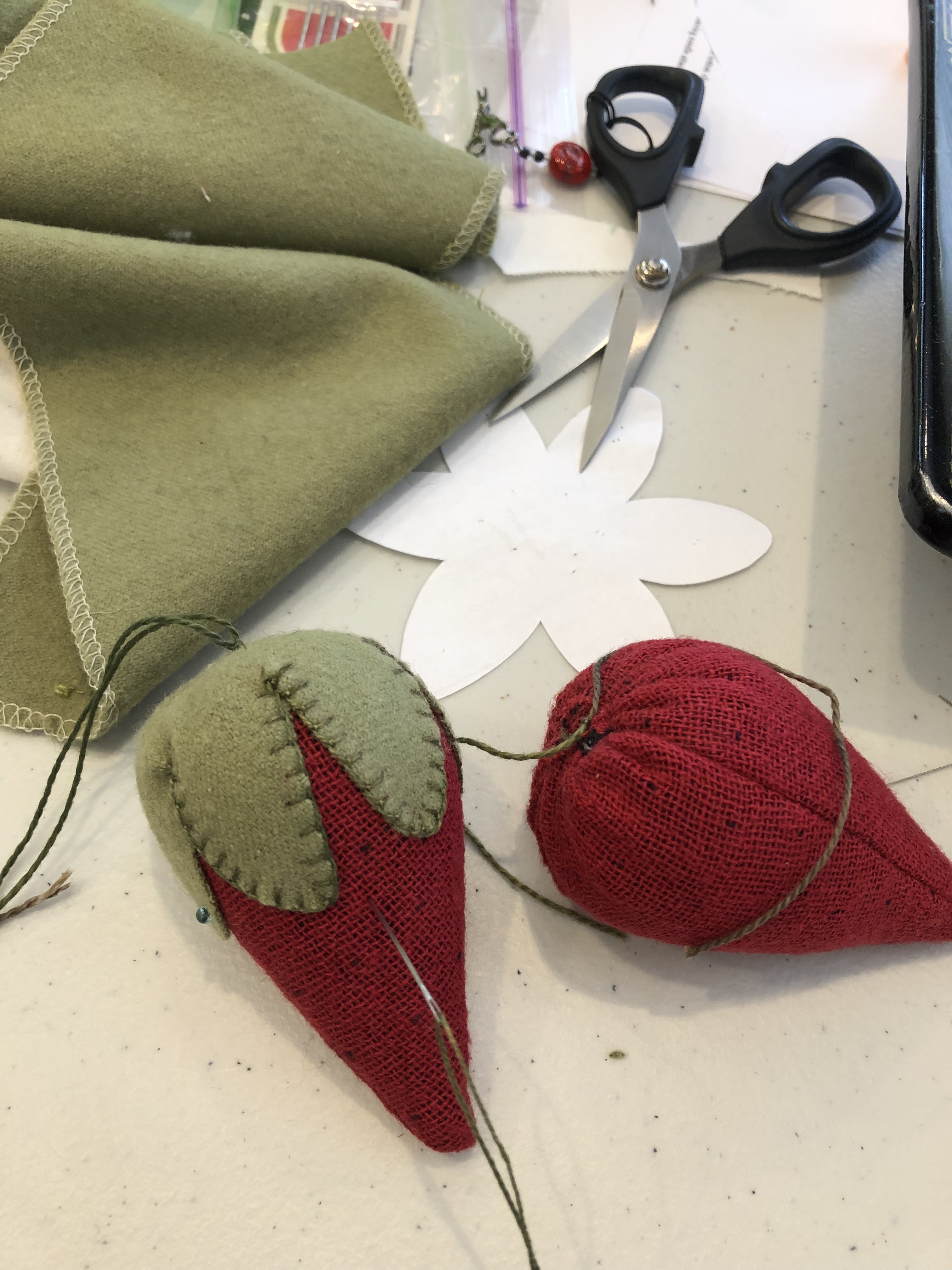 These Strawberries need a green wool top and I (most often) do the leaf stitching at the edge before they are added but on the strawberries, I want the greenery stitched down to the berry.