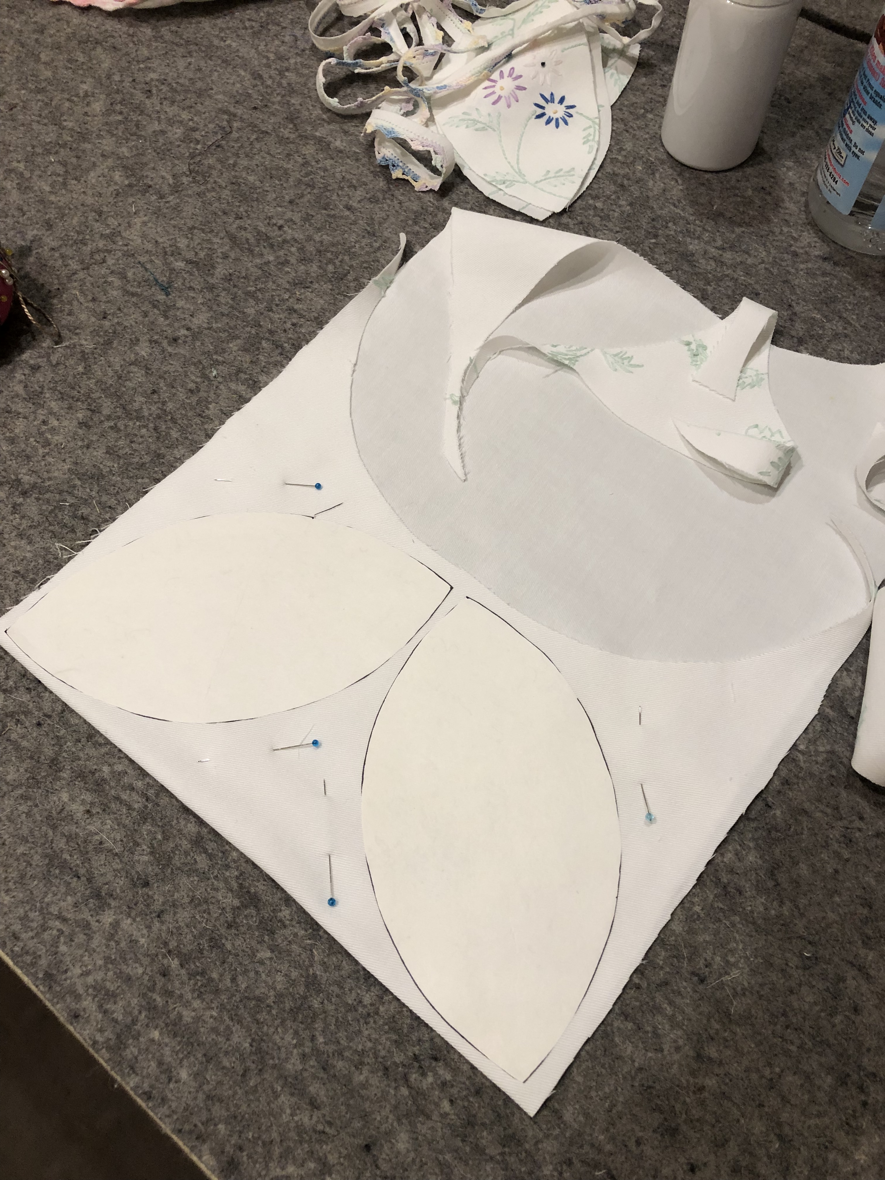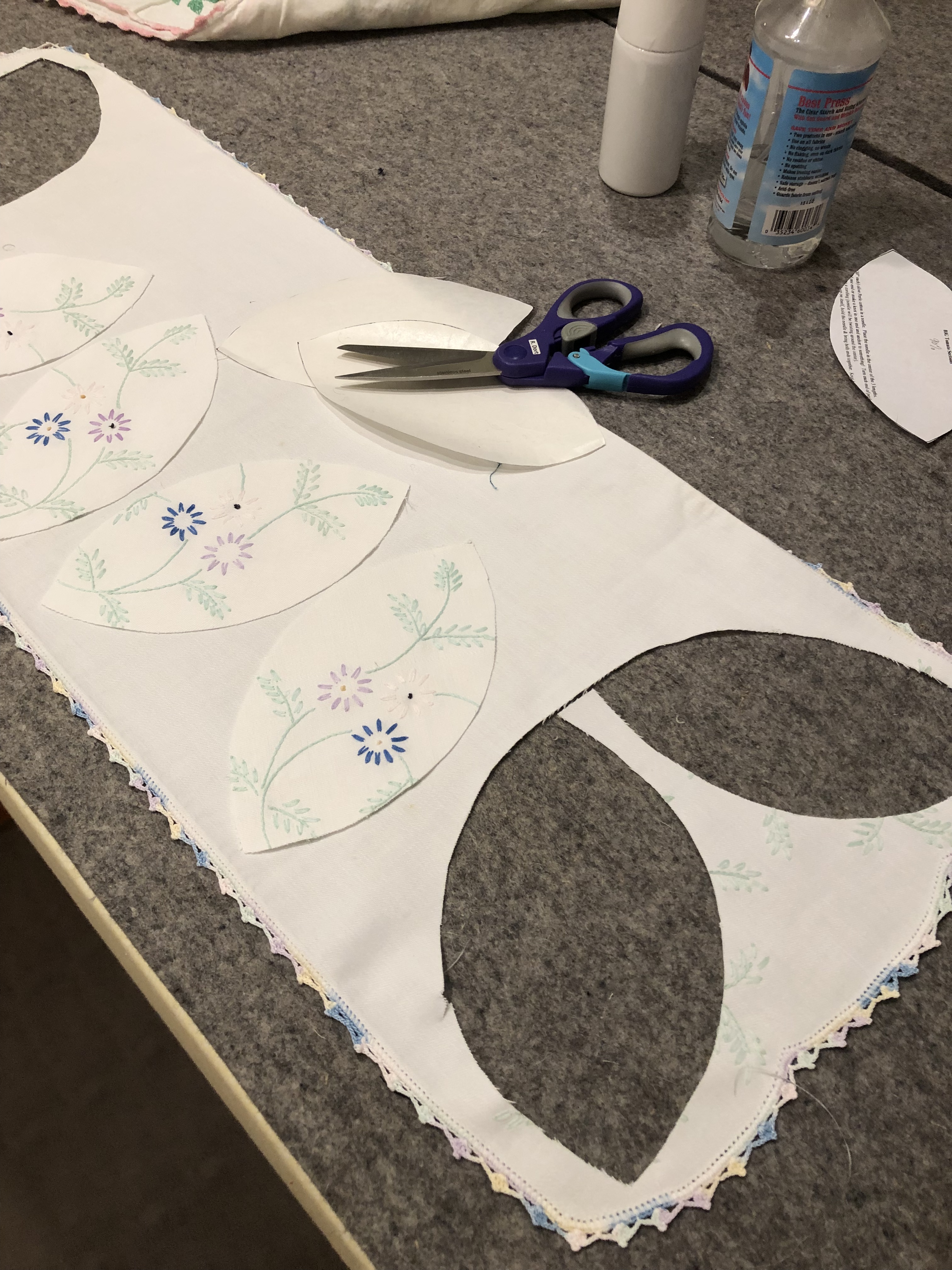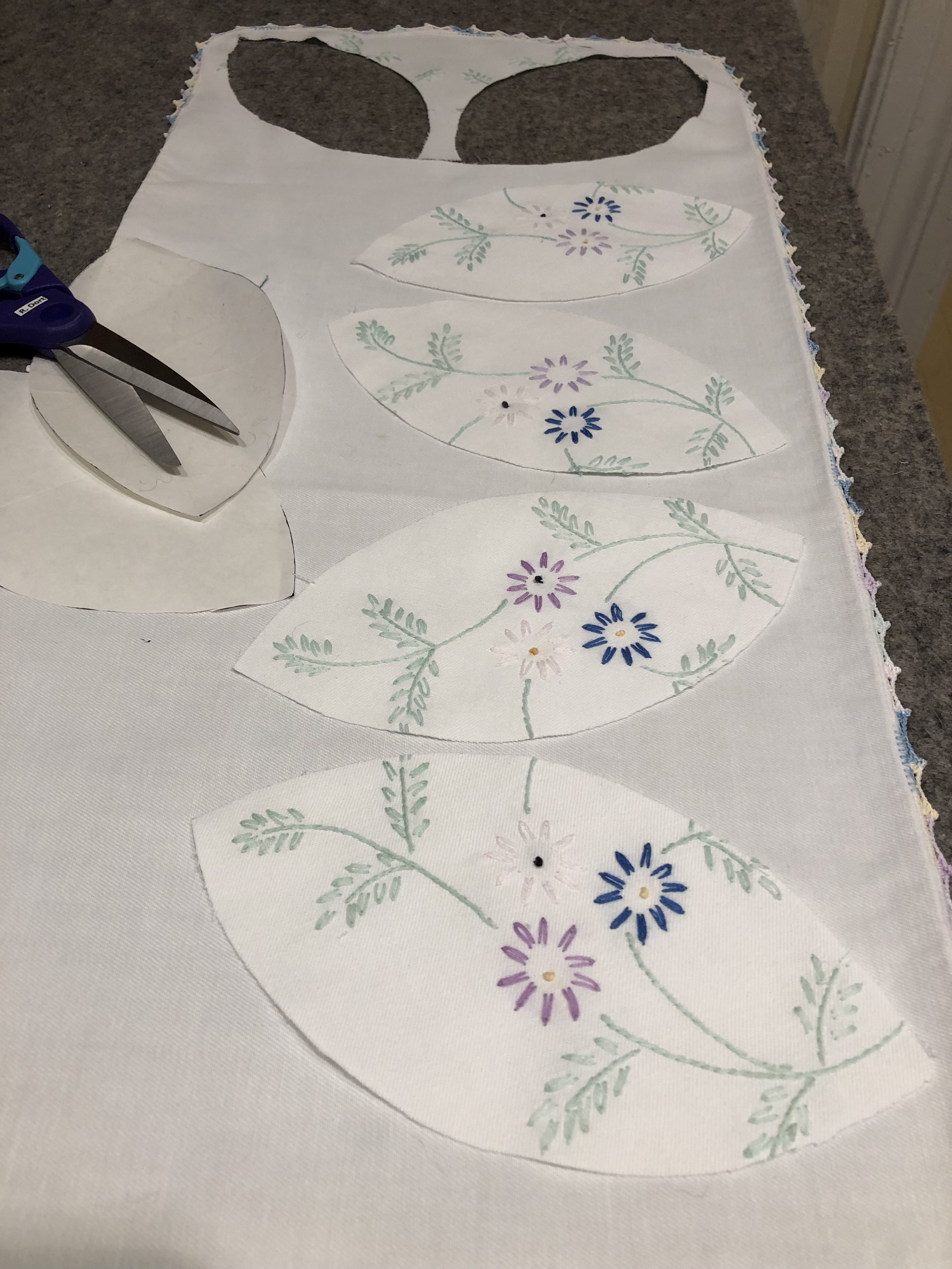 But what happens if you decide you need a tomato pin cushion made from a vintage dresser scarf? I laid the full sized pattern strategically on the embroidered designs and cut out each. The fabric is old and rather on the thin side so I doubled up by also cutting 4 additional pattern shapes out of the middle of the dresser scarf.