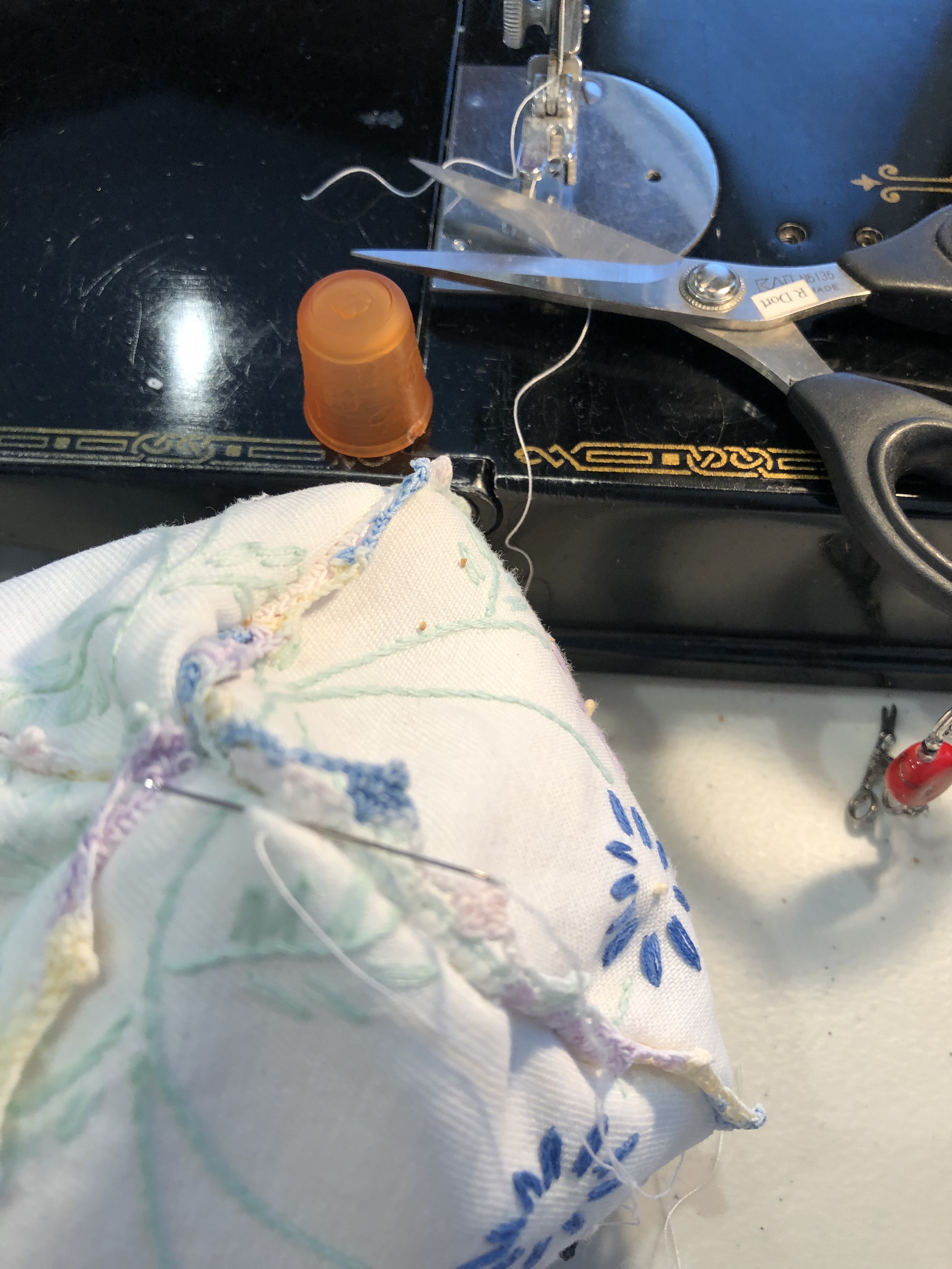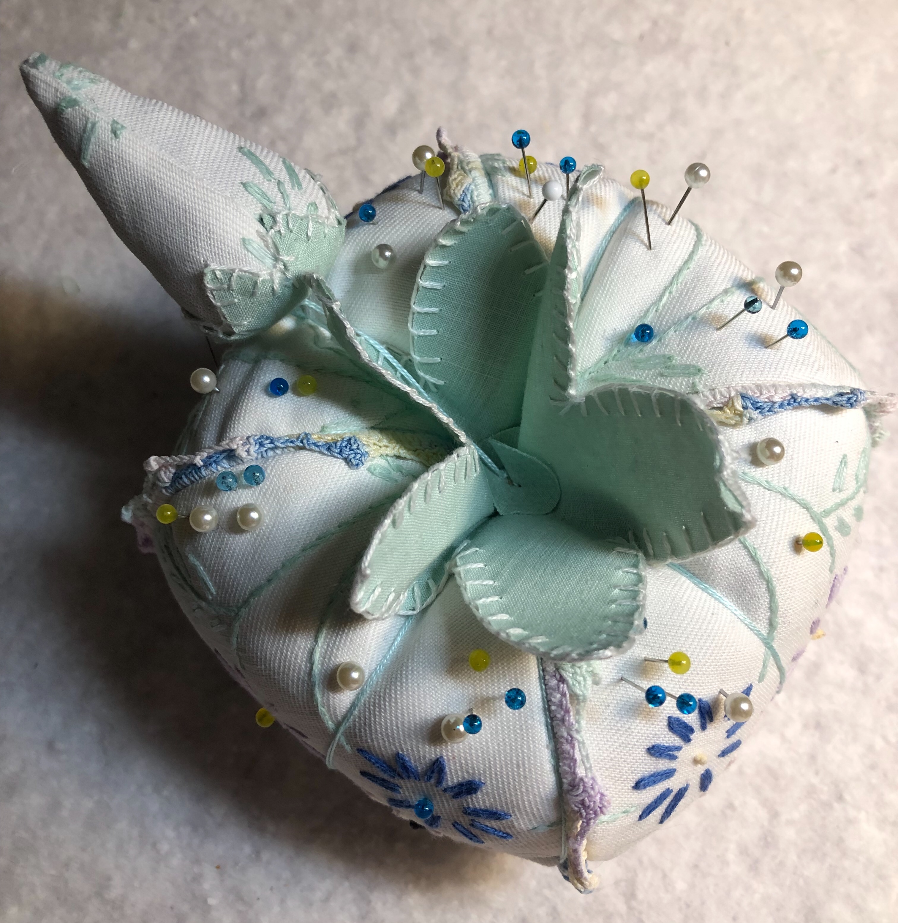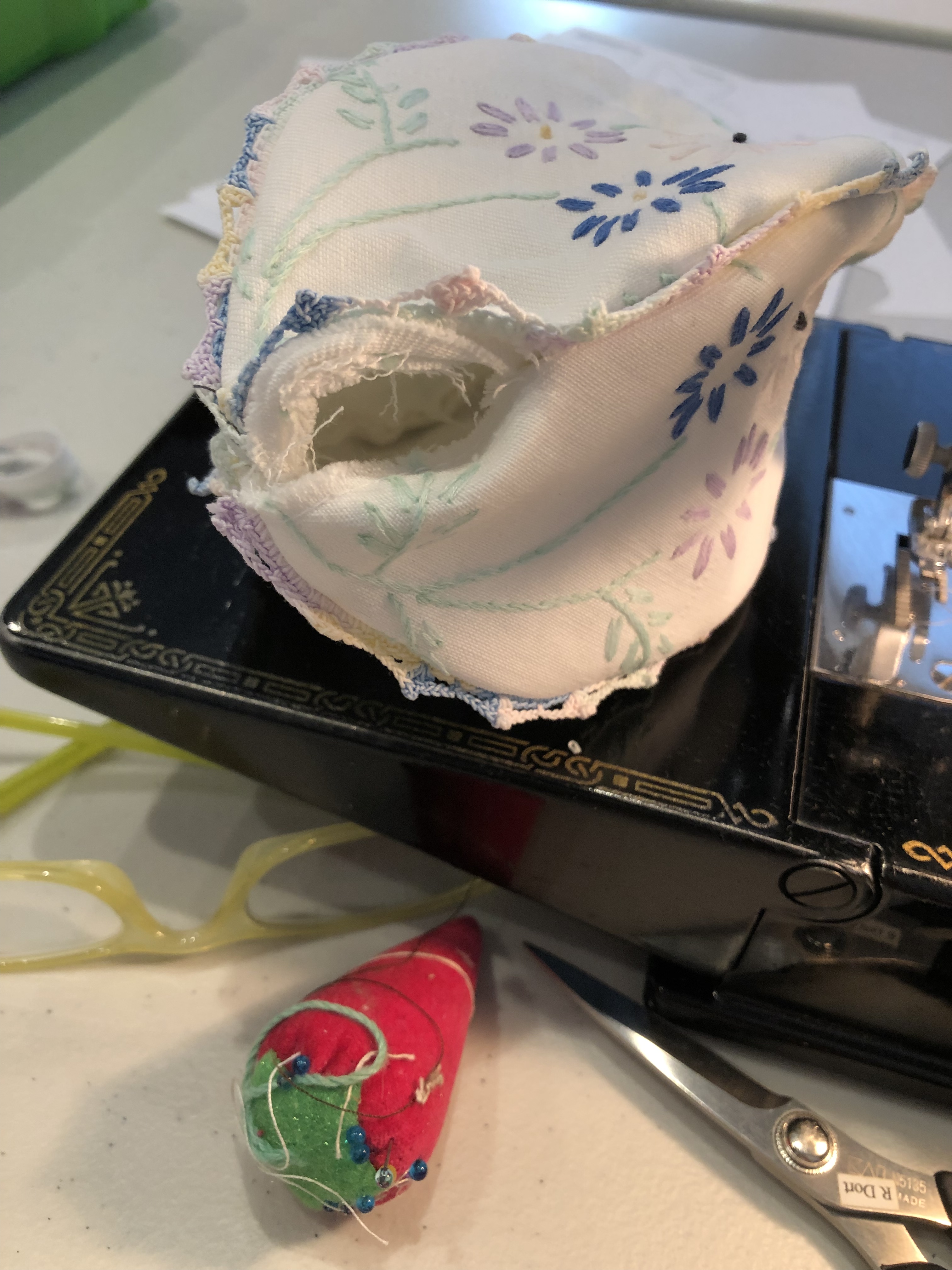 The lovely hand crocheted edging of the dresser scarf was saved as I realized it would look great inset in the 4 seams of the pincushion.