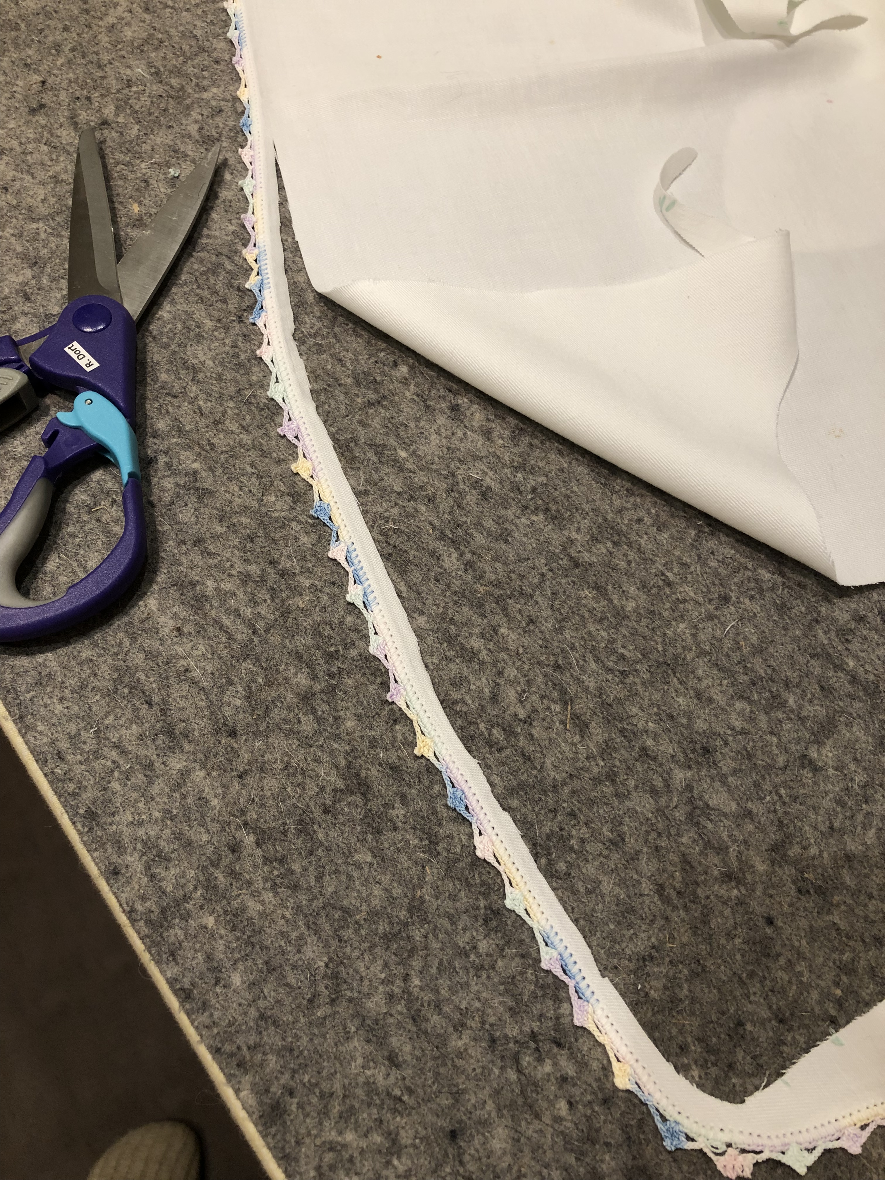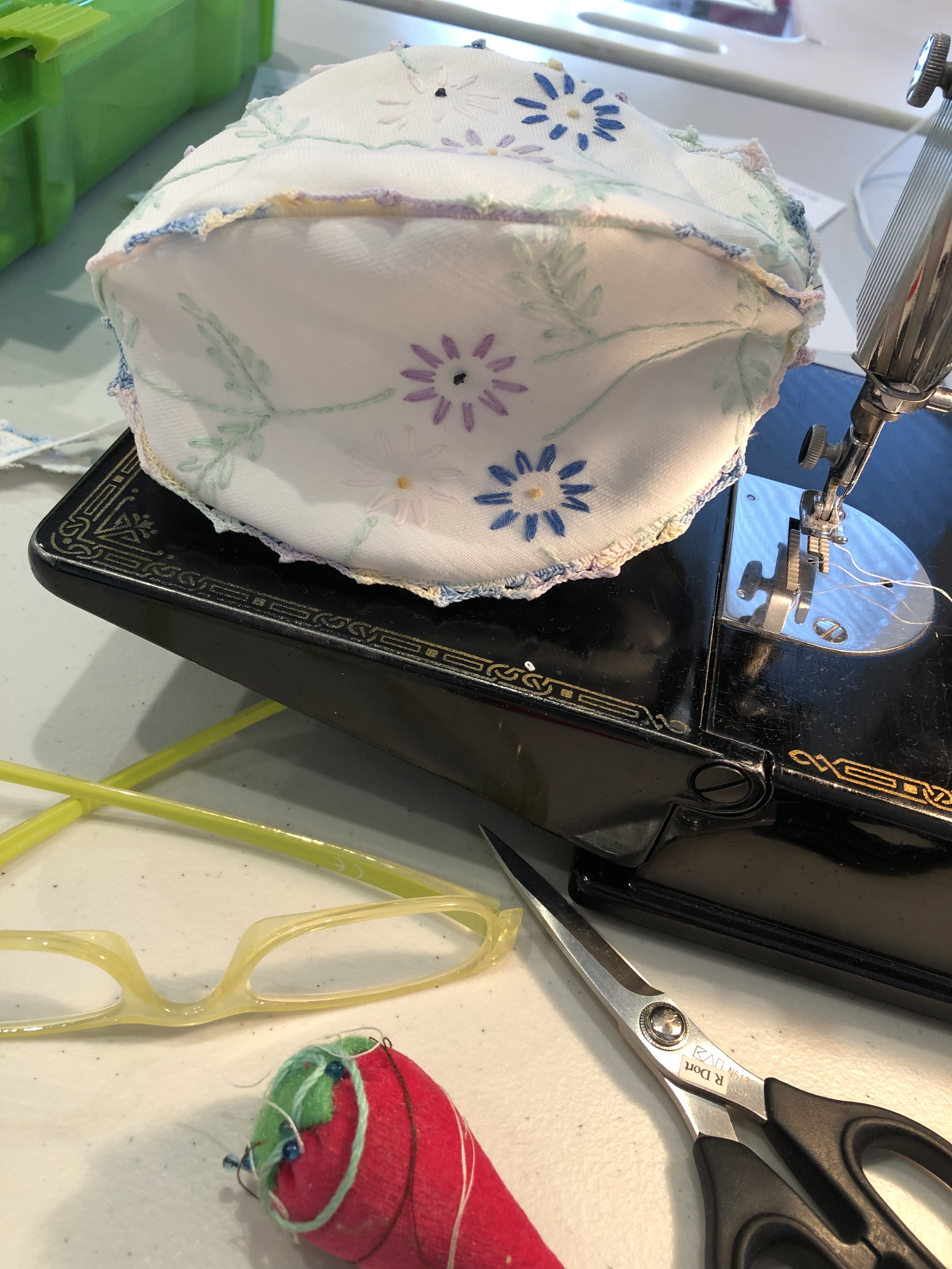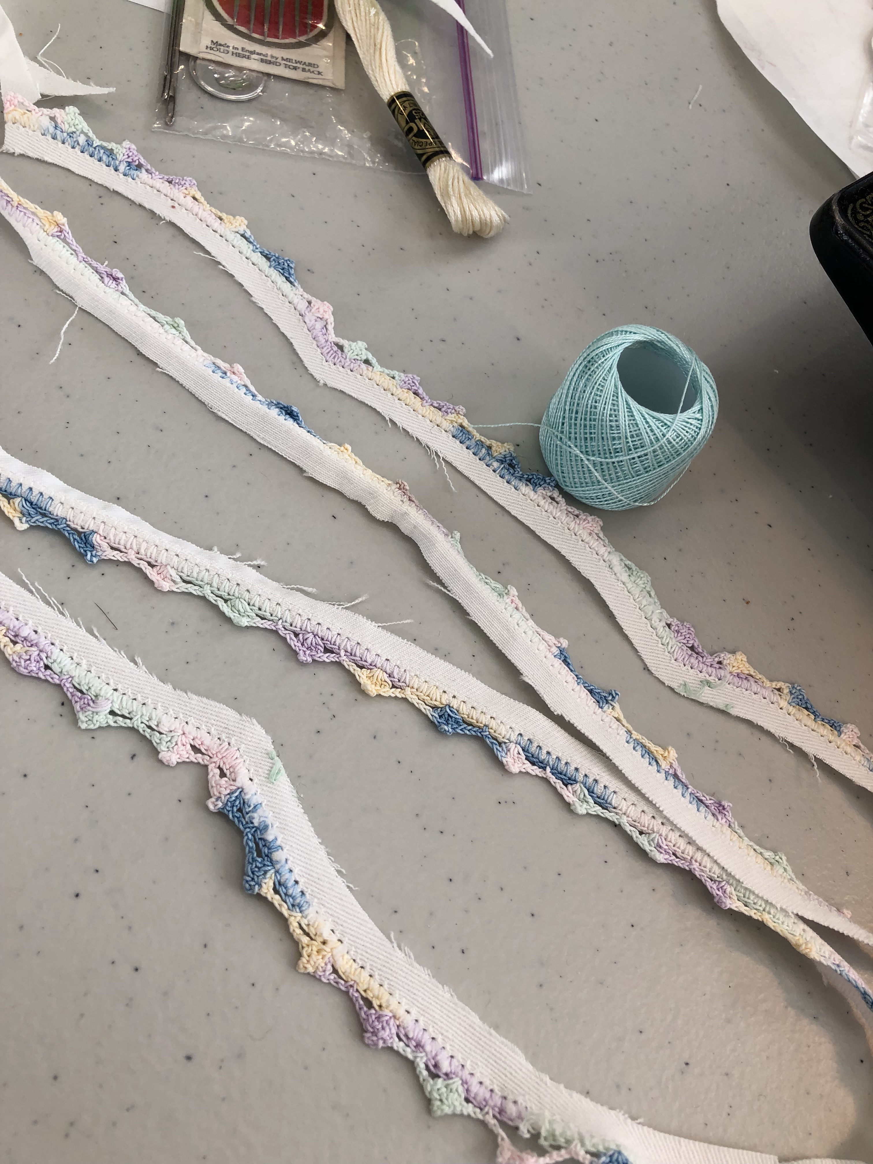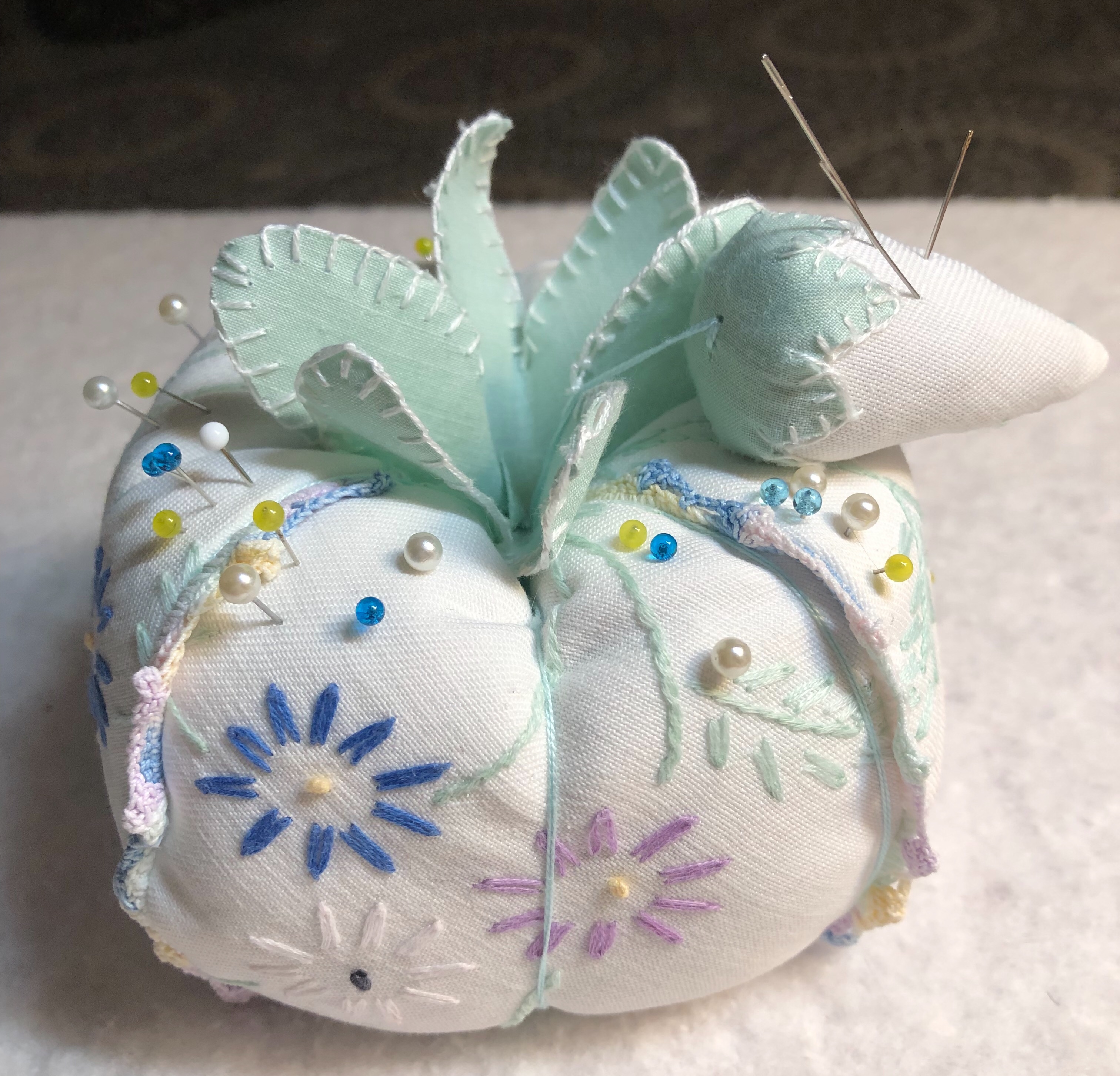 The lovely hand crocheted edging of the dresser scarf was saved as I realized it would look great inset in the 4 seams of the pincushion.