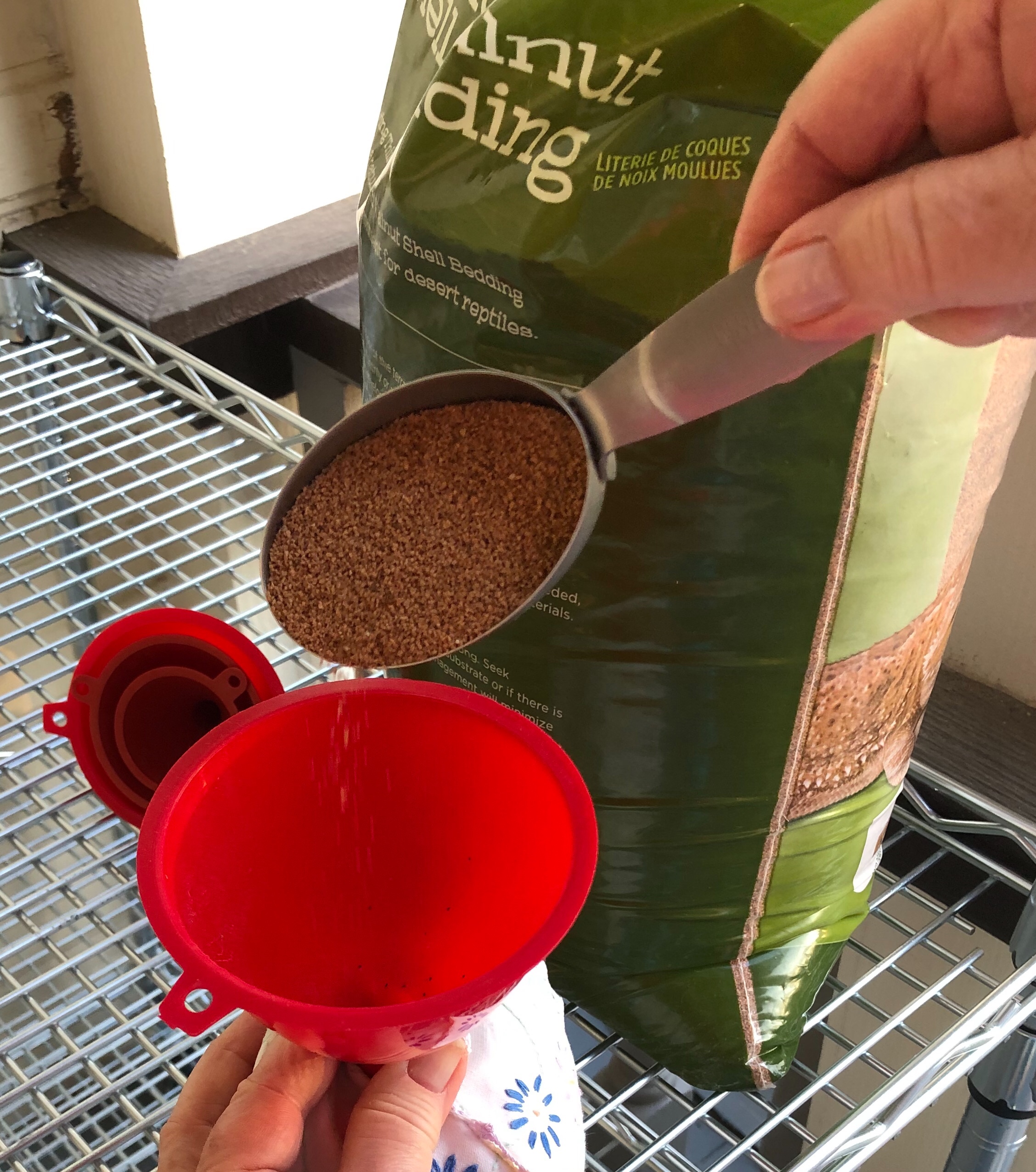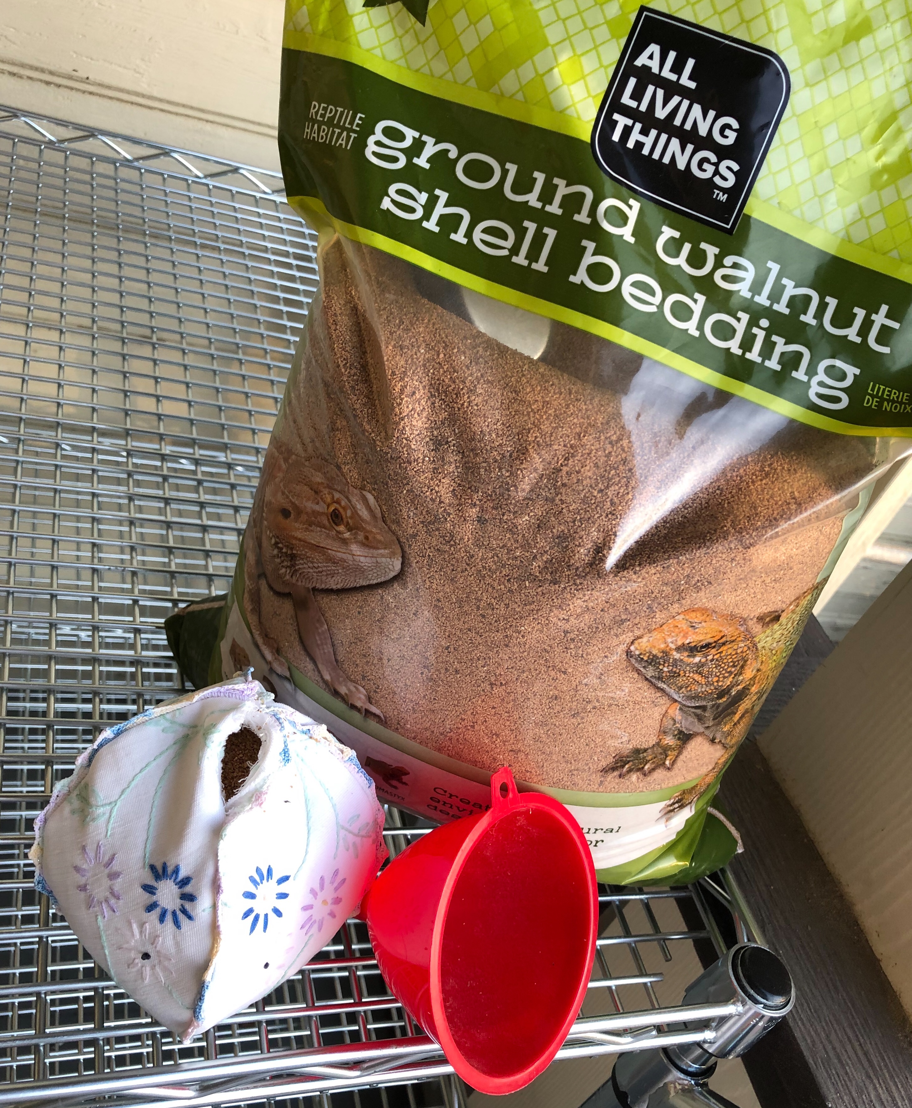 I’ve got a funnel (very necessary) and a scooper and I just slowly fill the entire sphere as full as I can get it. Continue to pounce, squish, manipulate your sphere to pack the ground shells in tight. Once I think it can’t hold one more speck of lizzard bedding, I slip a small (maybe 1″) square of quilt batting in to cover the opening and then carefully and tightly hand stitch the opening closed. Do a very good job of stitching this closing! The last thing you want is pits of shell working their way out.