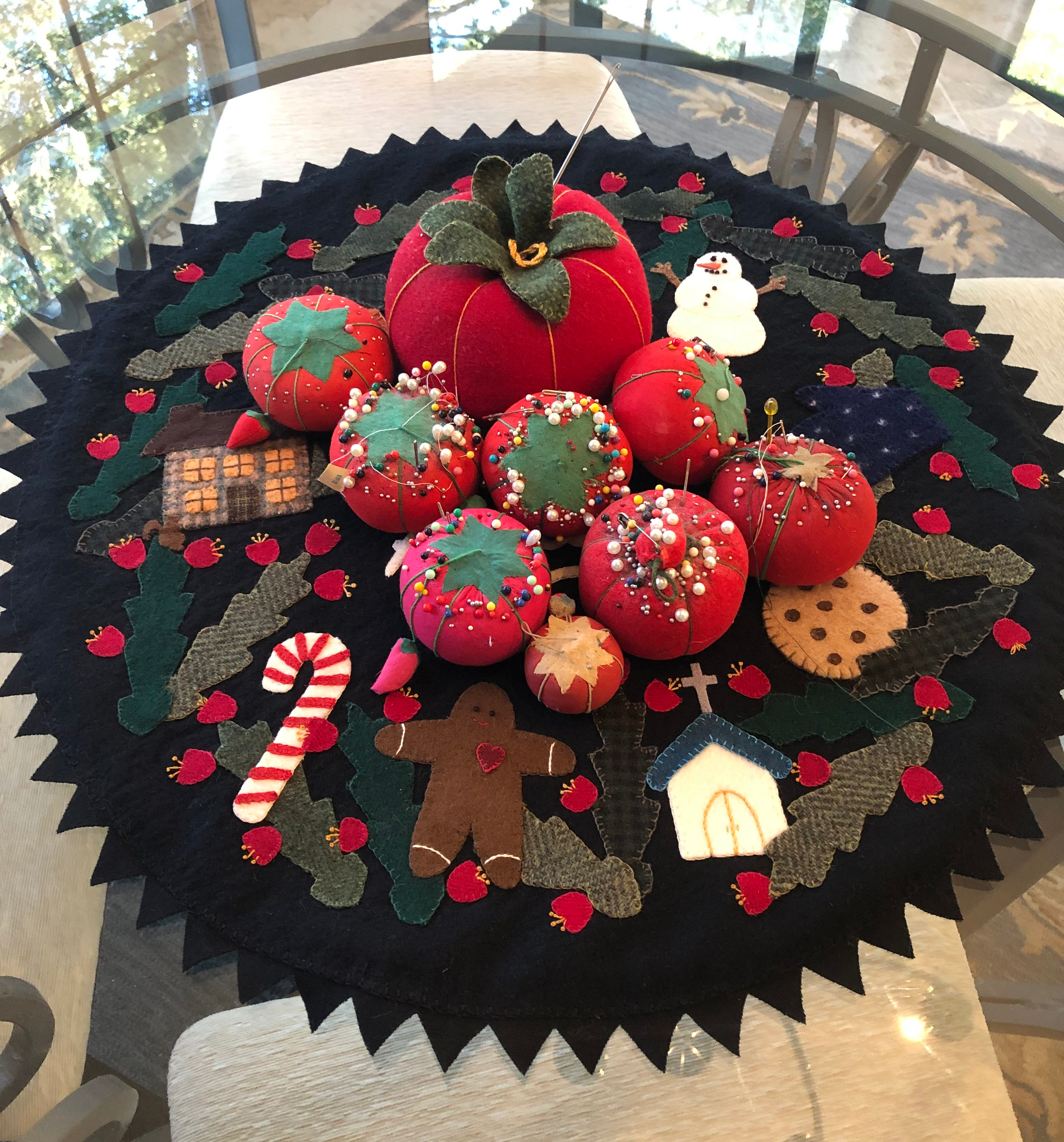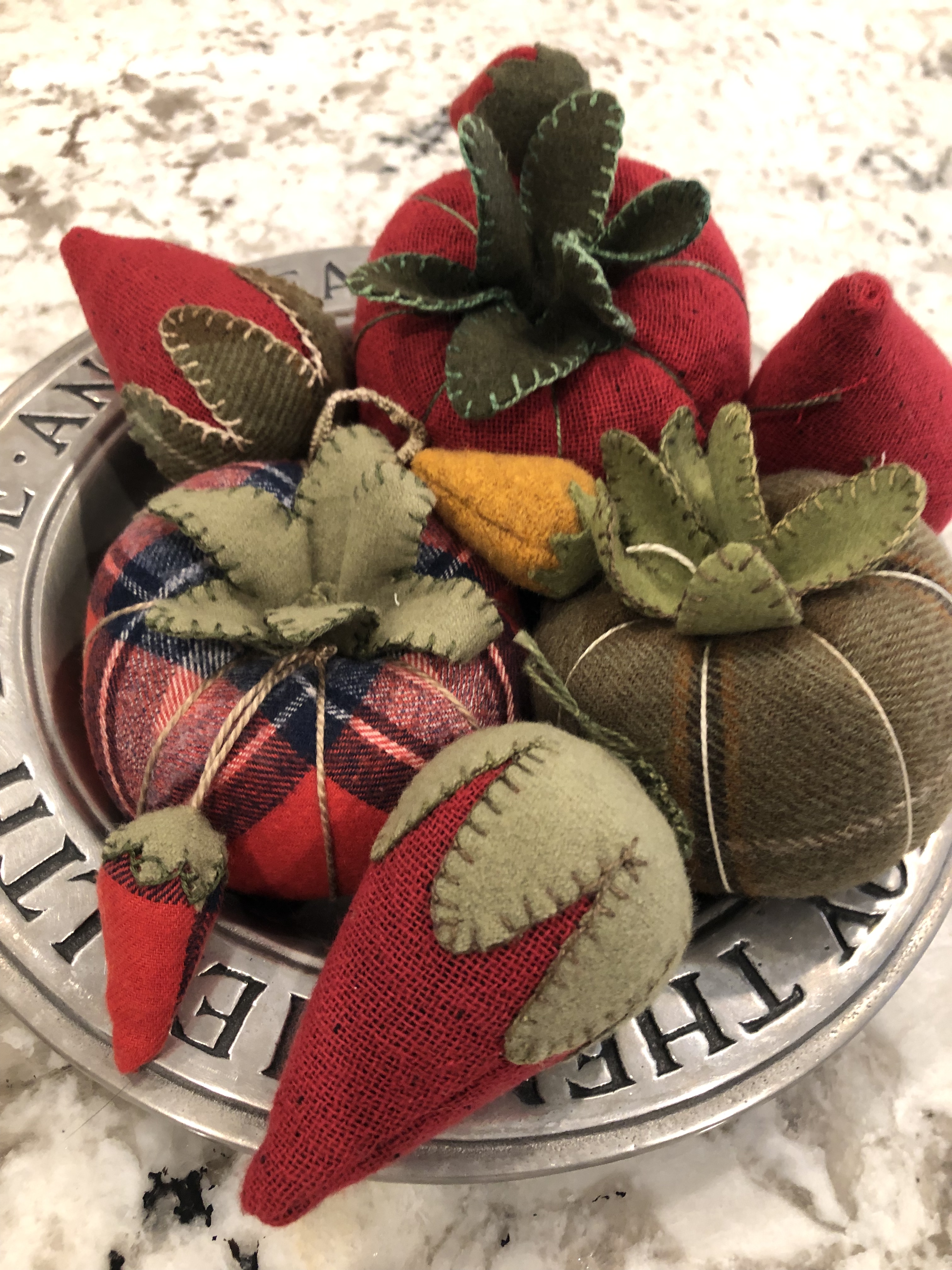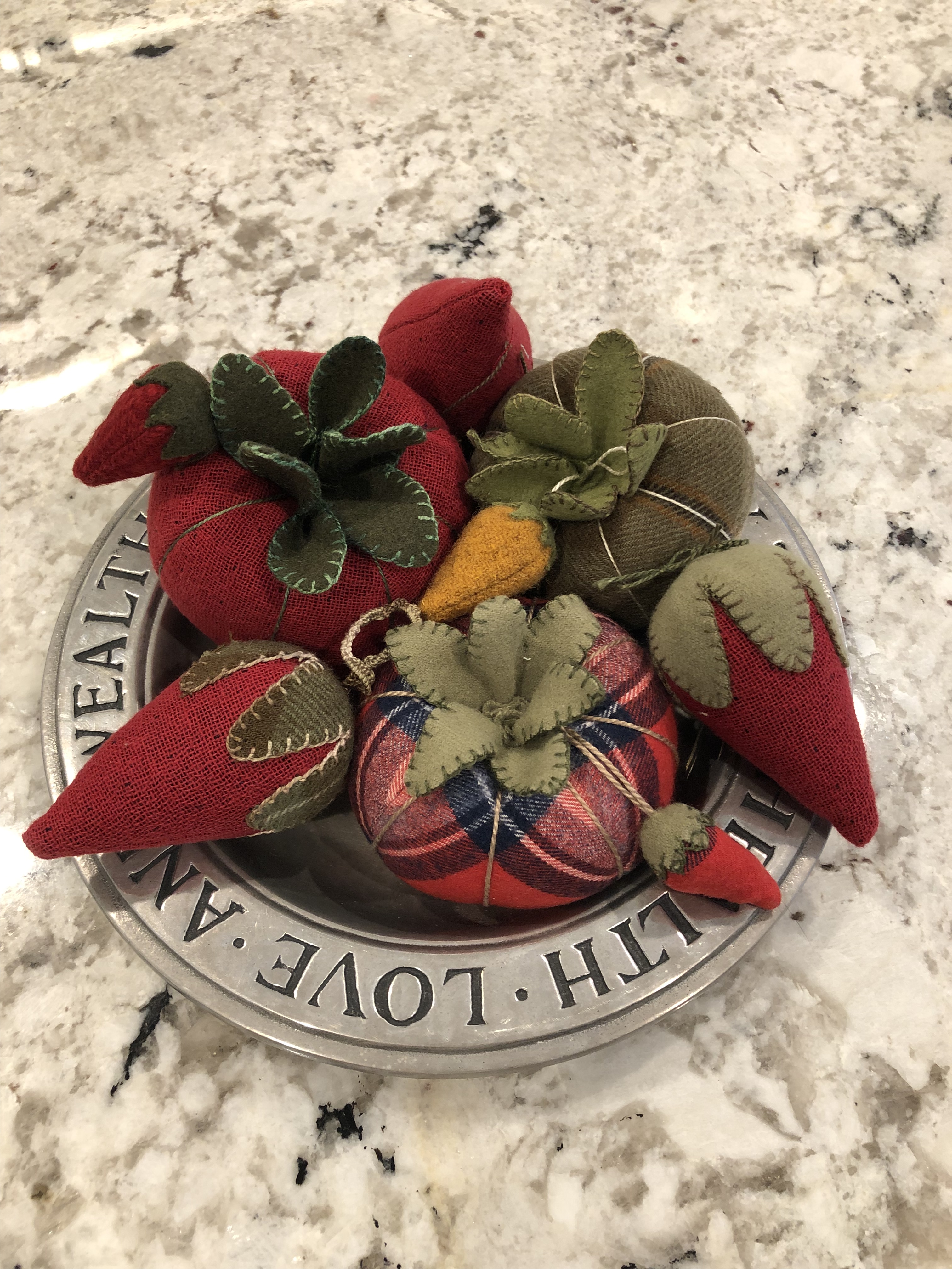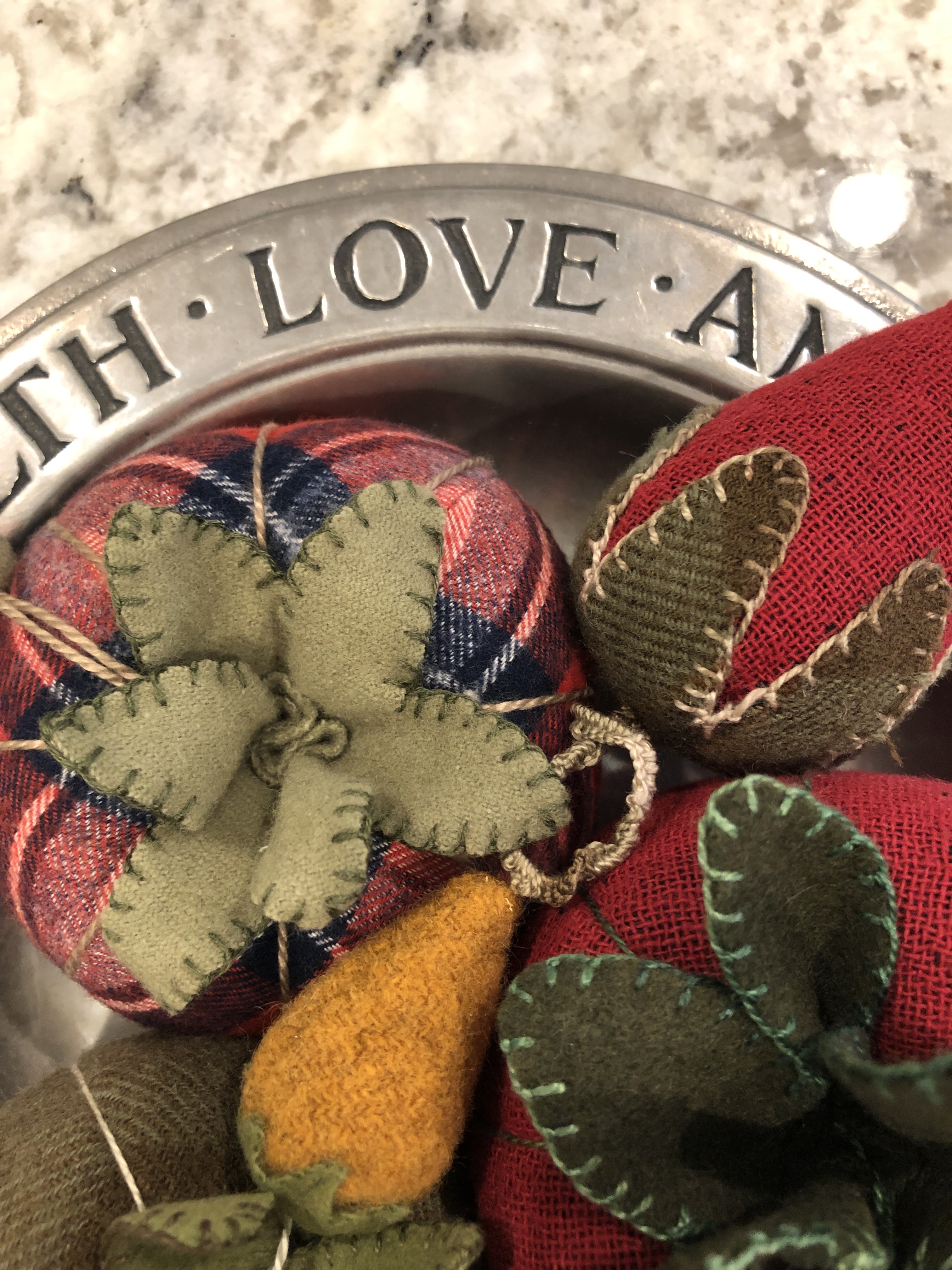 They’re also a nice addition to my already growing collection of Vintage Tomato Pin Cushions. The giant pin cushion at the top is the very first one I made years ago. I followed the pattern exactly for this one made of felted red and felted green woolens.