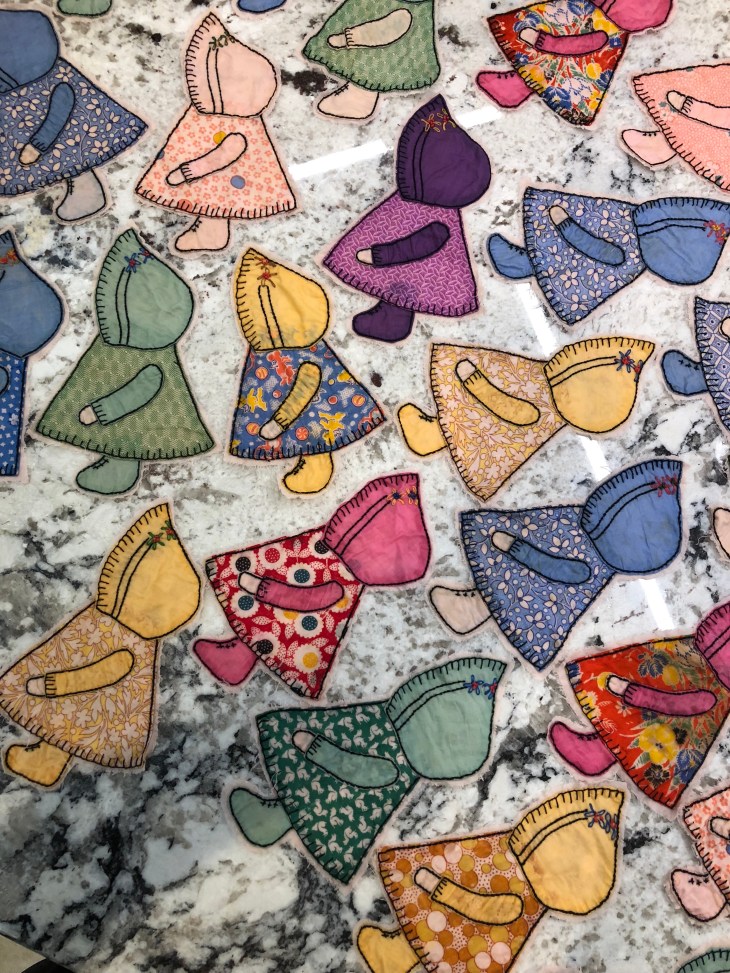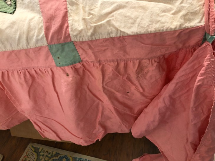 $18.00 bought me this Sunbonnet Sue quilt top with a pink ruffle on 3 sides, a total of 30 blocks and sadly in kind of bad shape. Not what I was expecting. And the aroma, oh dear!