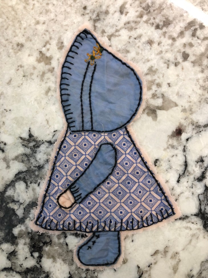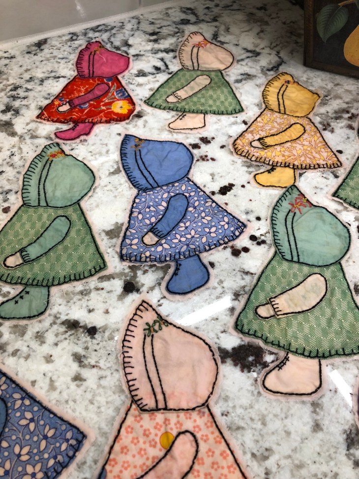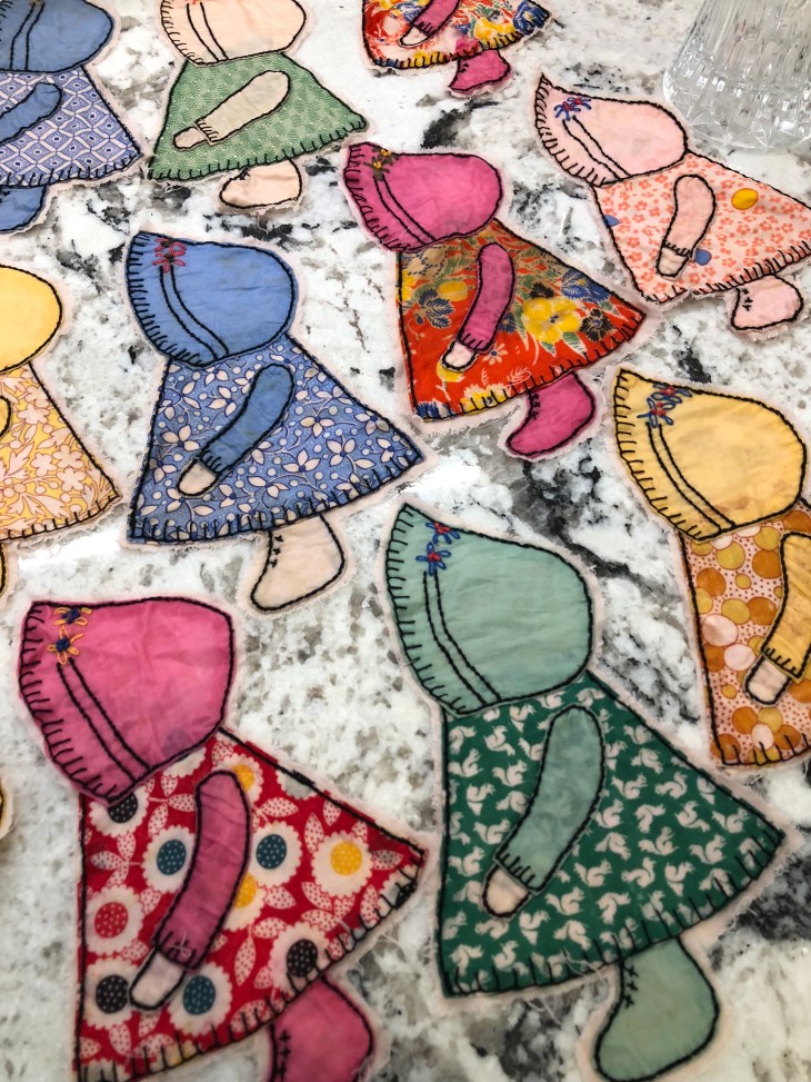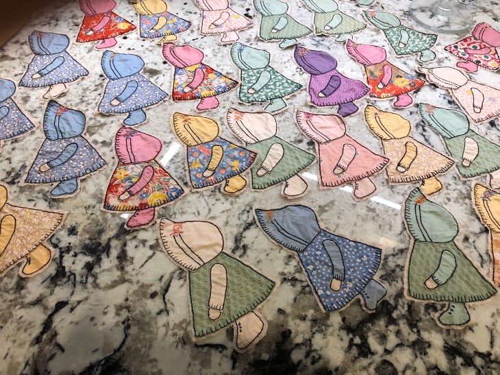 I’m unsure if I will keep the blocks at 12″ finished, I may trim the sides to form a rectangle. I’ll have a better idea once all 30 of the Sue’s are stitched onto their new fabric. Speaking of the background fabric, I had intended to use a natural muslin. Once I laid out 5 or 6 of the Sue characters on the natural, I realized they needed to be on bleached muslin to “brighten” them up a bit.