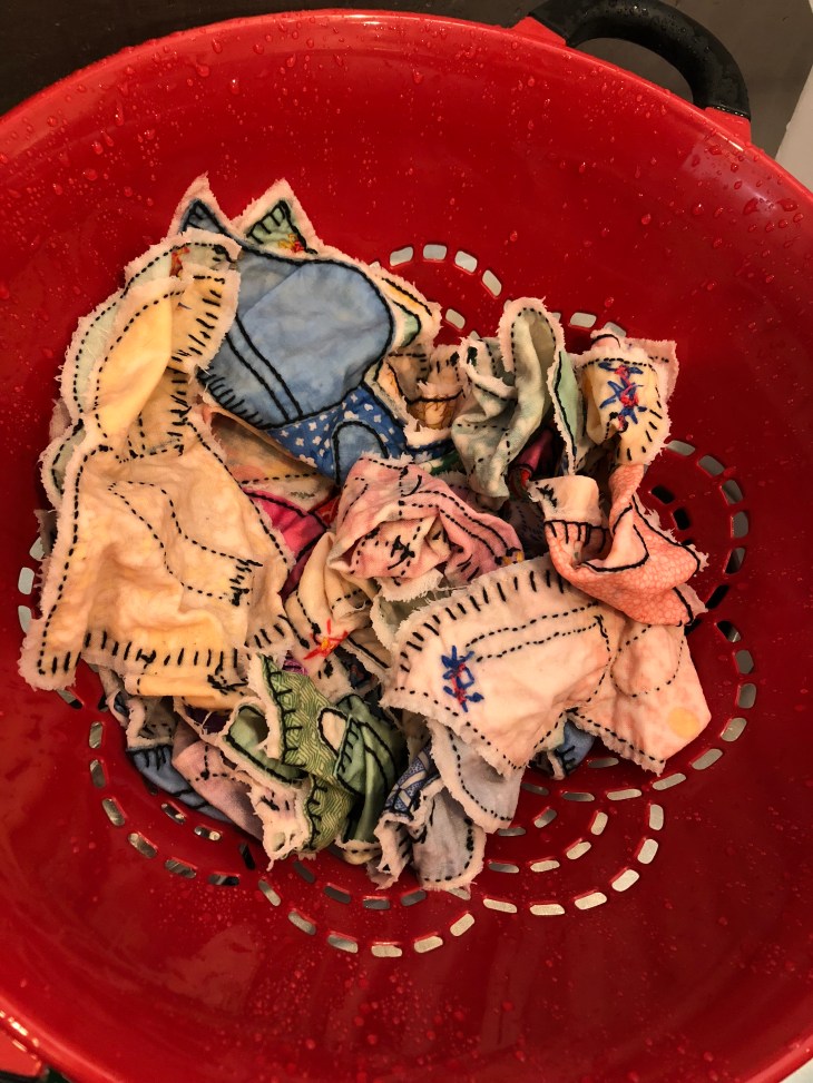 And here’s how all 30 of the Sue’s looked after I soaked them overnight in dish wash powder. Interestingly, the dish wash powder did nothing to remove the pink from the muslin.