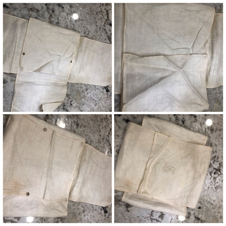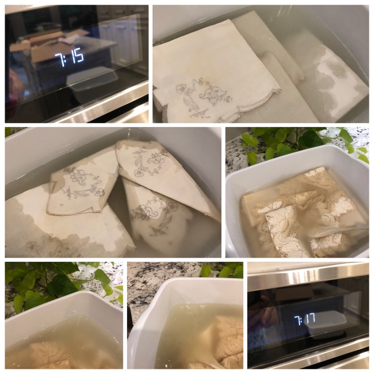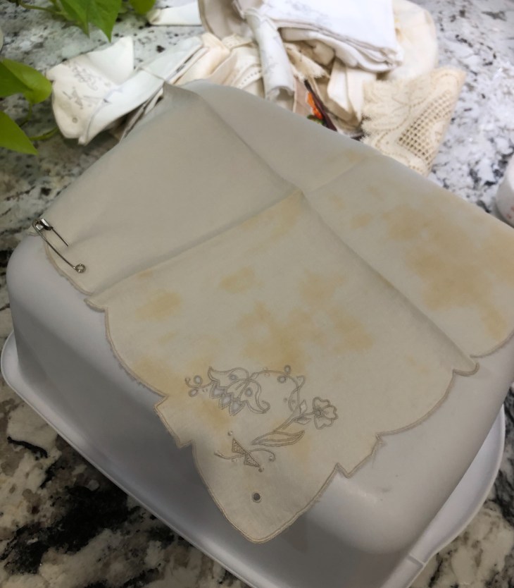 Remember the terribly stained napkin from my previous blog post? The one I put the large safely pin in so I could identify it after the dish wash powder soak? Good thing I pinned it! Look at the 2 pics below, the before and after! Wow!!