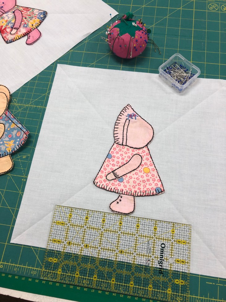 By folding the 12 1/2″ blocks diagonally point to point in both directions and lightly finger pressing, I determined the center of the squares. By laying a ruler at the bottom of the square set at the 2 1/2″ line, I placed each Sue with her shoe resting at the upper ruler edge. This gave me consistency of the bottom border between the shoe and the block edge.