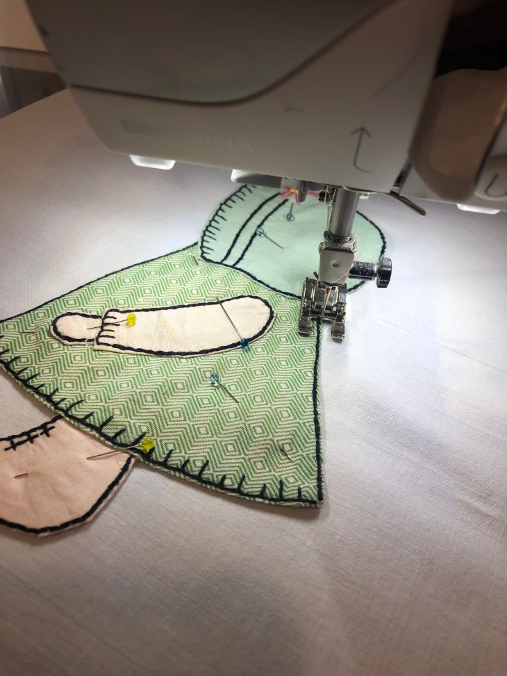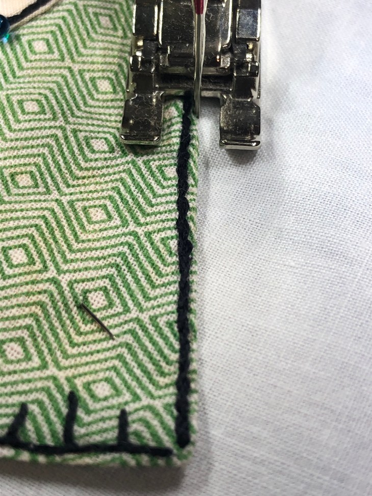 Lots of straight pins held each one in place while I used my sewing machine set to a tiny zig-zag. Bernina parameters: width 1, length 1. In my needle I’m using Gutermann Skala color #800, in the bobbin a prewound 60 weight white poly.