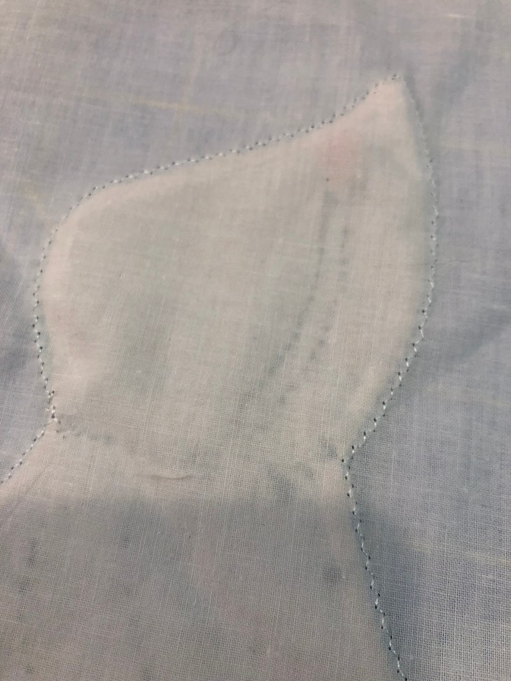 I let all the girls dry on the counter top. Using heavy spray starch, the starch container lid, an artist paint brush and my iron I set about to press the 3/8″ pink muslin edge to the back of Sue. I sprayed a good amount of starch into the lid and then “painted” the starch onto the muslin using the brush. By pressing the starched area until dry, I had the perfect set-up to appliqué the Sue into a new background fabric.