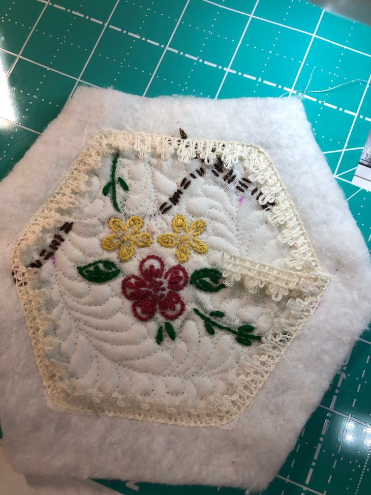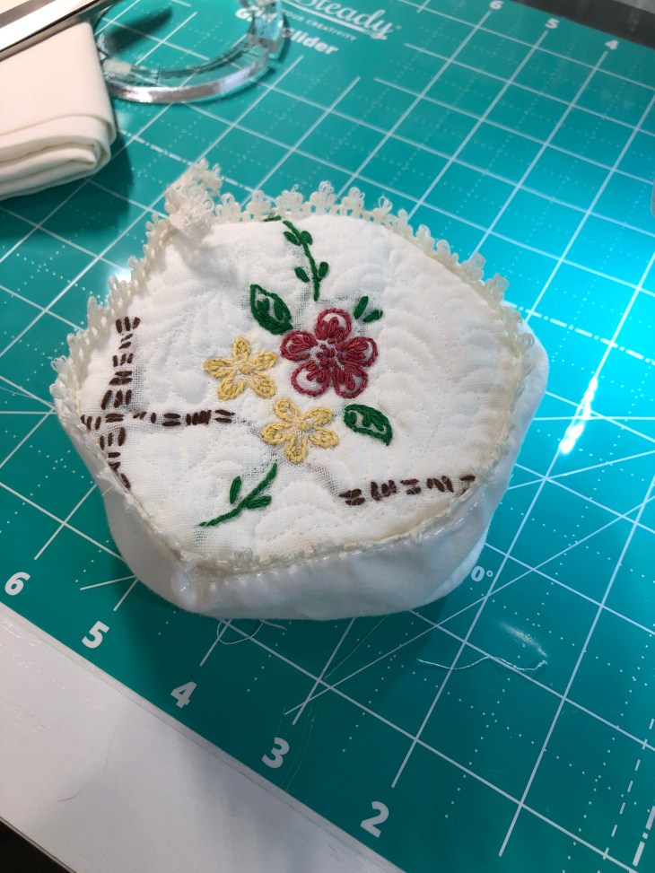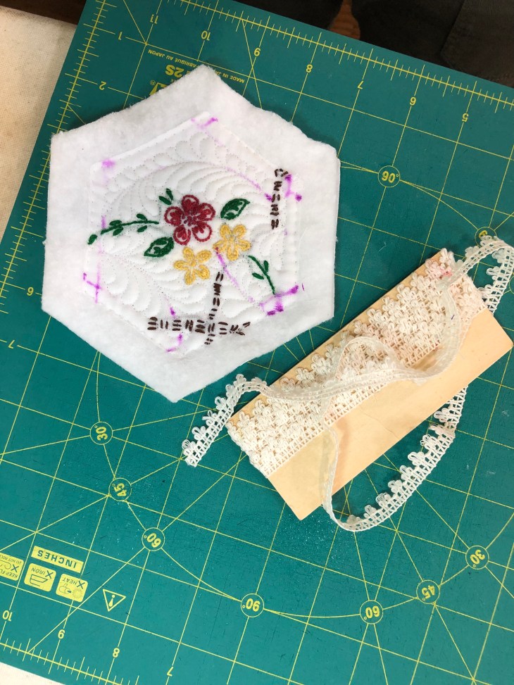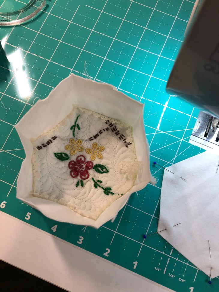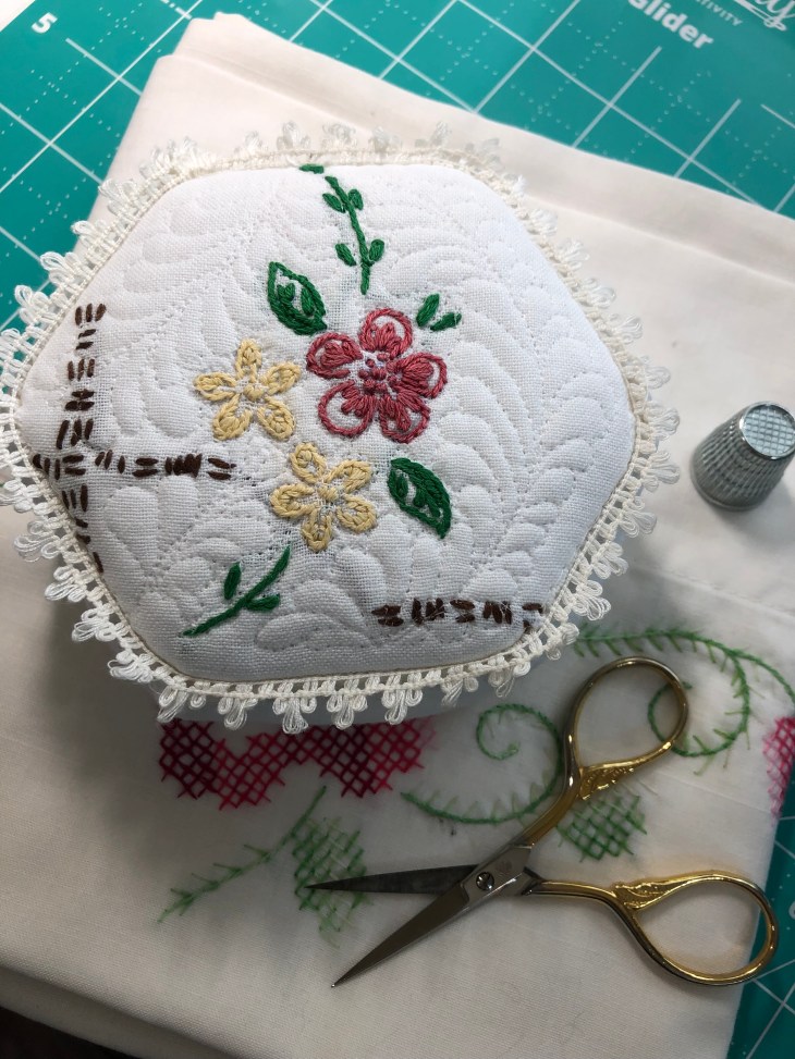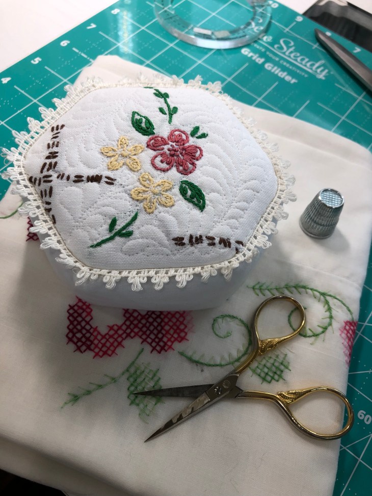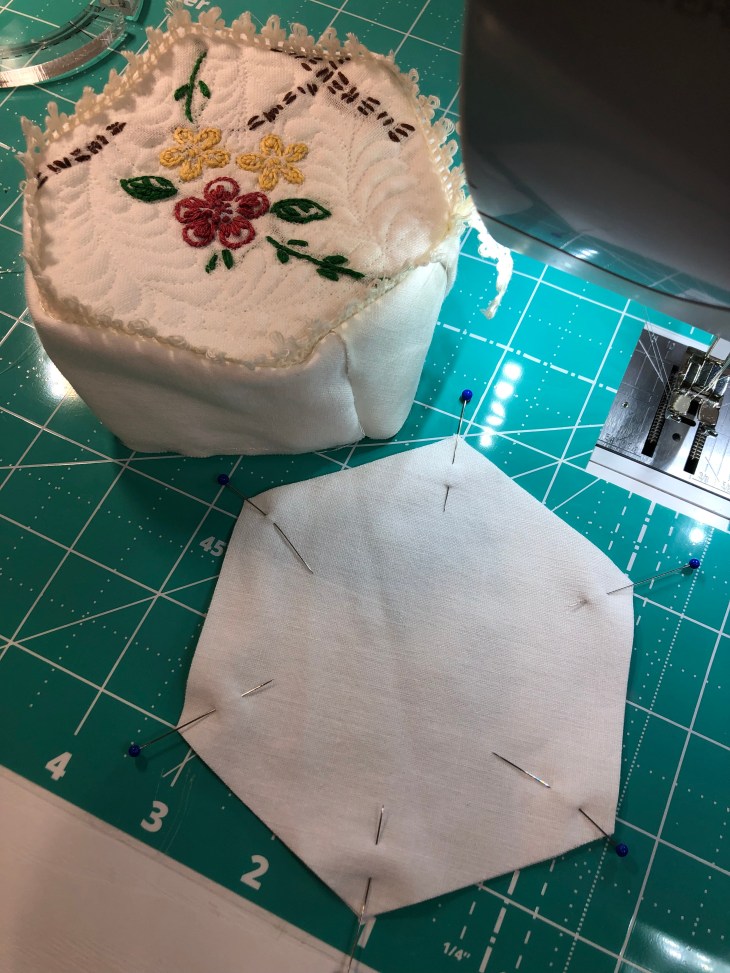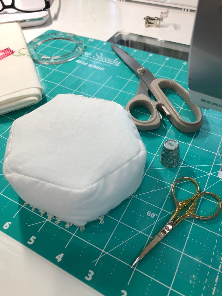 Another mostly all picture tutorial guiding you step by step through making a vintage linens hexagon (or really any shape you choose) pincushion. Let me know in the Comments section if you have questions. The purple marking pen I’m using-it’s both an air and water erasable by Leonis.