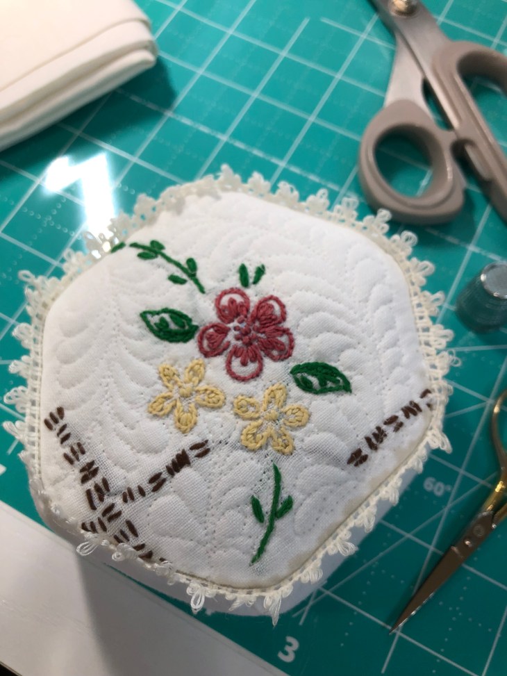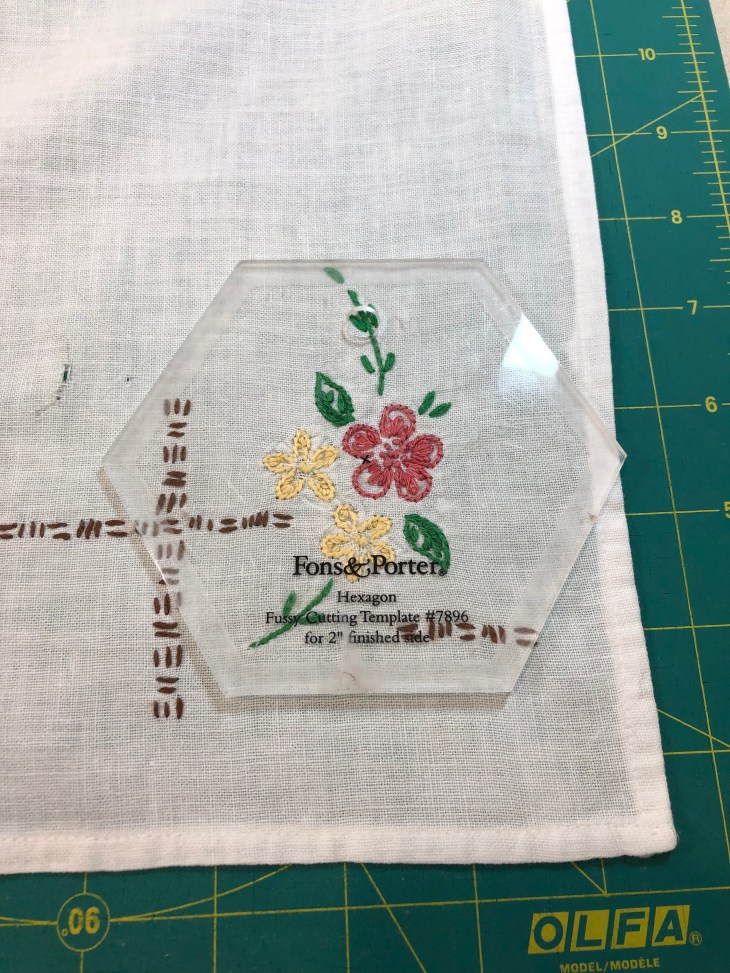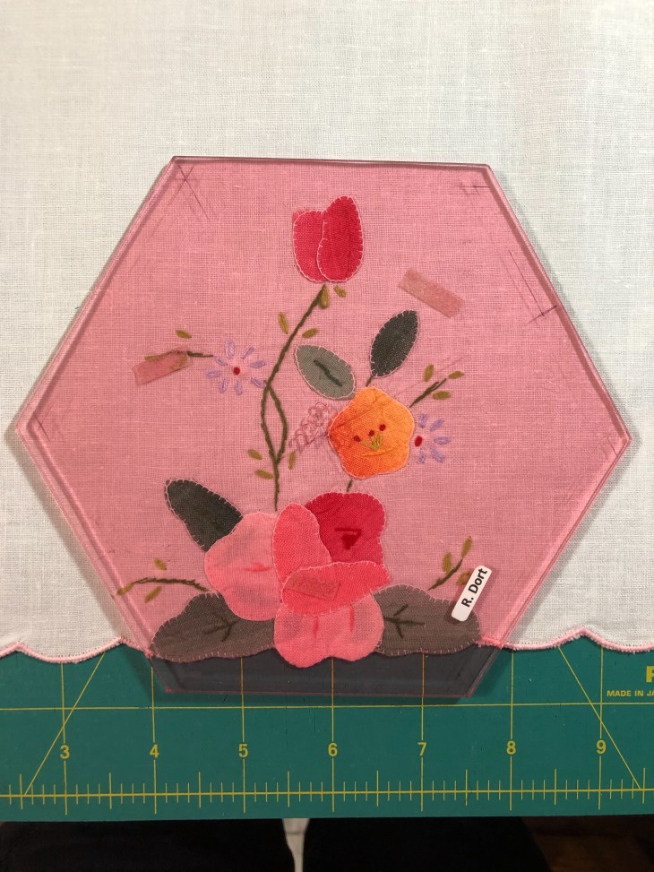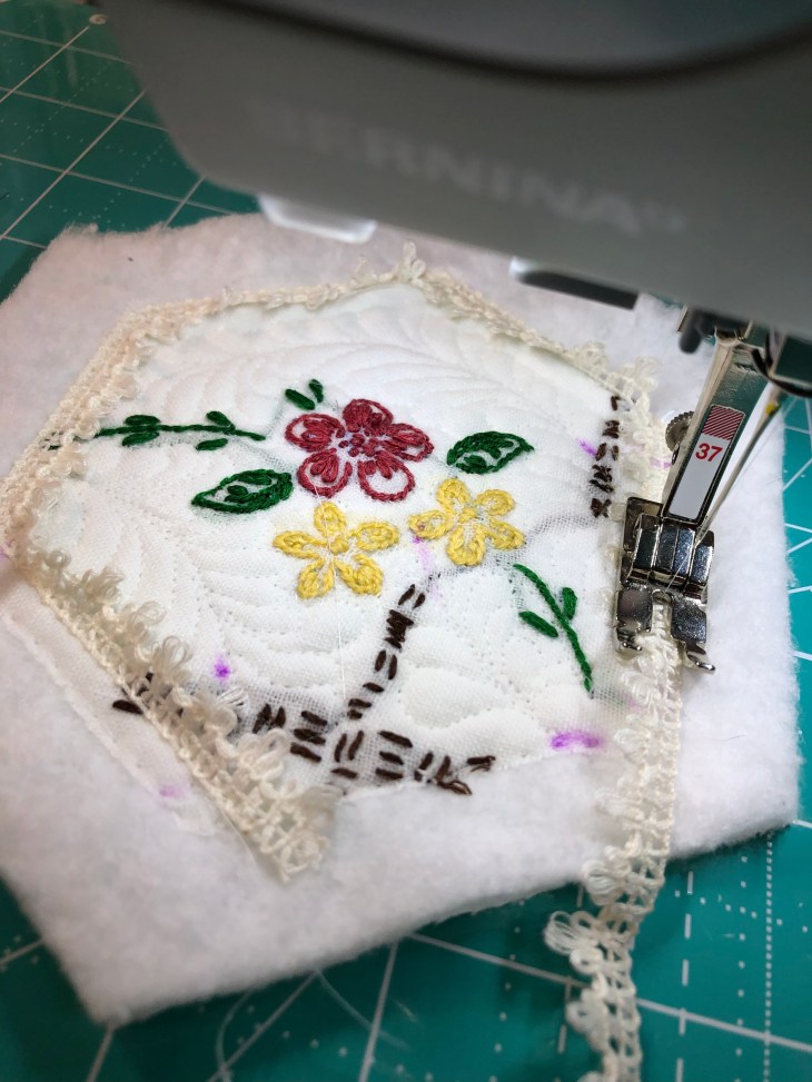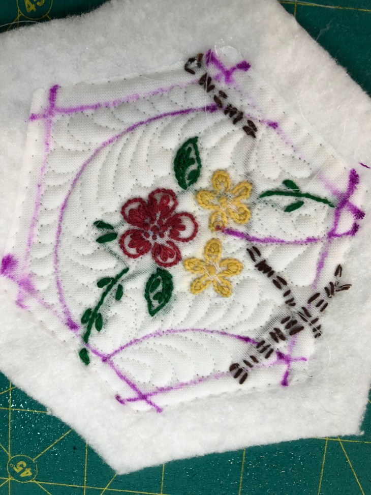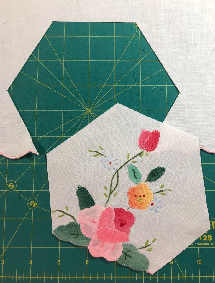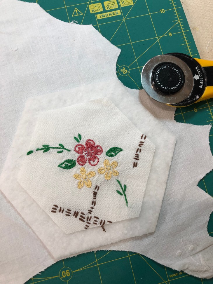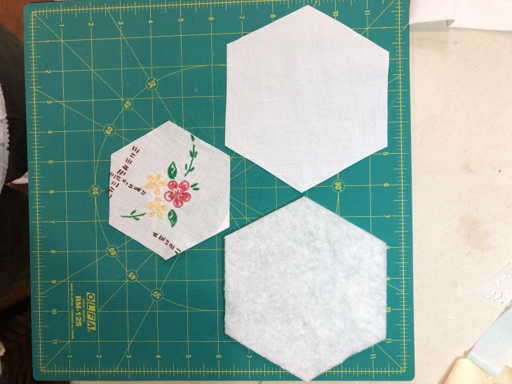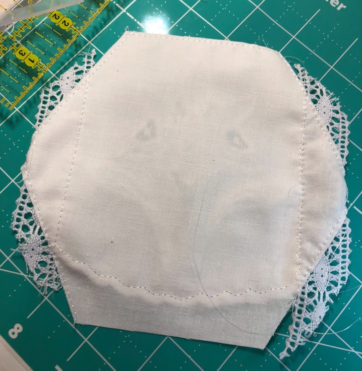 Another mostly all picture tutorial guiding you step by step through making a vintage linens hexagon (or really any shape you choose) pincushion. Let me know in the Comments section if you have questions. The purple marking pen I’m using-it’s both an air and water erasable by Leonis.