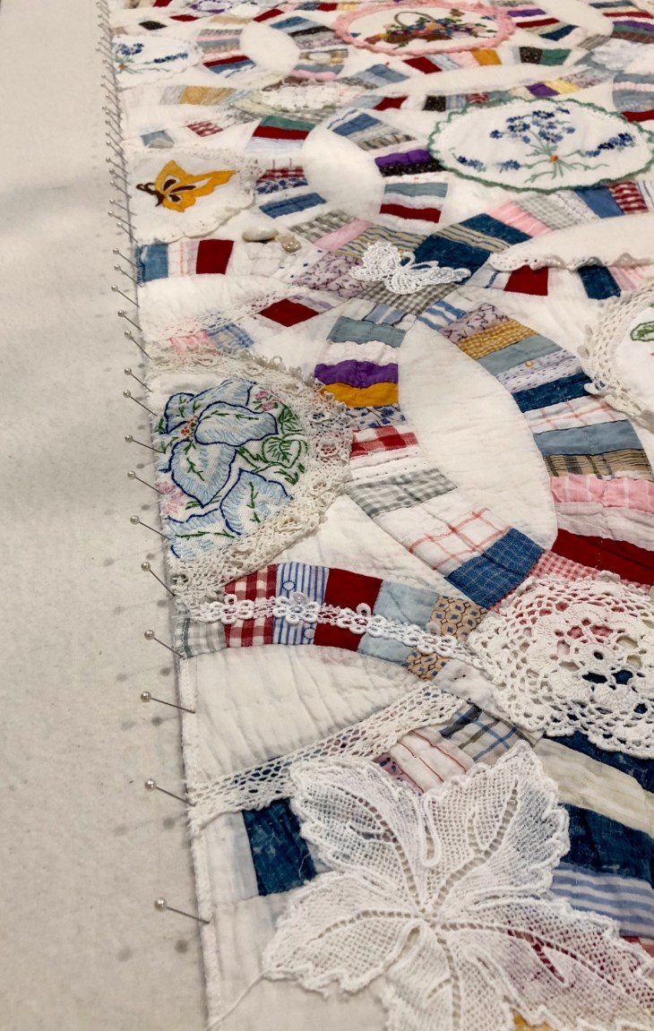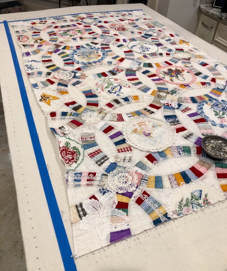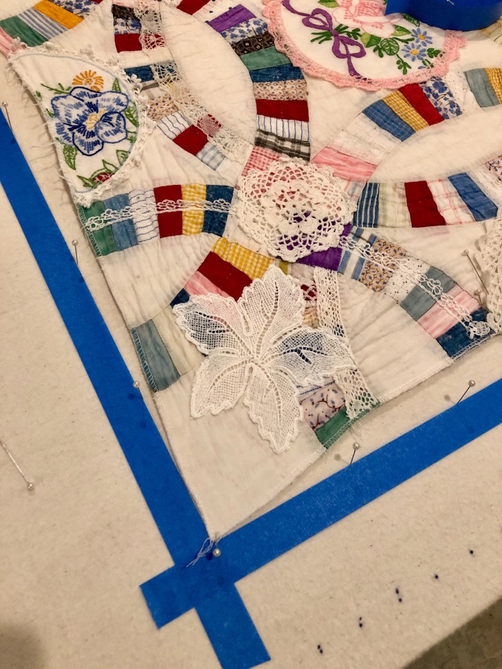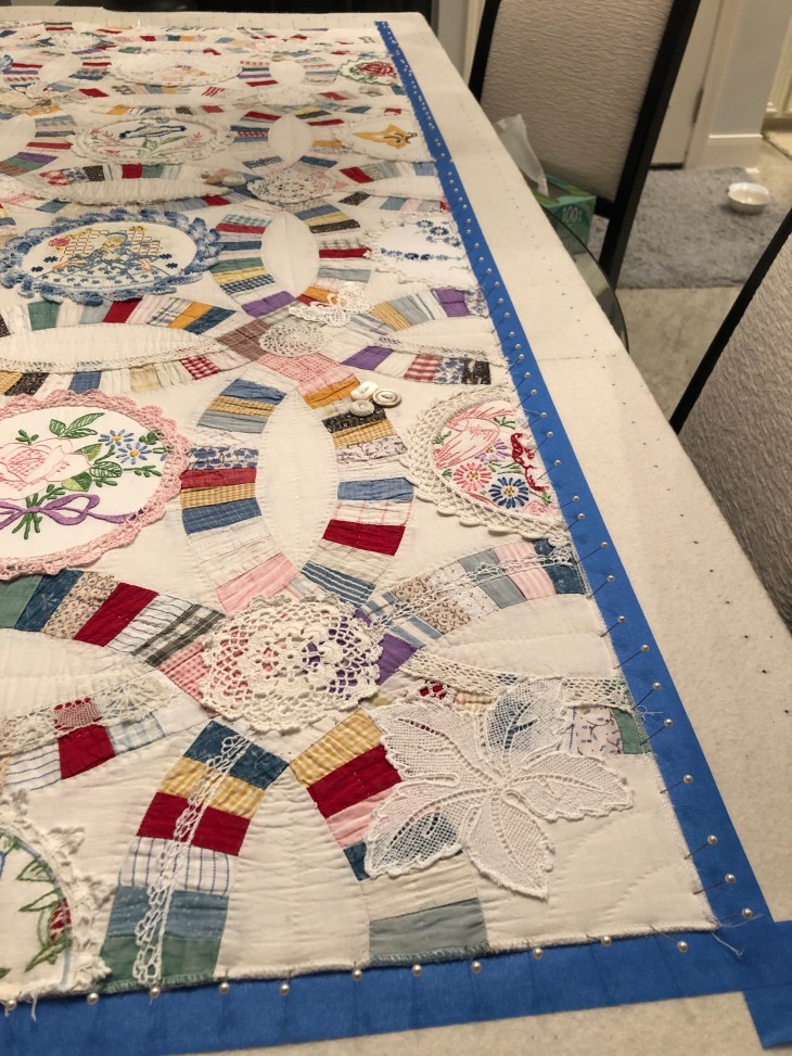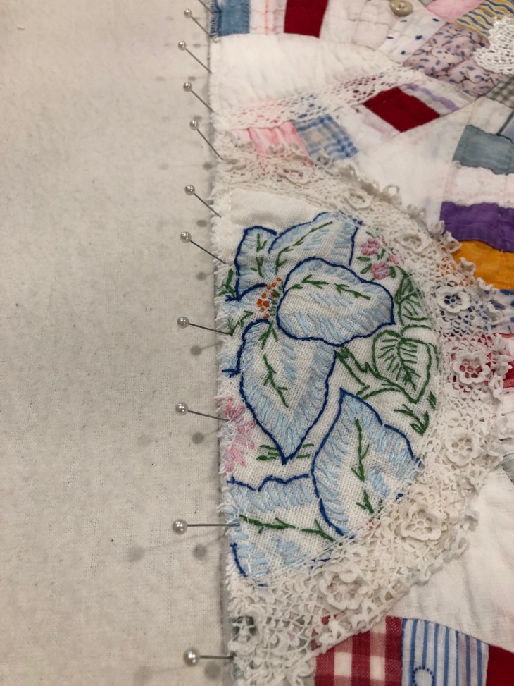 The embellishments are all added, everything is machine stitched in place and it’s time to deal with the “wavy” edges. This quilt I’m sure has been laundered many many times. In the laundering process it has shrunk. When I serged the edges after it was cut and the red binding was removed, the serging process “stretched” the piece almost back to its original size along only the outside. You can see the uneven/wavy edges in the picture below.