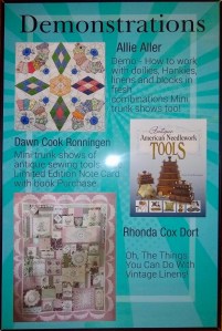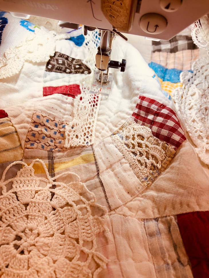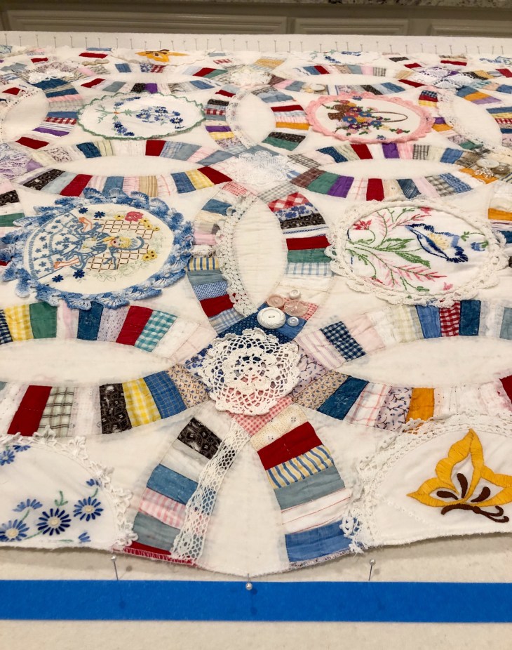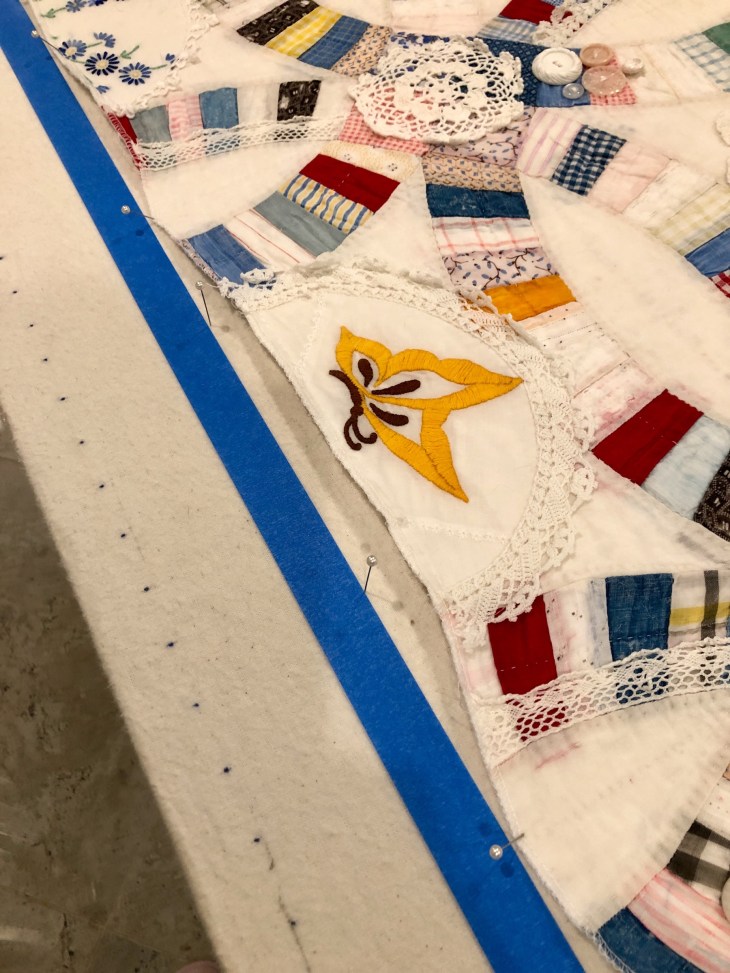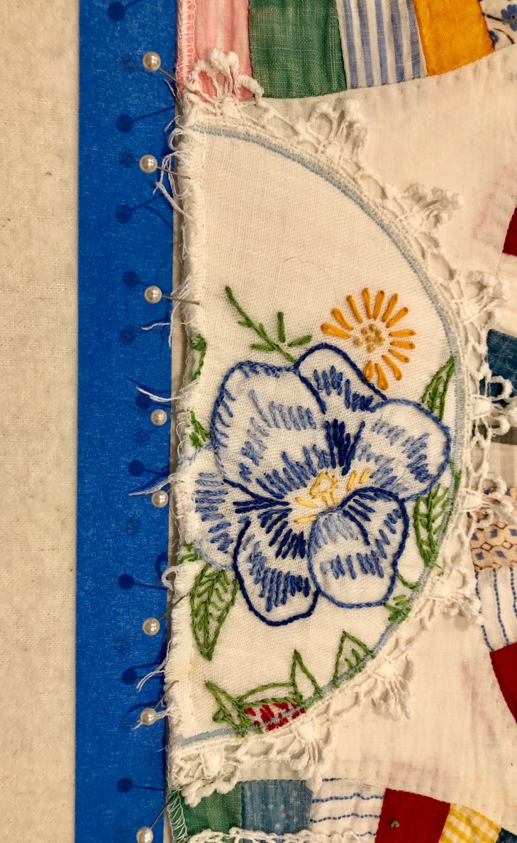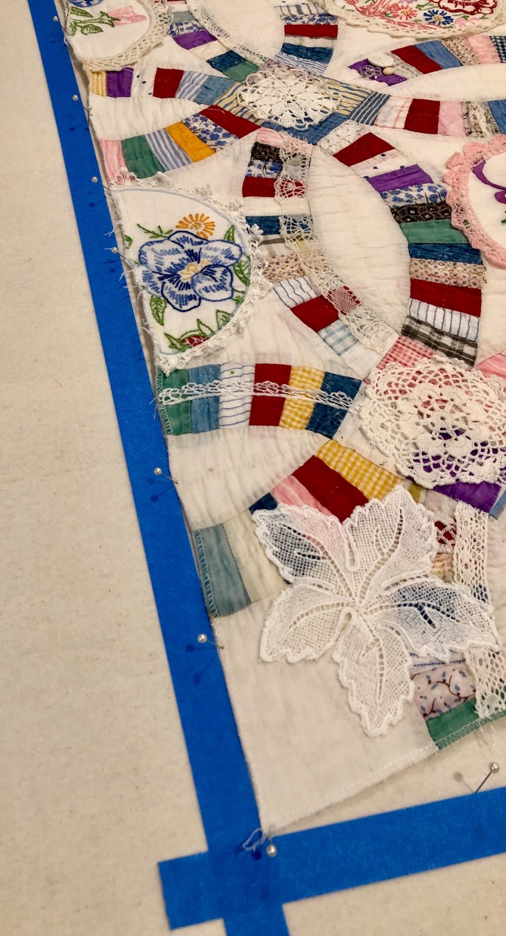 The embellishments are all added, everything is machine stitched in place and it’s time to deal with the “wavy” edges. This quilt I’m sure has been laundered many many times. In the laundering process it has shrunk. When I serged the edges after it was cut and the red binding was removed, the serging process “stretched” the piece almost back to its original size along only the outside. You can see the uneven/wavy edges in the picture below.