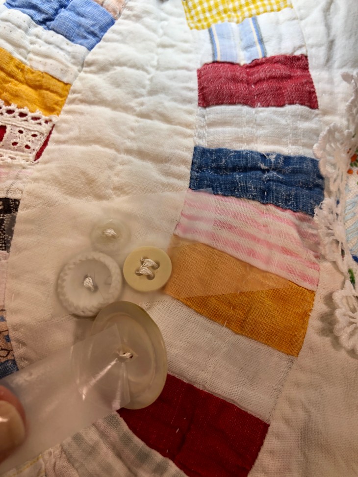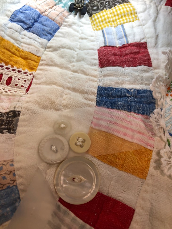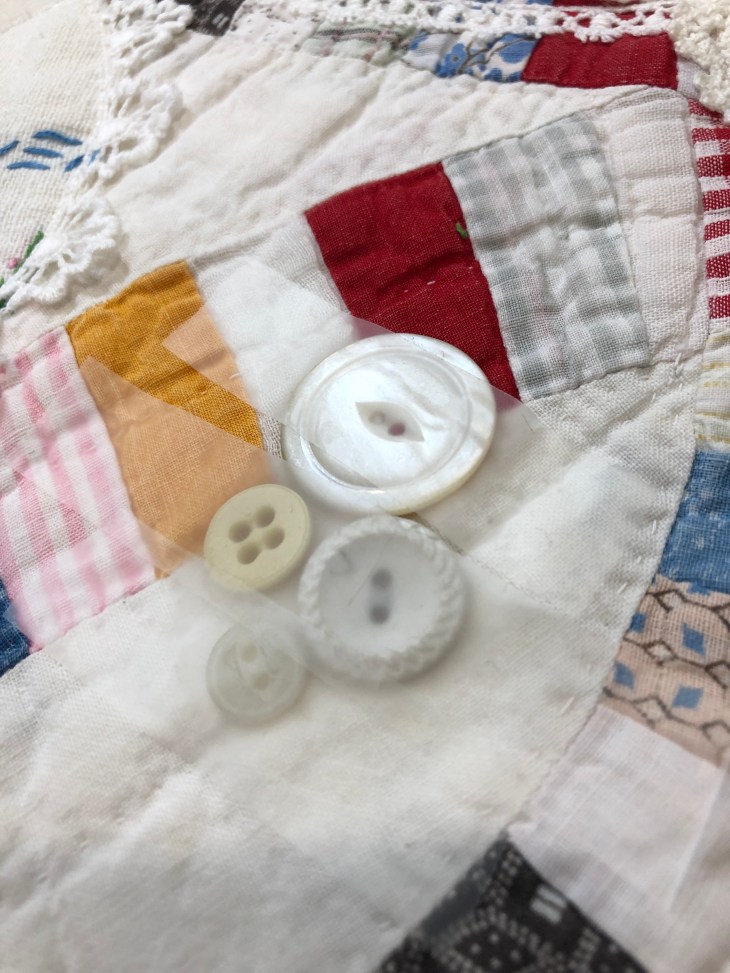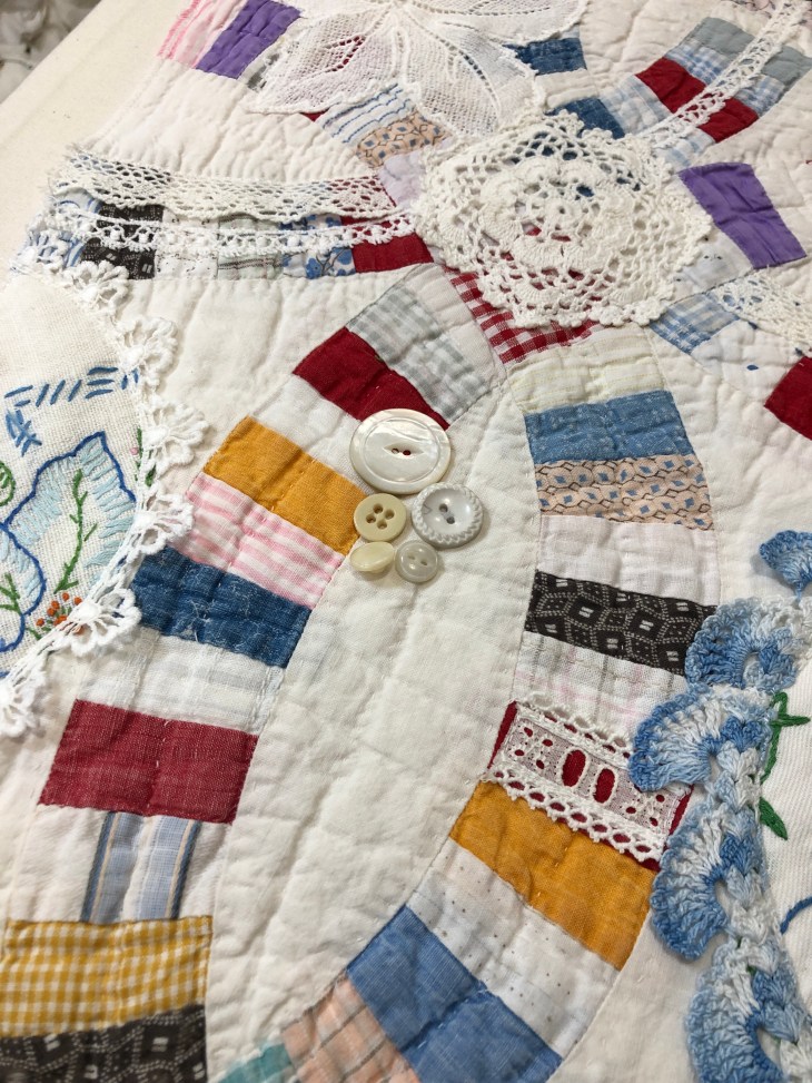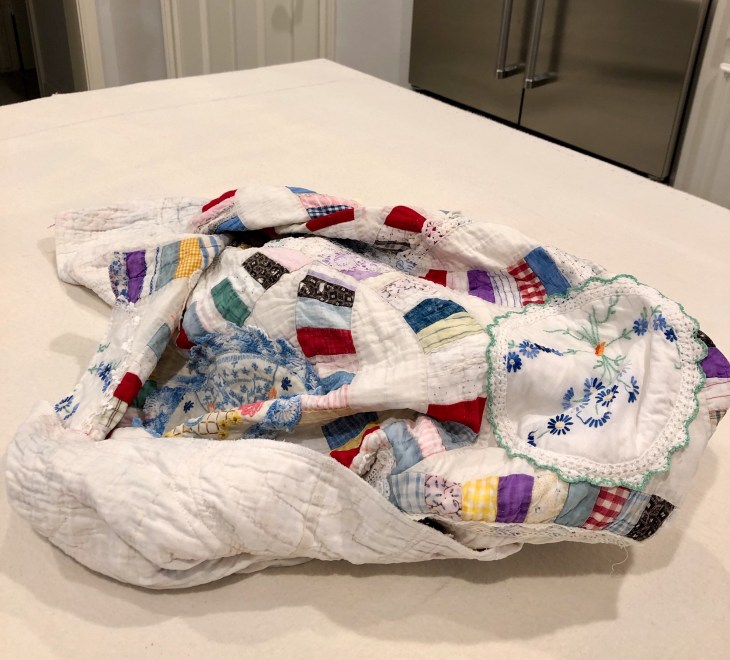But first, the quilt/throw needs a trip through the washing machine. I selected the Hand Wash cycle, no detergent, cold water wash and rinse, light spin. I did put about 1/4th cup of distilled vinegar in the fabric softener dispenser. If you haven’t used distilled vinegar with your vintage linens, try it next time, I think you’ll be pleased.