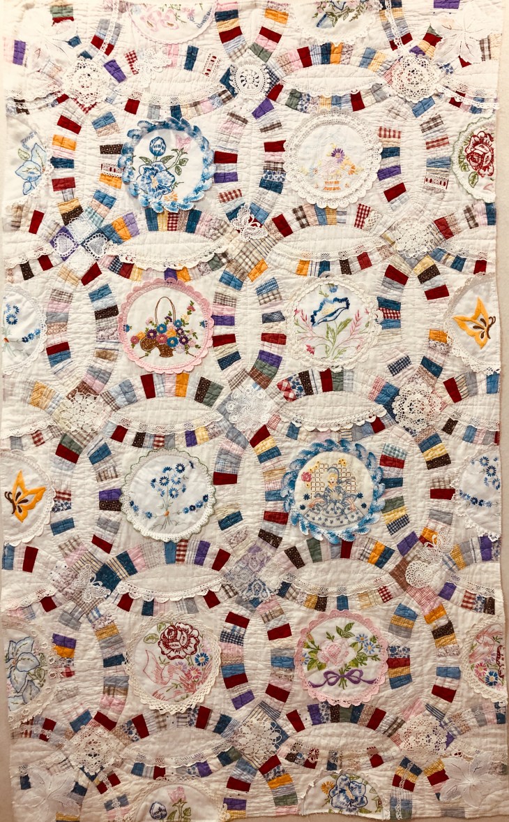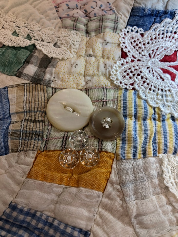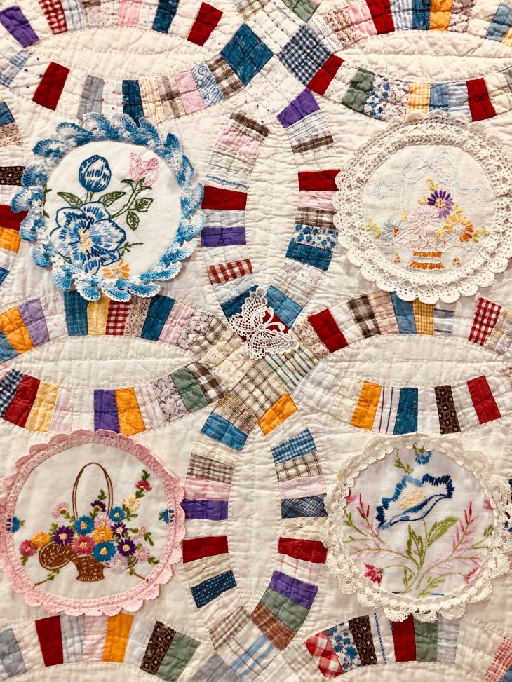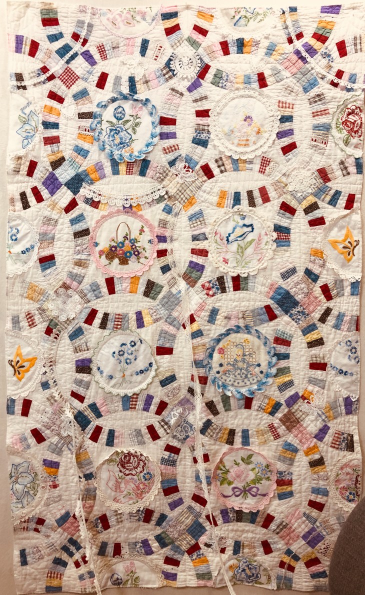 But first, the quilt/throw needs a trip through the washing machine. I selected the Hand Wash cycle, no detergent, cold water wash and rinse, light spin. I did put about 1/4th cup of distilled vinegar in the fabric softener dispenser. If you haven’t used distilled vinegar with your vintage linens, try it next time, I think you’ll be pleased.