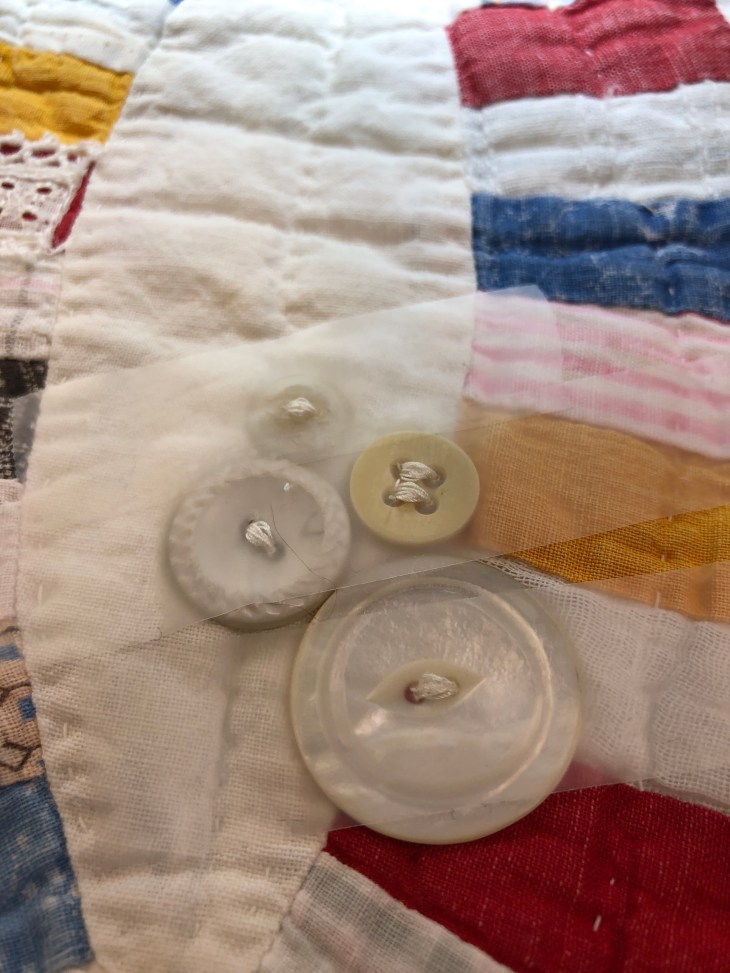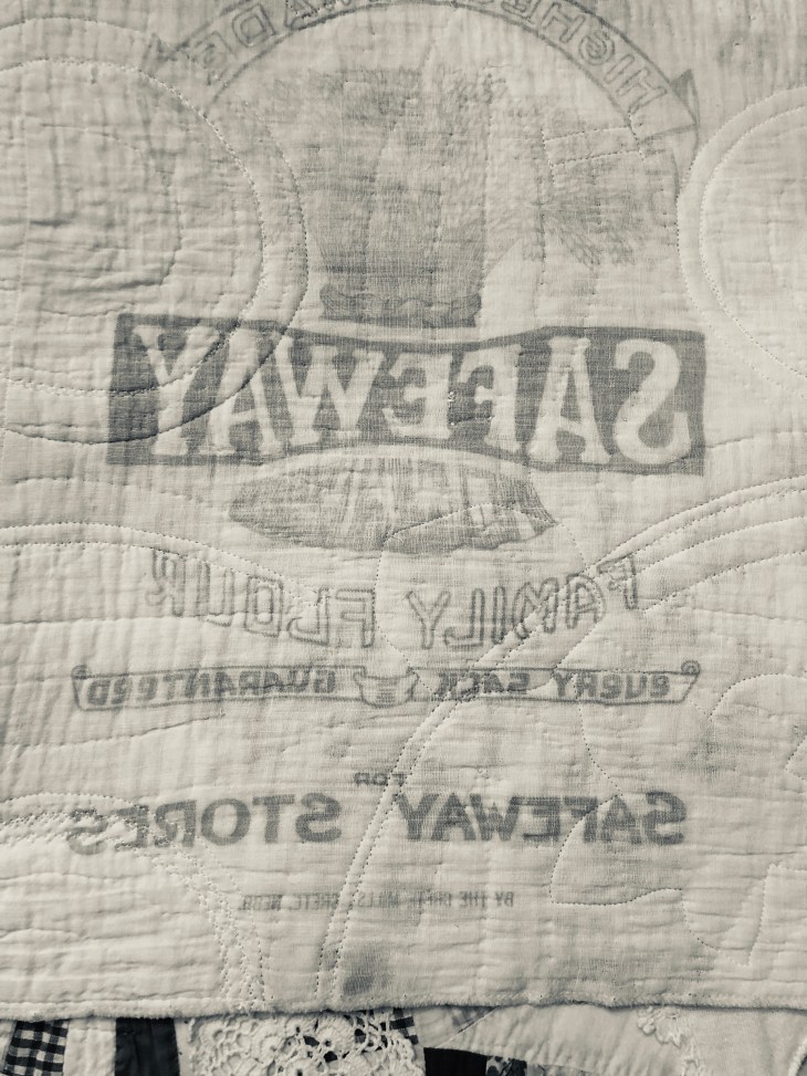 Remember when I talked about the back fabric being several grain/feed sacks sewn together and turned “print side in”? Here are a few pictures showing these joined sacks.
