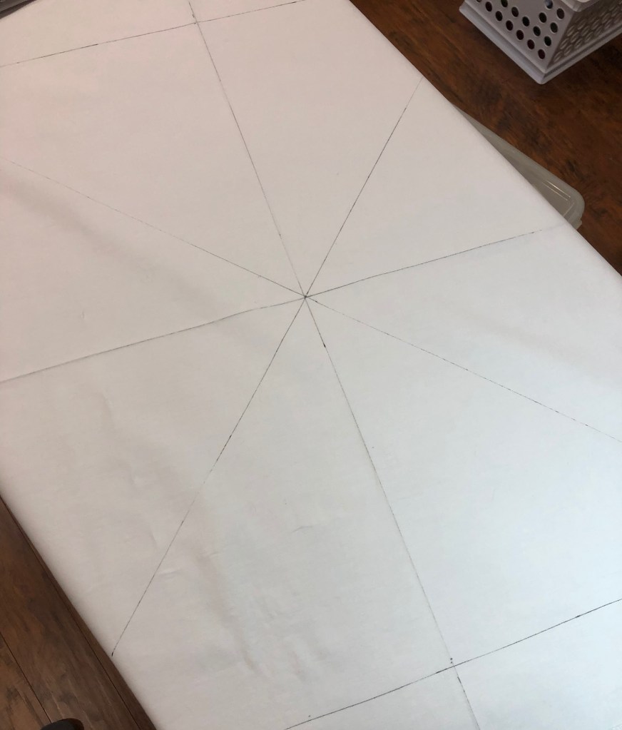With a finished 24” square as my goal I laundered, starched and pressed a 32” piece of bleached muslin. Using a black Frixion pen I marked registration lines dividing the fabric into 8 equal sections, the outermost lines marking the needed square.