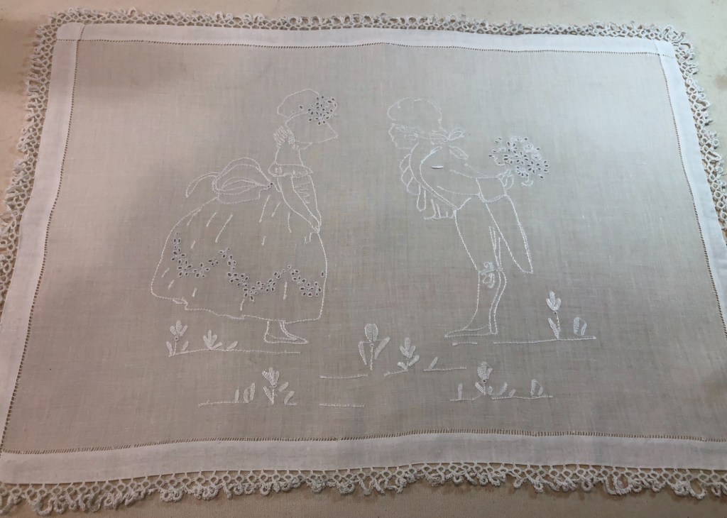 I started with this darling pillow cover, white on white hand embroidery and slightly off-white tatted edging. I bought this piece in an antique shop in Chappell Hill, Tx., brought it home and removed the damaged back, laundered and pressed the piece and set about deciding how to use it in a small quilt.