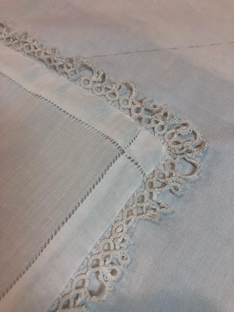 While it’s hard to see because I’m using Deco Bob 80 weight white thread, I did baste at the edge where tatting is attached the pillow cover.
