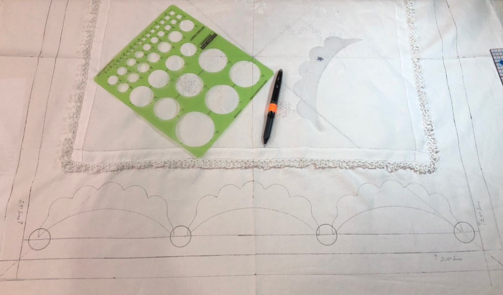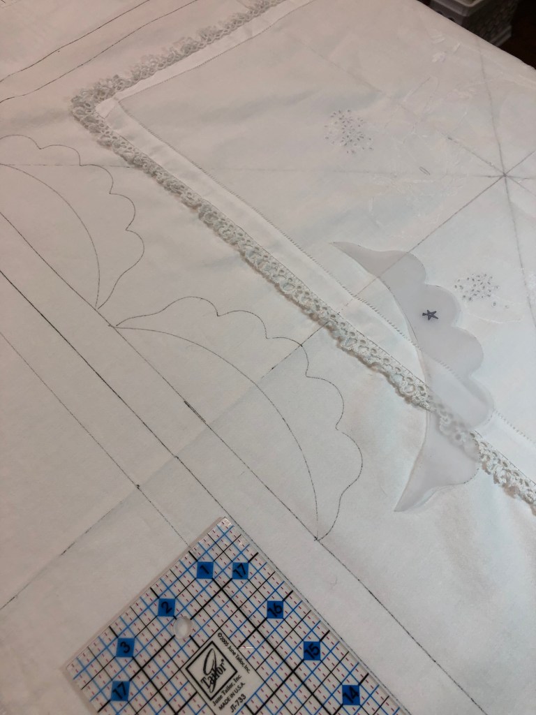 So I’ve reached the point where I have both the top and bottom swags drawn, their connecting circles are in place, the side curved lines are partially hidden by the tatting and the general swoop or curve on the anticipated quilted feathers have been sketched in.
