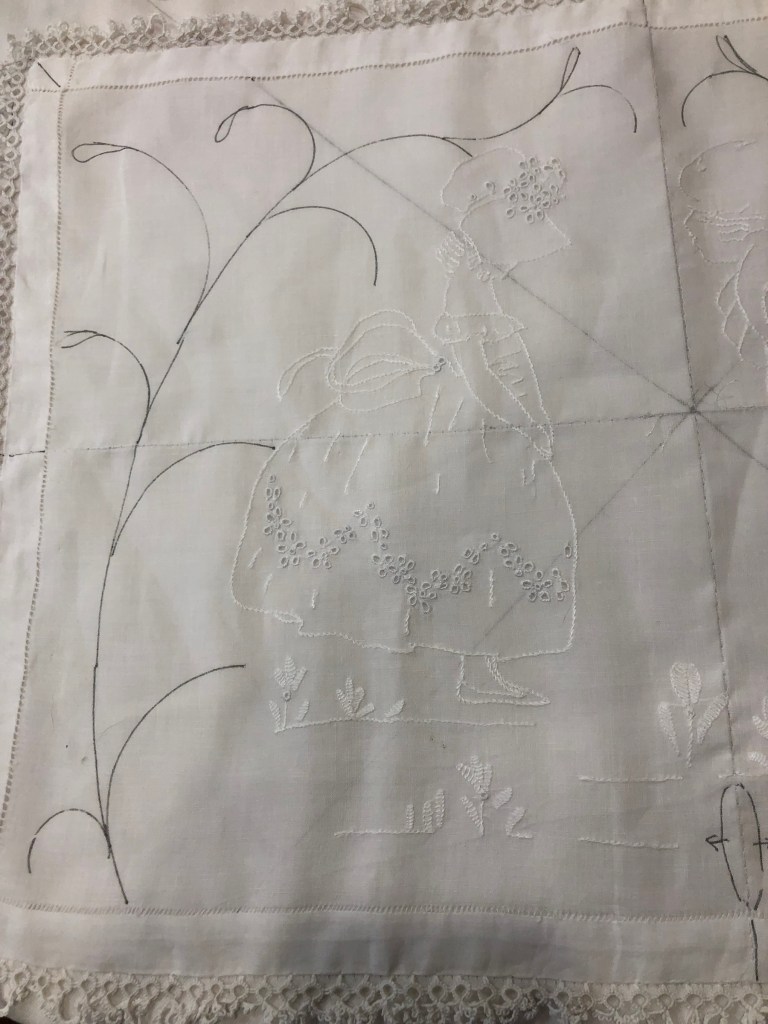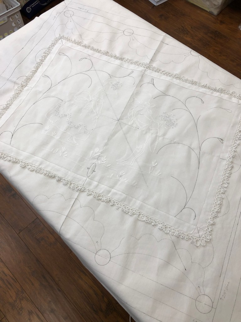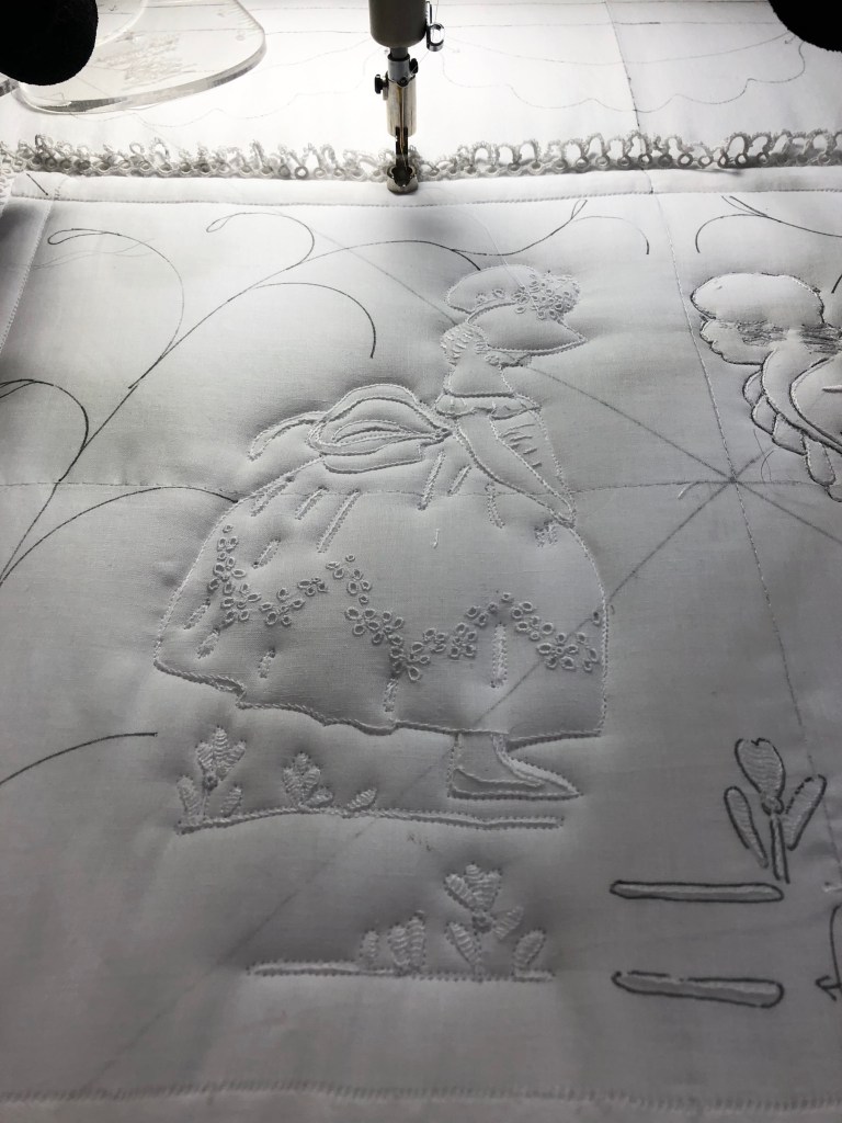 So it’s time to begin the actual quilting…but I have a problem. I cannot see the edge of the white embroidery on the white sheer fabric laying on the white bleached muslin. I tried by quilting around the girl but it was very difficult and I had quite a bit of quilting to pick out and redo. Frixion pen to the rescue. I outlined all the remaining embroidery and having the black line to follow made all the difference in the world.