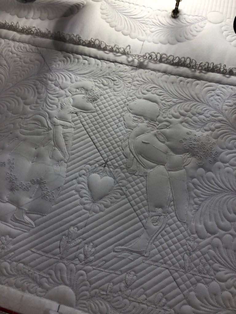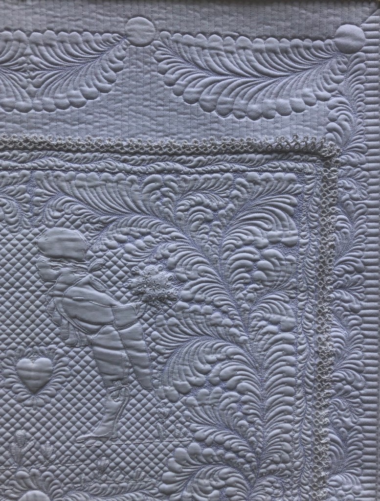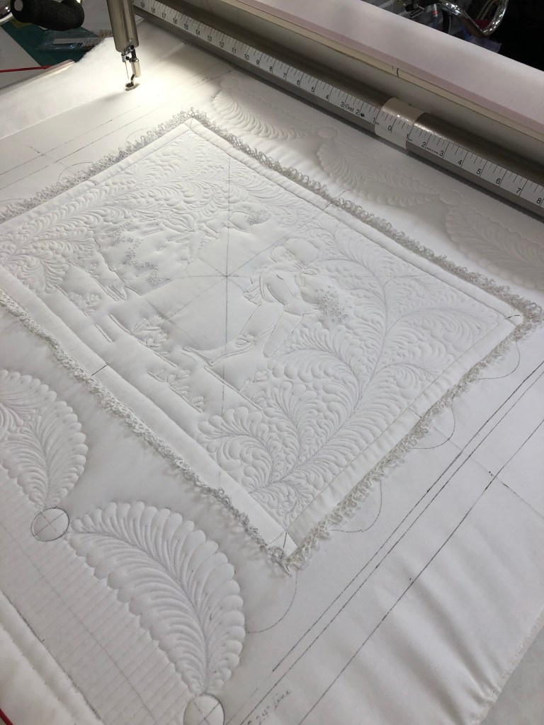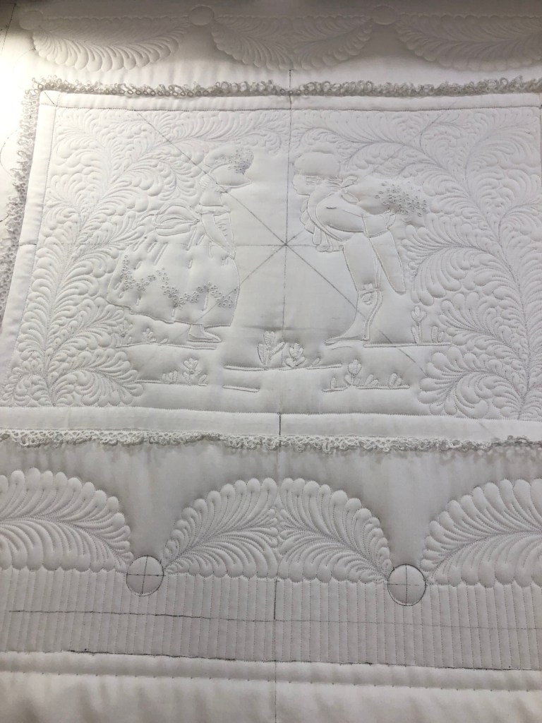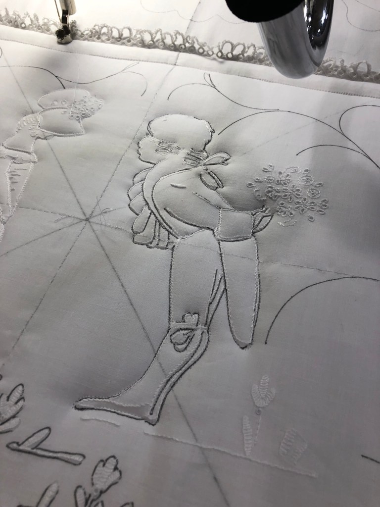At this point having quilted veins in the feathers on the swags I decide to do the same to the feathers around the boy and girl.