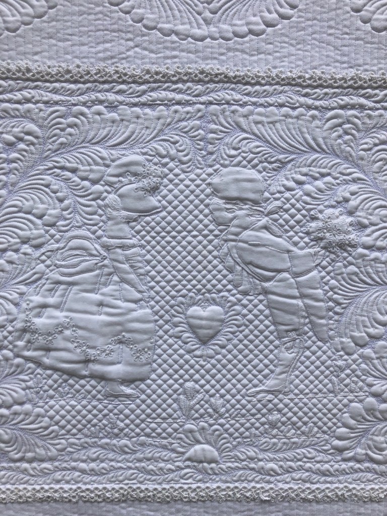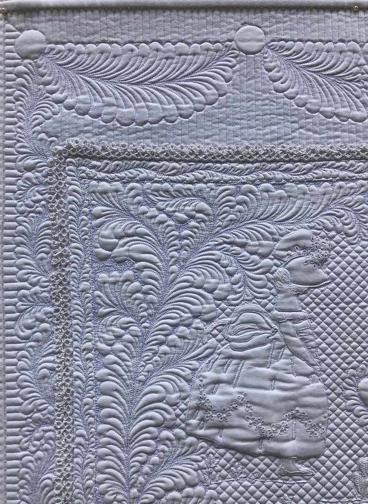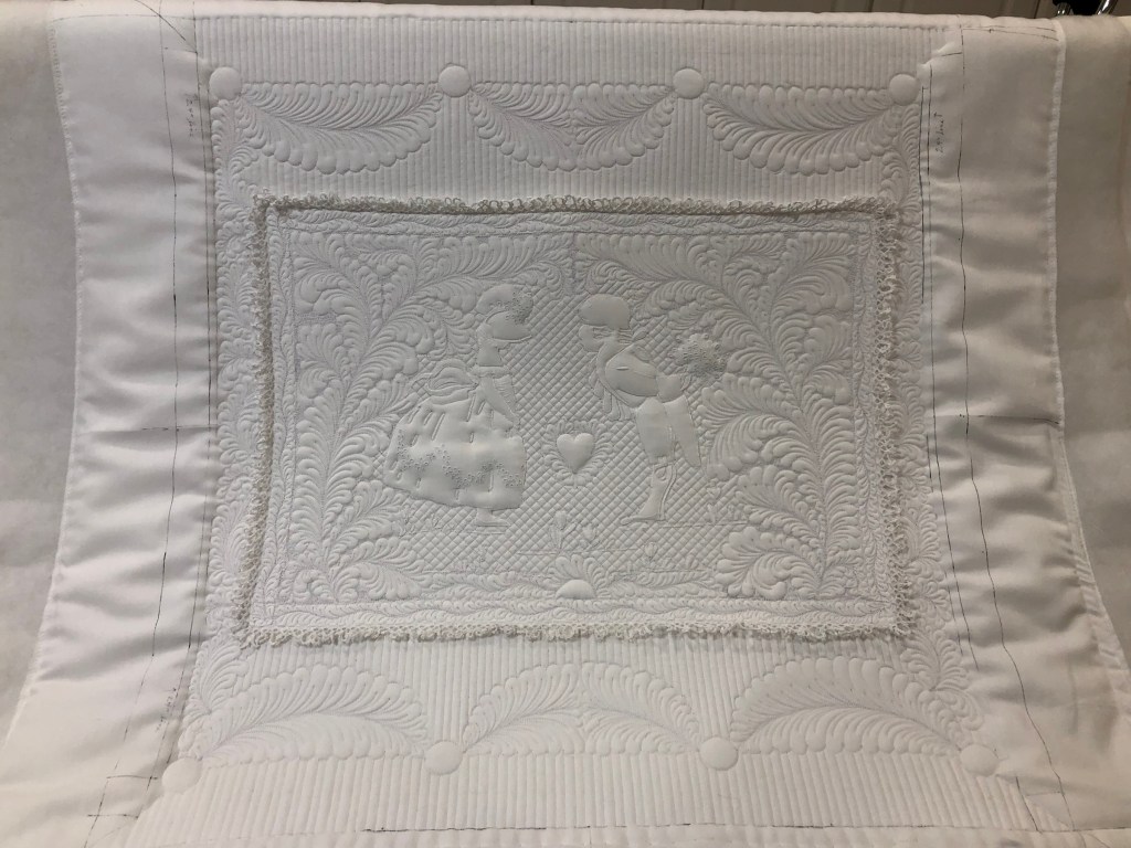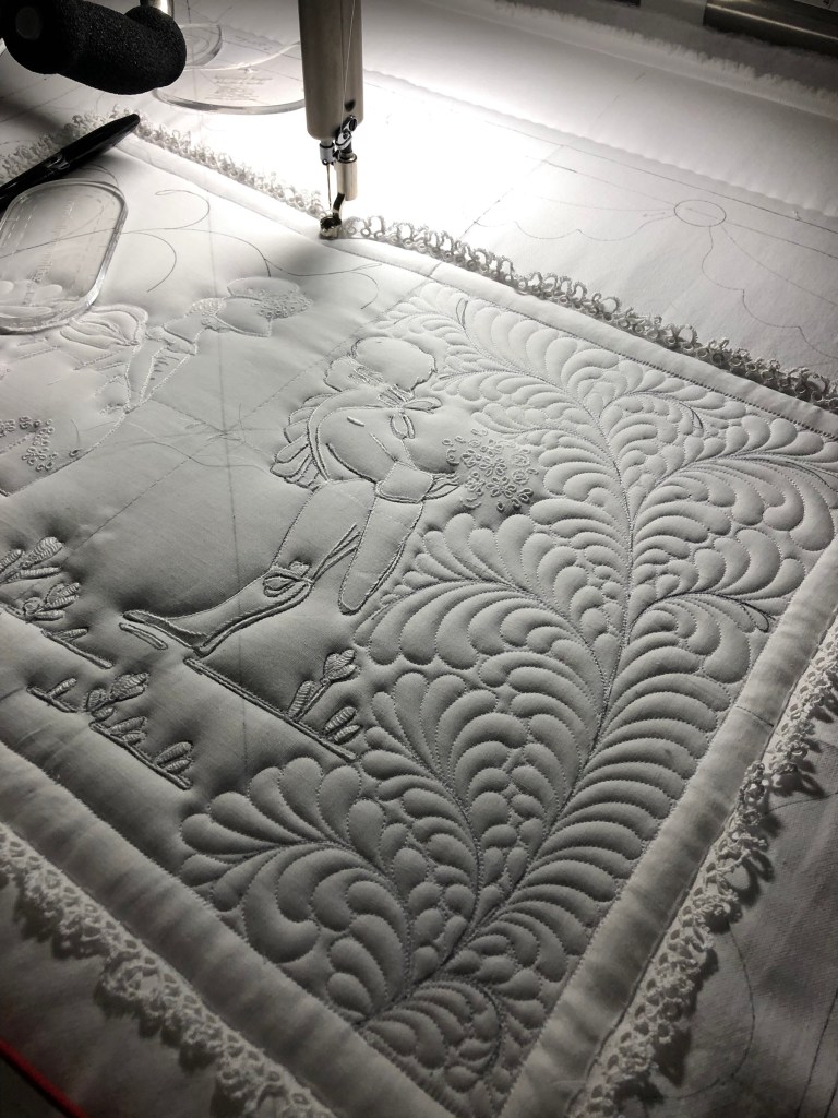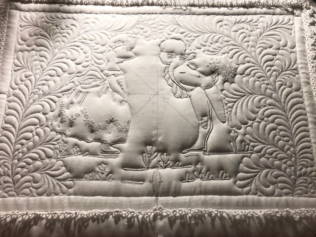 At this point having quilted veins in the feathers on the swags I decide to do the same to the feathers around the boy and girl.