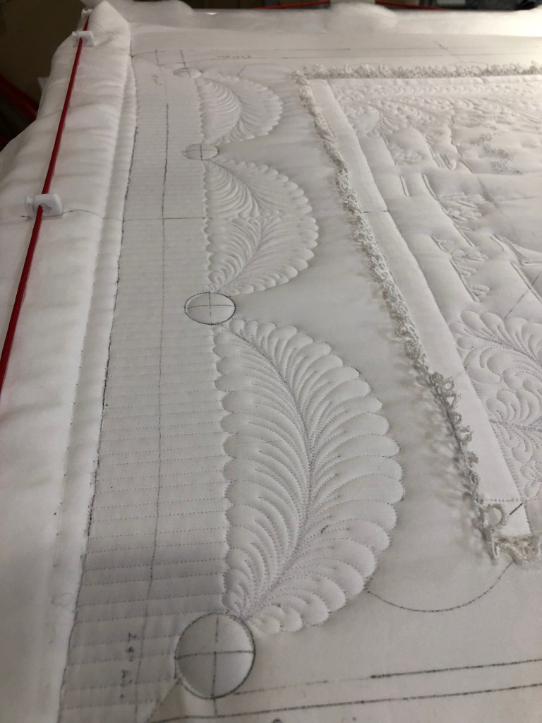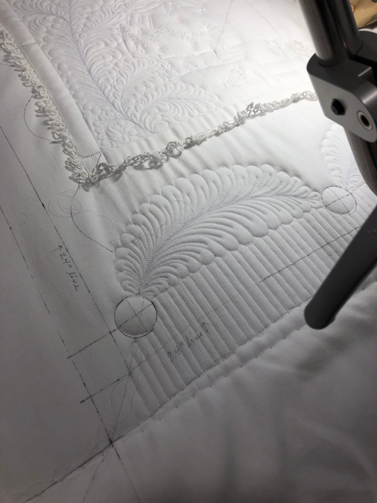 Just a closeup of where I’m intending to quilt feathers. By drawing a loop at the end of a curve I get a visual heads up of where I plan to stop quilting and head back down the curve to feather the other side.