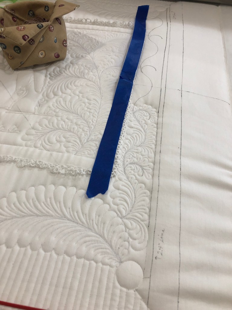 It’s time to tackle the undulating feathers on both the right and left side. Using the blue painters tape I am able to hold the tatting out of the way of the quilting.