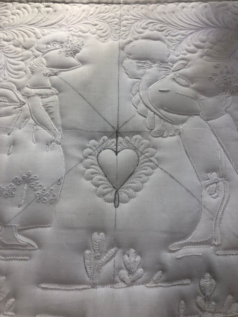 The heart is quilted and next came the crosshatching. Here’s how I feel about crosshatching…love the look, bored to pieces executing it.