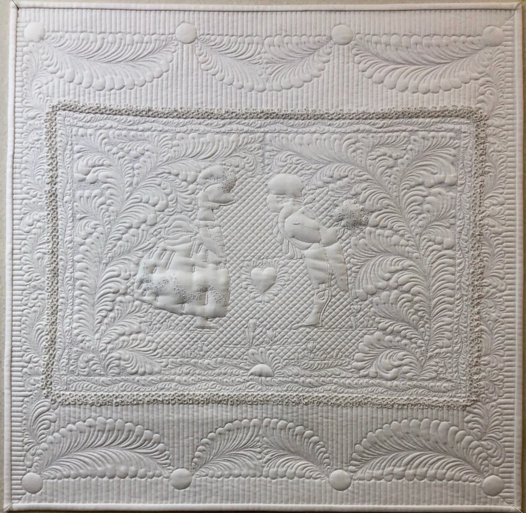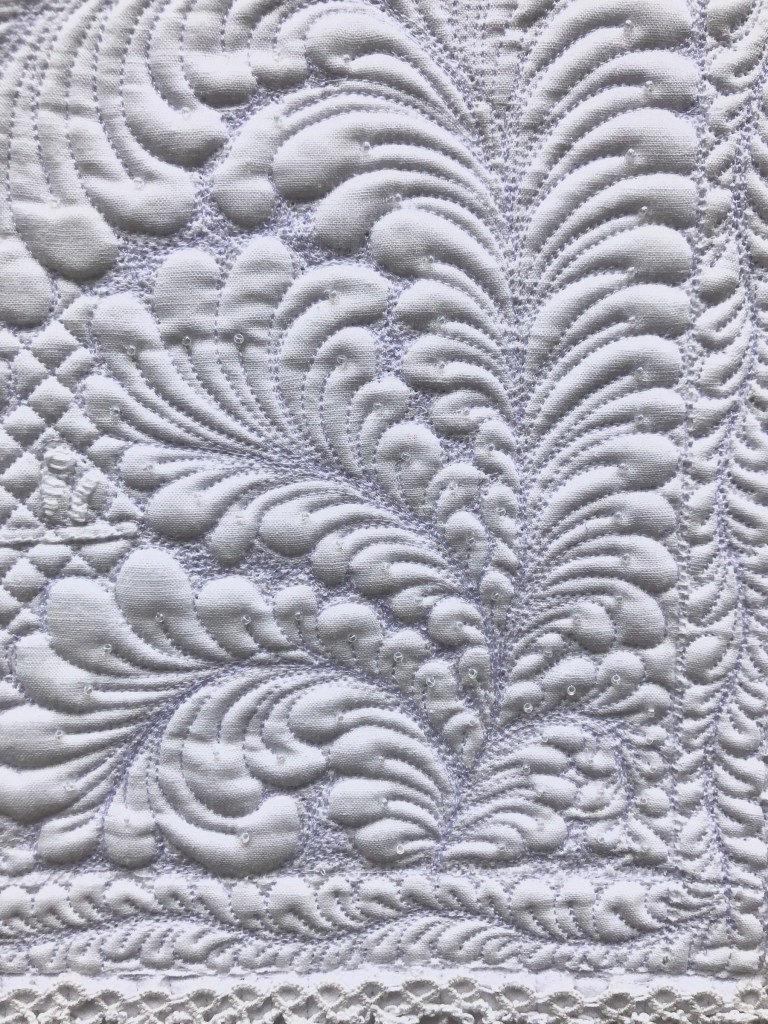 I used 2 layers of batting: Hobbs 80/20 white and their Tuscany Poly. The needle and bobbin thread is Deco Bob white (color number 104) 80 weight by Wonderfil Specialty Threads. The back fabric is Moda Classic in white. Finished to include the binding the piece measures 24” square and I spend a total of 12 hours doing the quilting.