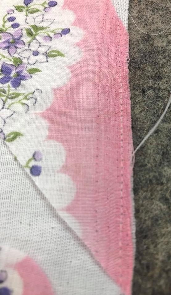 In order to give me the maximum amount of fabric, I unstitched the handkerchief hem and carefully pressed it. Of note: see the little black dots on the lower edge? The manufacturer prints these dots as cutting guides as the handkerchief was made.
