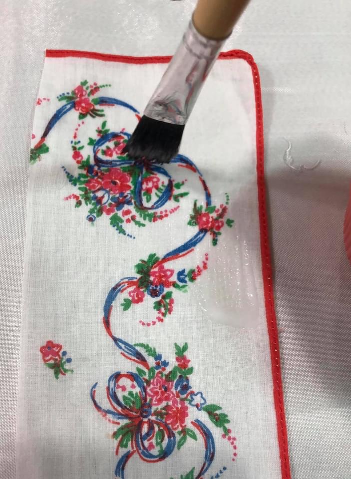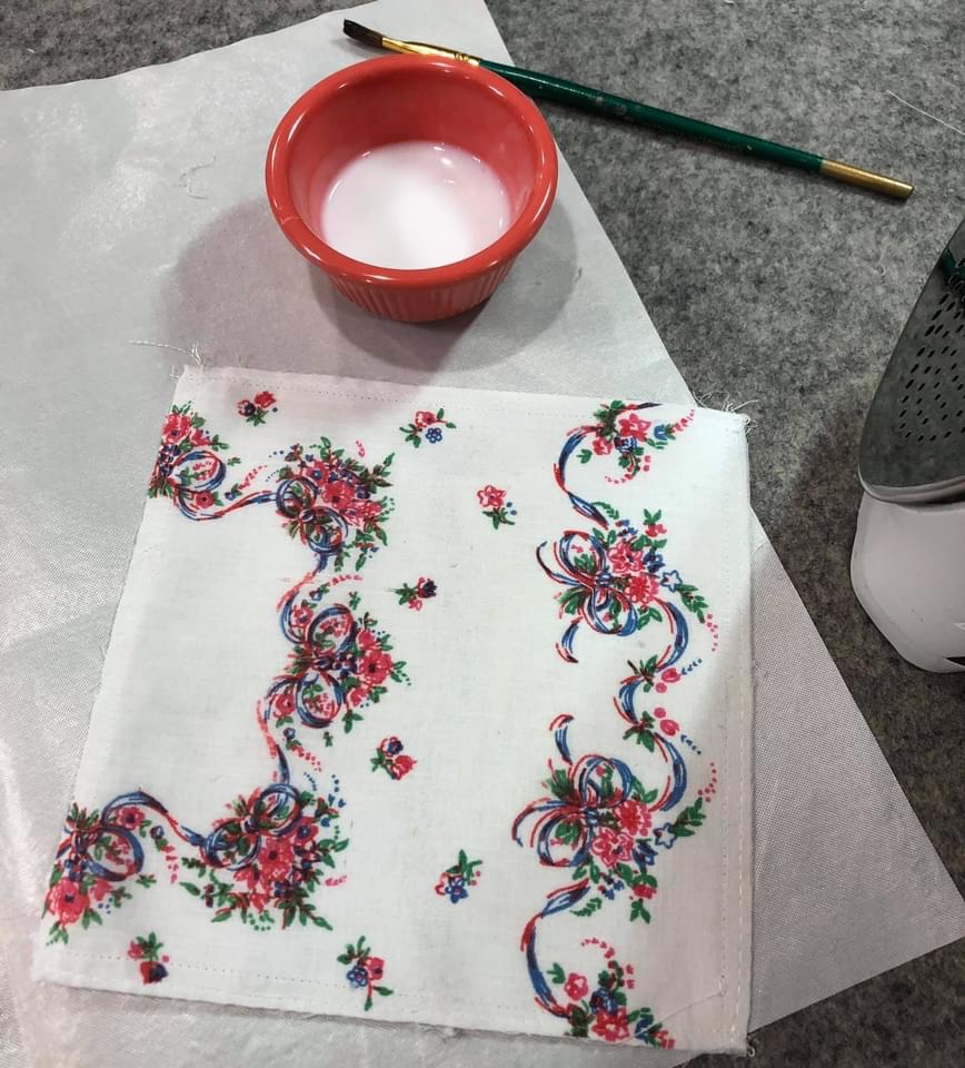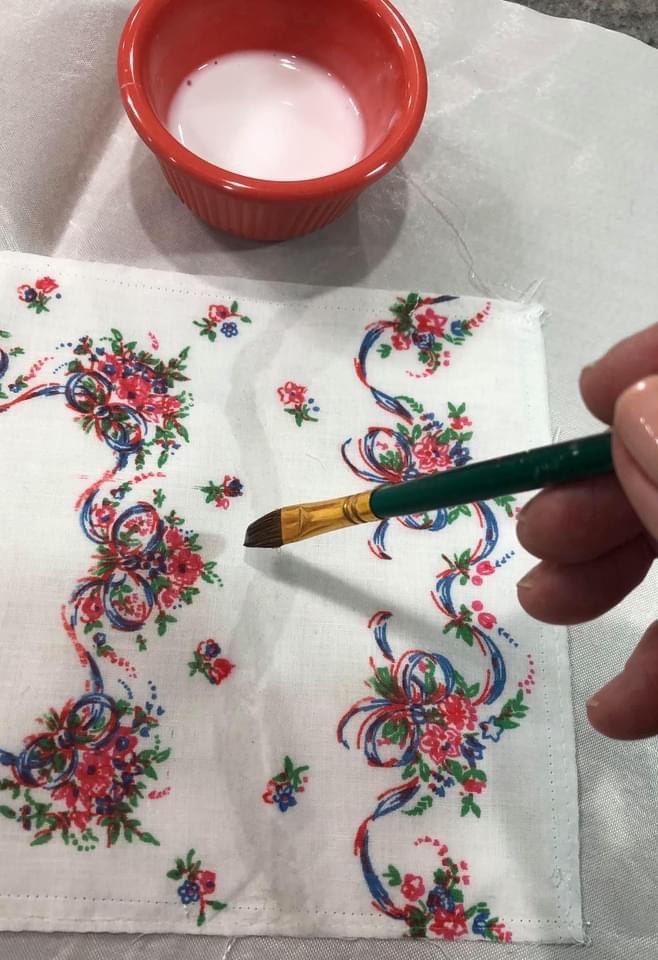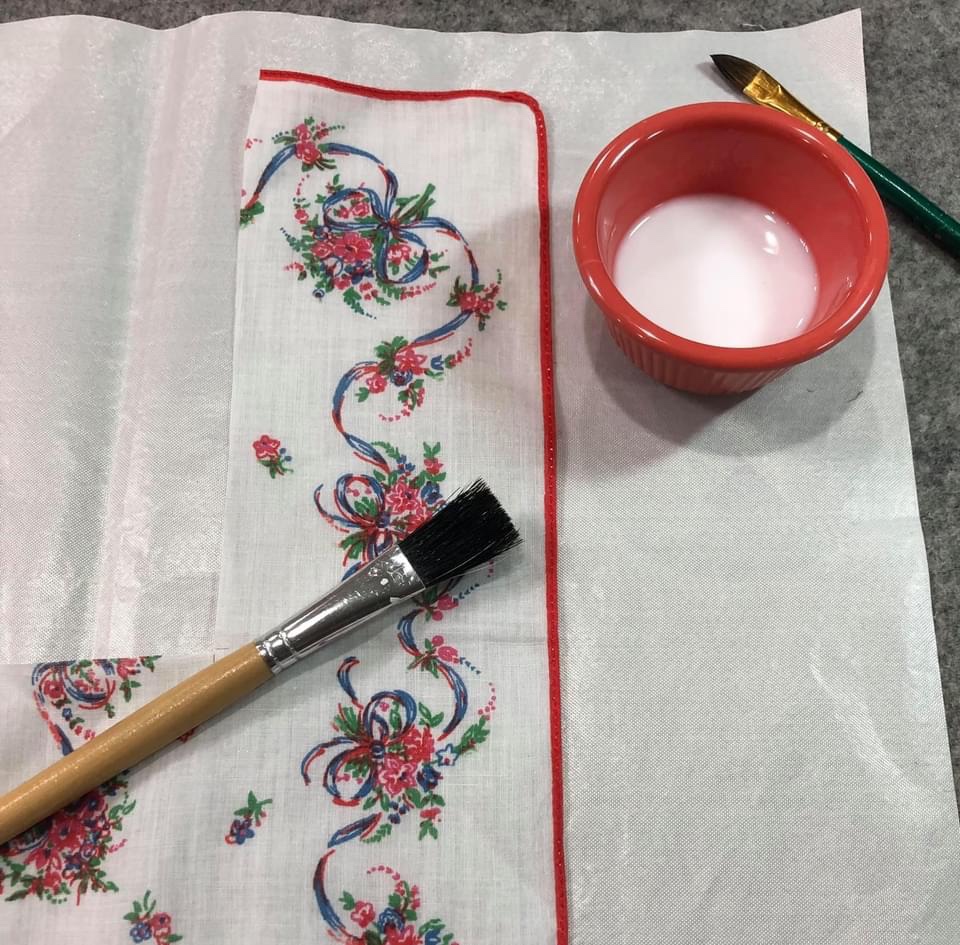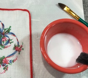 In this picture I have backed my vintage handkerchief with laundered and pressed bleached muslin. Using an artist paintbrush, I lightly wet the area with the water/glue mixture where I plan to stitch. No need to over saturate. Have you noticed I am working on a white Teflon pressing sheet? I want to protect my ironing board surface from the mix.