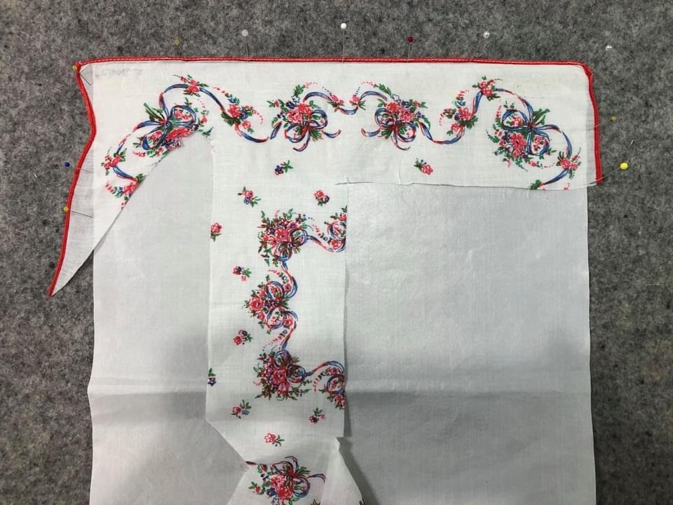 I can either carefully press or let my piece air dry. I have pinned the handkerchief as straight as possible to my wool pressing mat and because I was impatient I carefully dry pressed.
