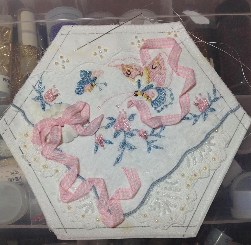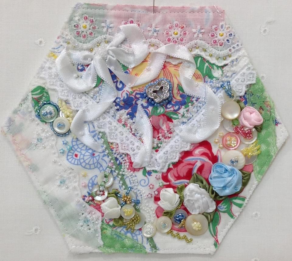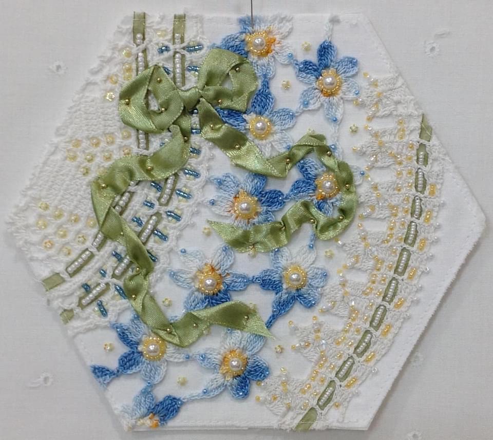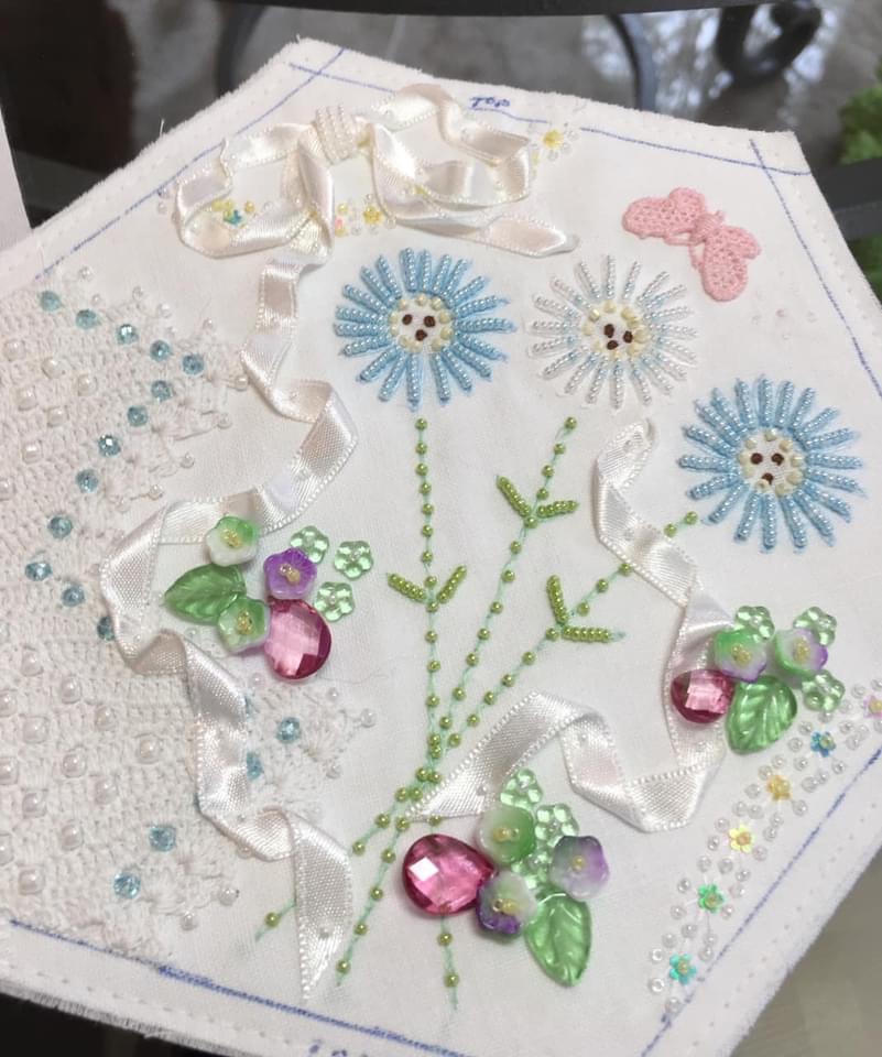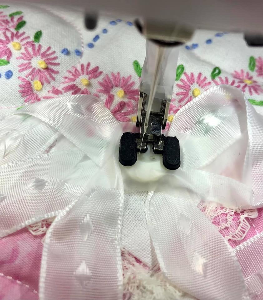 Does it bother me that I have used two different white ribbons in the same block? Not at all! There are no quilting embellishing rules at this point!