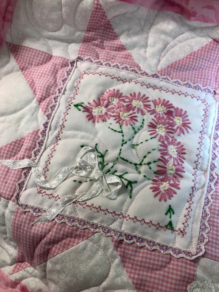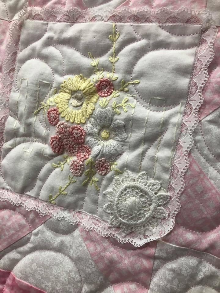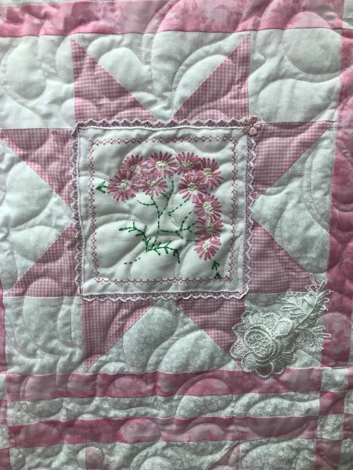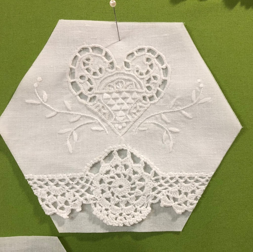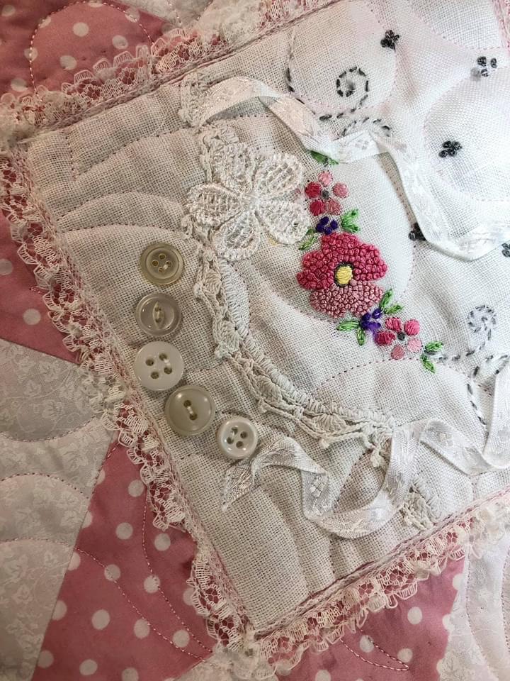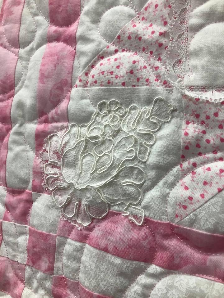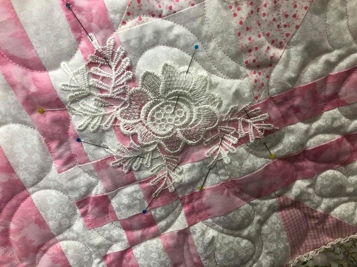 Another flower/leaf lace stitched to the quilt.