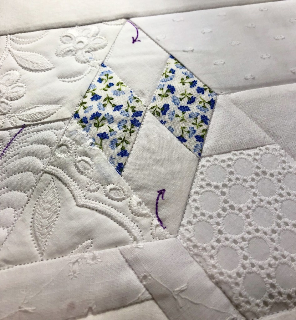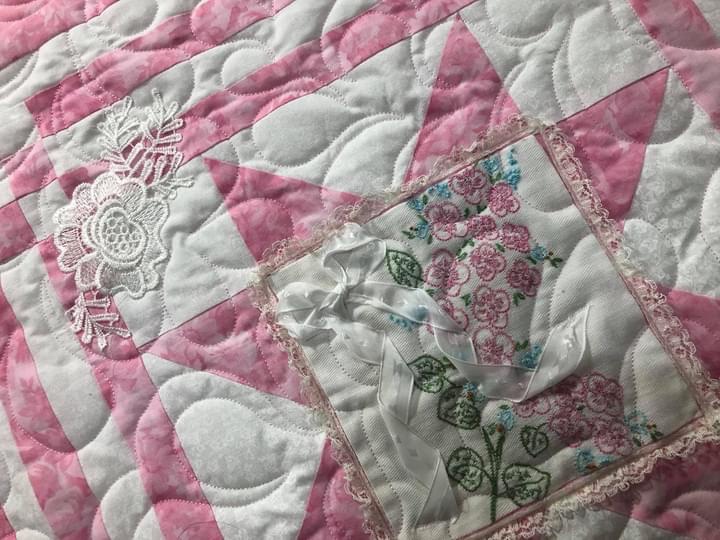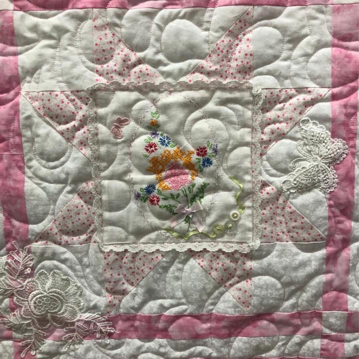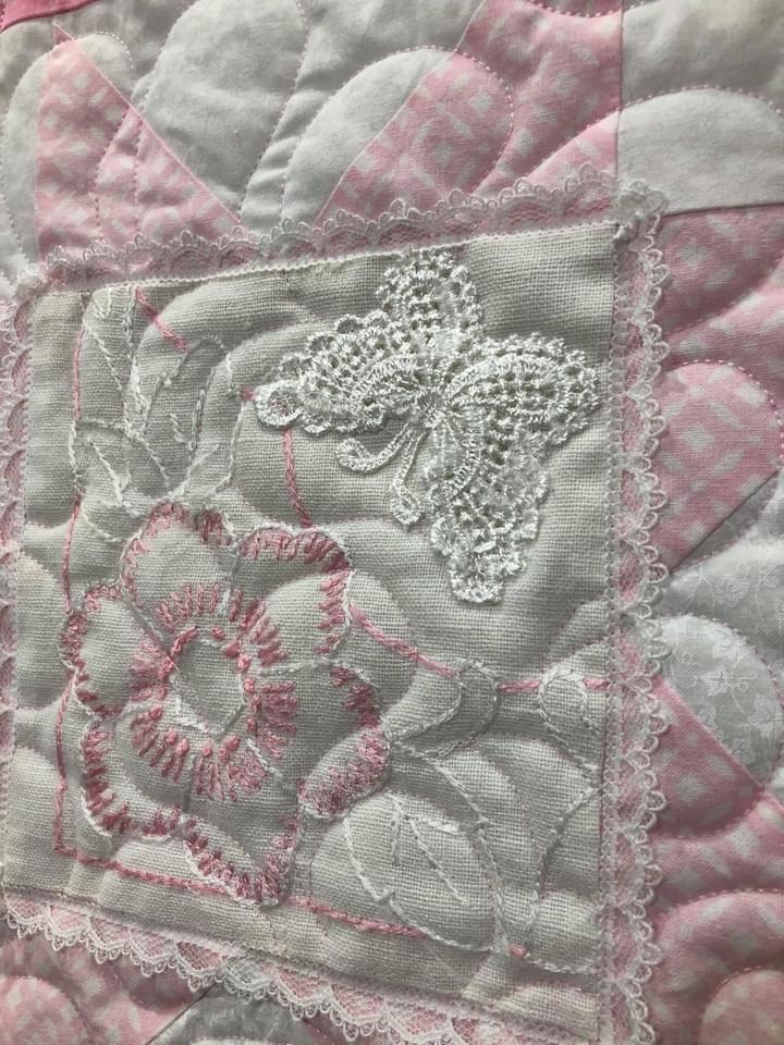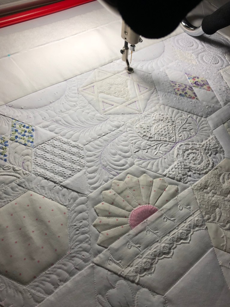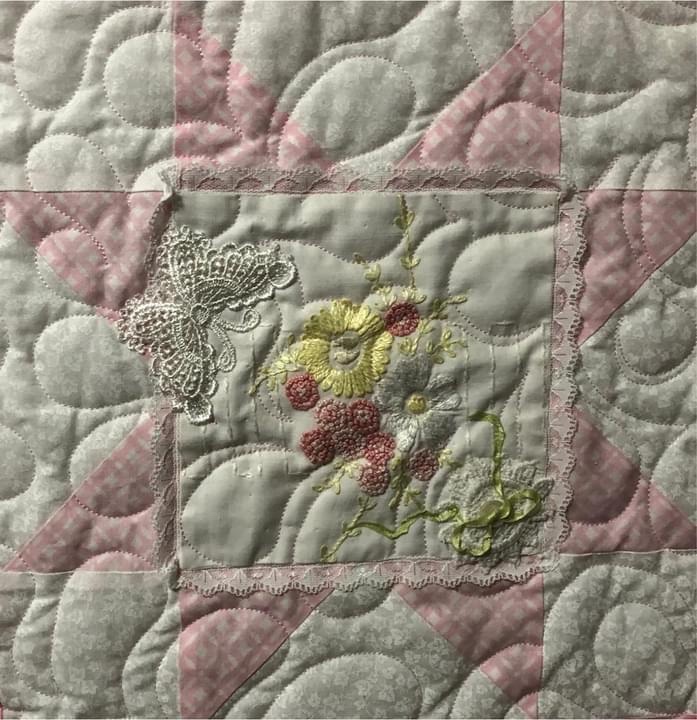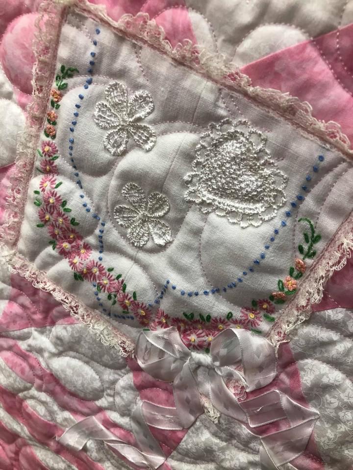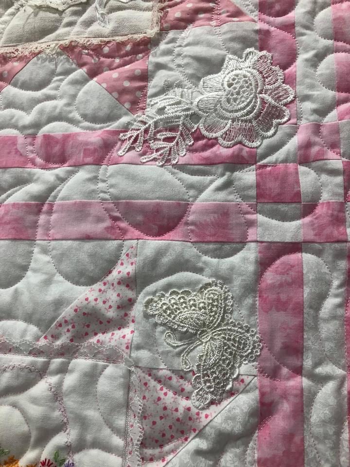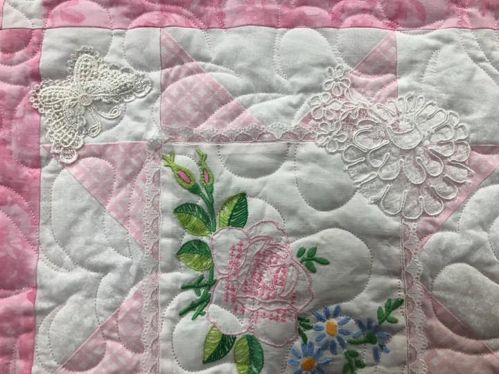Some people still are asking if these embellishments were added before or after quilting. Can you see that the longarm quilting is hidden below this lace motif? This tells you the lace was added after the quilting took place.