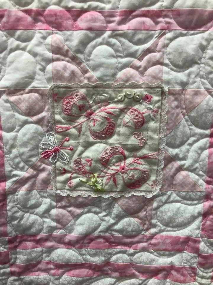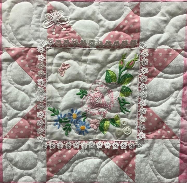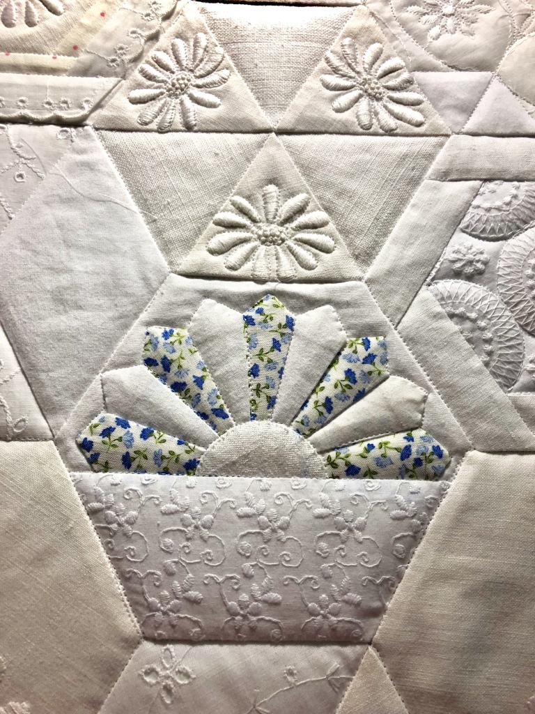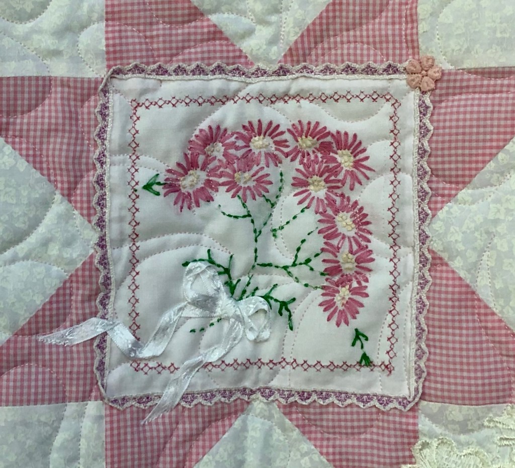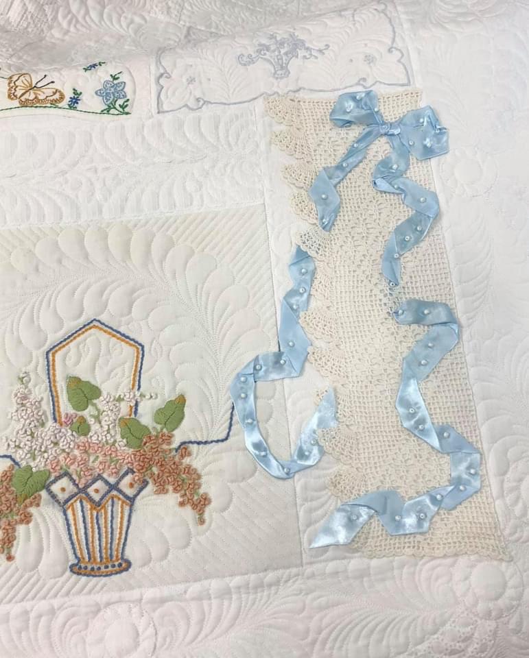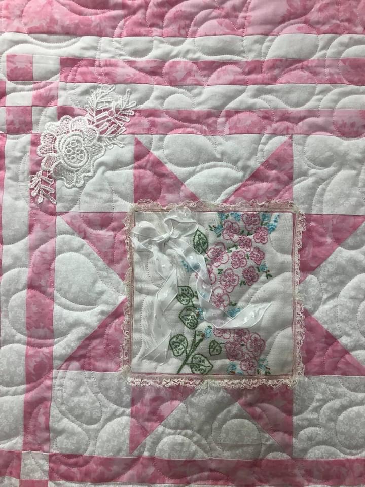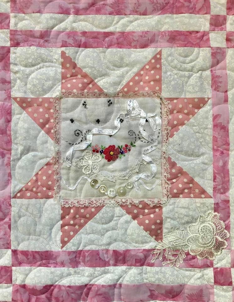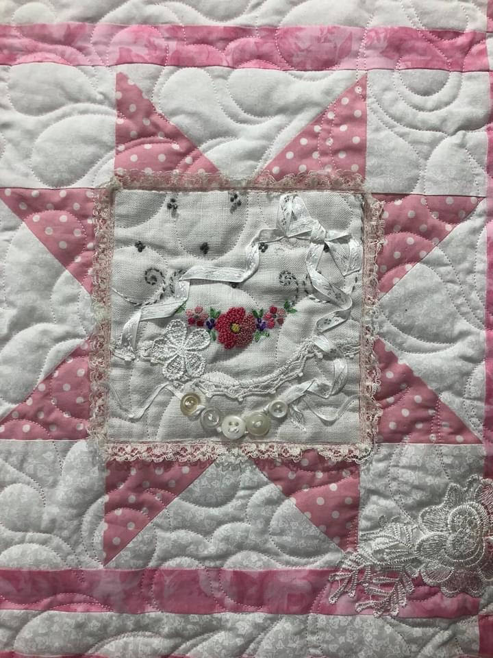Some people still are asking if these embellishments were added before or after quilting. Can you see that the longarm quilting is hidden below this lace motif? This tells you the lace was added after the quilting took place.