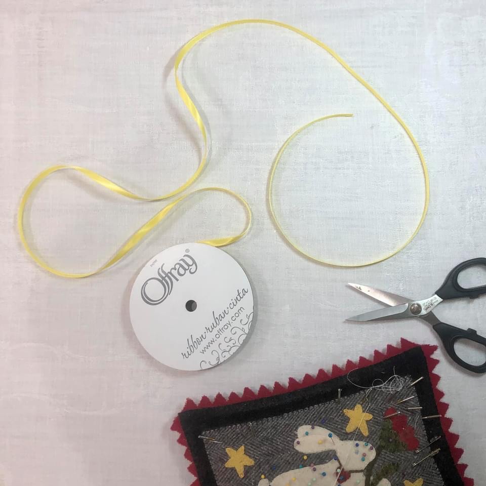 I’m using 1/8” wide white satin finish ribbon and a hand sewing needle with an eye large enough to handle the ribbon. I am not actually sewing the buttons with the ribbon, merely kind of weaving it up and down through two of the button holes. I do not sew the ribbon to the quilt top. Between each button I tie a simple knot for visual interest.