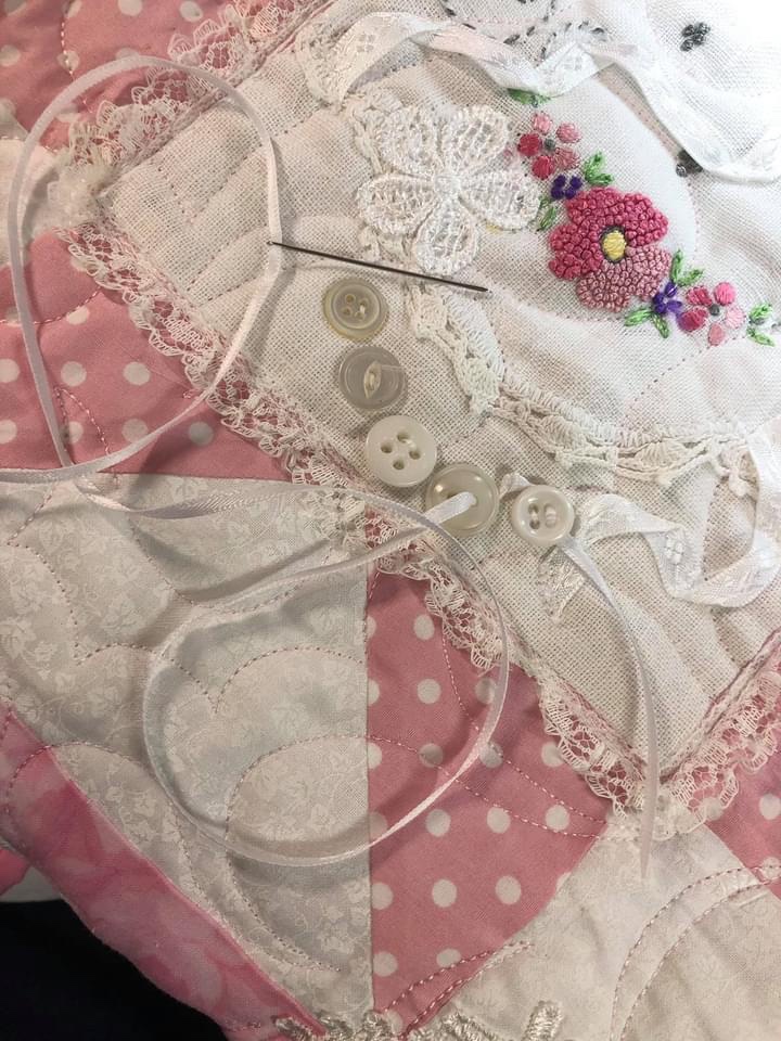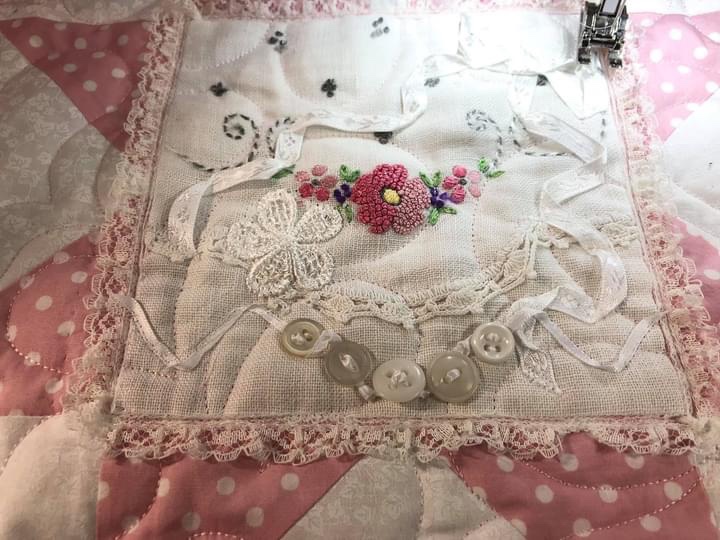 I like my white ribbon but I know I can give it some more character by adding a vintage button. And I’m going to use my sewing machine to sew the button on to the quilt.