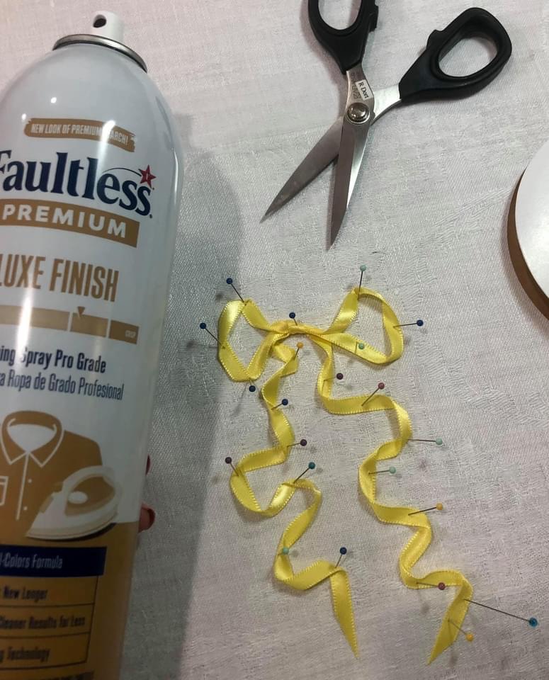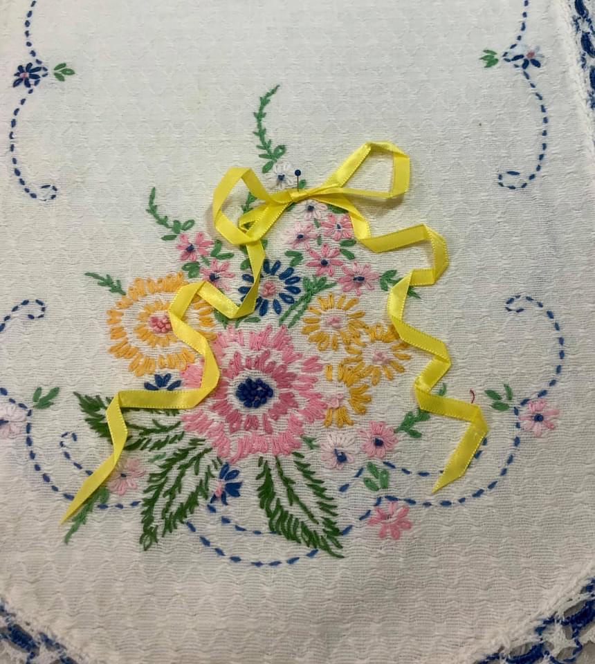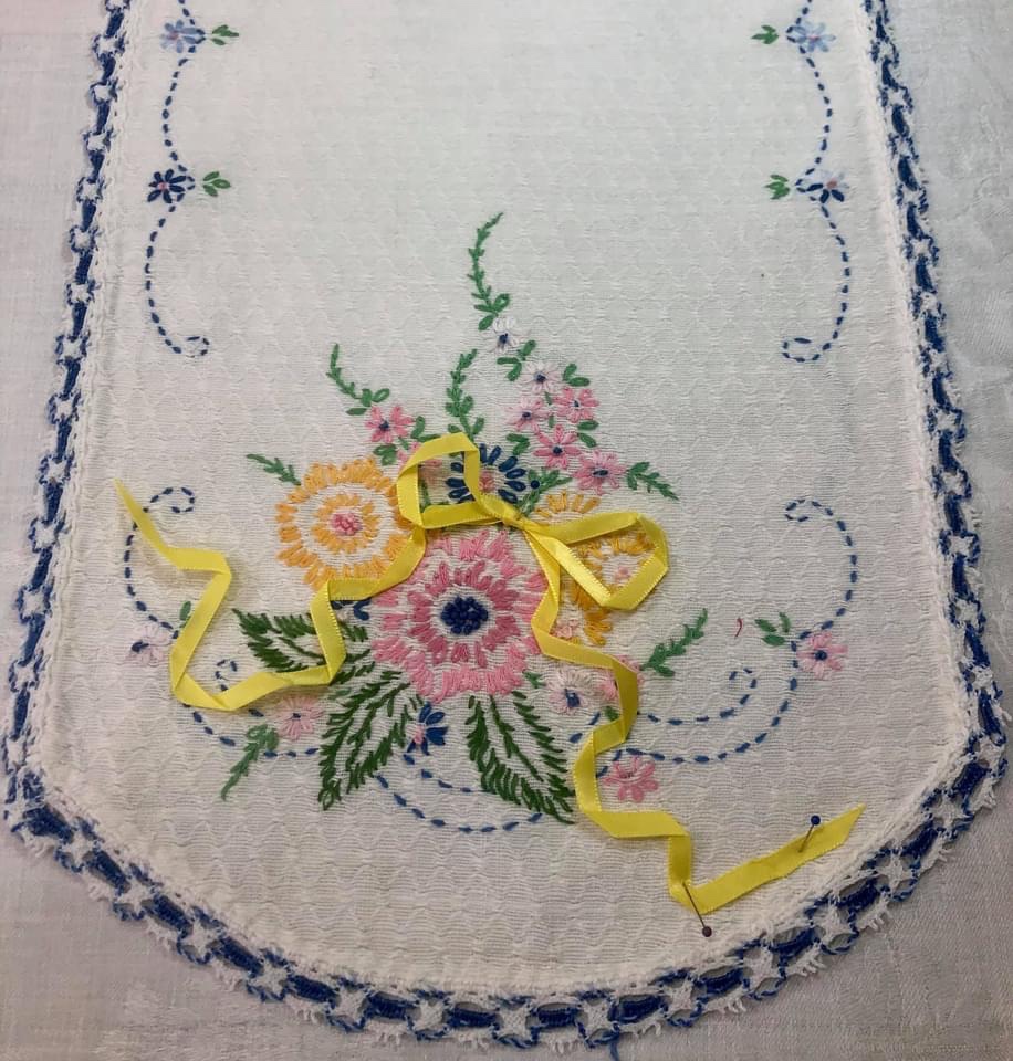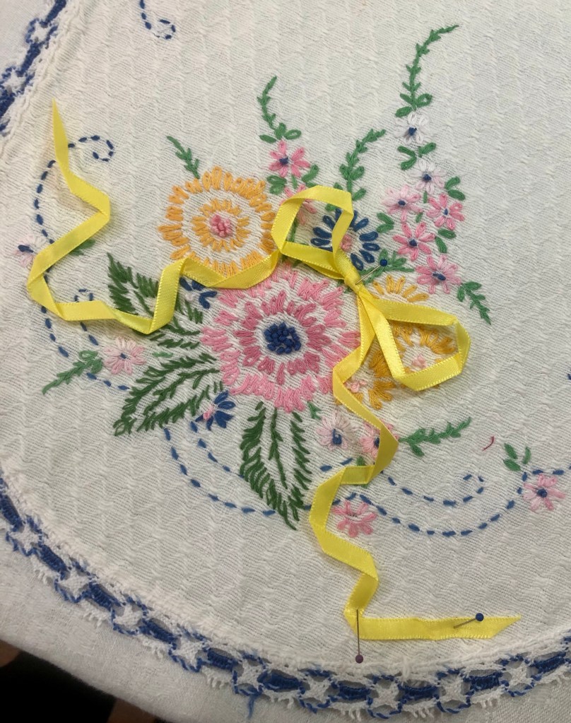 I am using new 1/4” Offray brand satin finished ribbon.Cut the ribbon ends to a sharp angle to prevent unraveling.For this example I am using a length of ribbon about 18” long. Lay it out on a flat surface with the left side about 4” longer than the right side. Squeeze a bit at the top, this will mark the center for creating the loops to make your bow.I am working on a padded surface, my wool pressing mat covered with a white damask napkin. Why? The napkin looks better for the photography, the pressing mat lets me pin with ease.Place a straight pin down through the center of the bow. Do a bit of ribbon manipulating to create some “character” for your bow loops. Pin as you go in order to retain the bends and folds.Once one side has been pined, start on the remaining loop and process in the same fashion as above.Ready to start on the right side streamer? Gently pull the left streamer up out of the way.Begin arranging the streamer by bending, twisting etc. to achieve a pleasing appearance. Work your way down the streamer, pinning as you go.Once you have finished the right streamer, move to the left streamer and repeat.Remember my good friend Spray Starch? Once you have your ribbon bow arranged and pinned to your liking, give it a healthy spray!Let it sit for a few minutes. This will allow for the spray to soak into the bends and folds of the ribbon fibers.Using my dry iron, I started at the bottom of the right side streamer and slowly pressed my way up to the bow.Working up the left streamer, I remove the straight pins as needed.Once I have pressed creases into my ribbon, I carefully left it from the pressing cloth.And gently place it onto the vintage linen. It will generally hold its new shape but it is easily further manipulated if necessary.Another example of where it could be places on the embroidered piece.If this were my final placement, I would very carefully use either Elmer’s Washable White School Glue and a dry iron to affix the ribbon to my vintage linen or I could pin the ribbon in place. Whatever method I used, my personal next step would be to machine stitch the ribbon permanently to the embroidery using a matching needle thread. Your choice might be to hand stitch the ribbon in place.