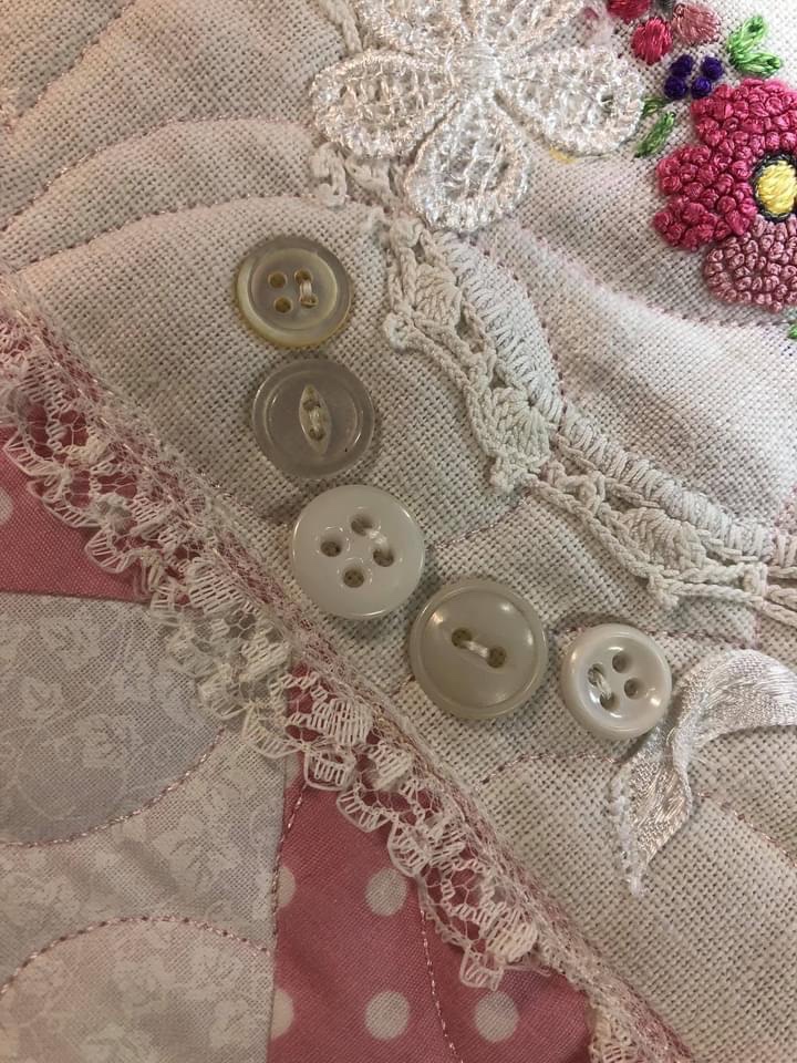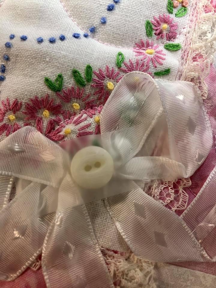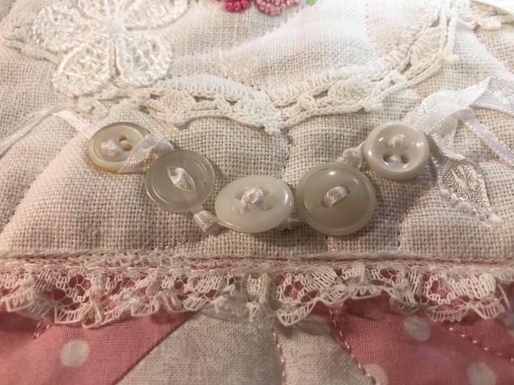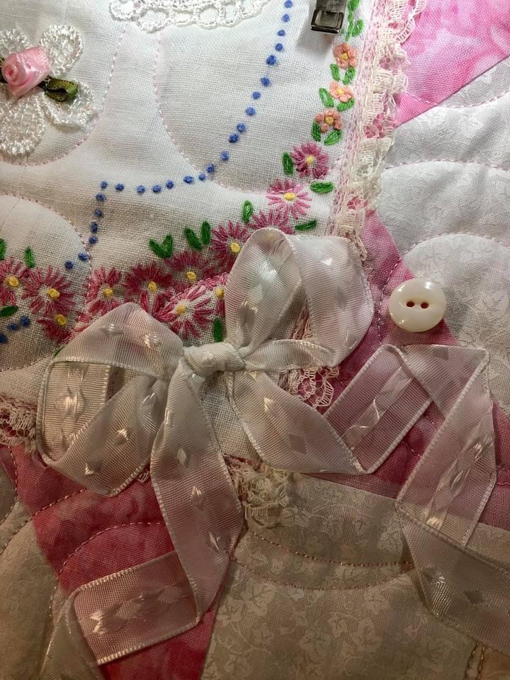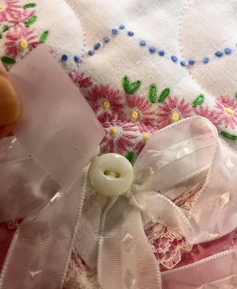 Let’s spend a little time and talk about how ribbons and buttons work so well together when embellishing vintage linens. Once again I am going to use the picture captions to give you step by step instruction about how I approach adding them to this pink and white Vintage Lattice Stars quilt.